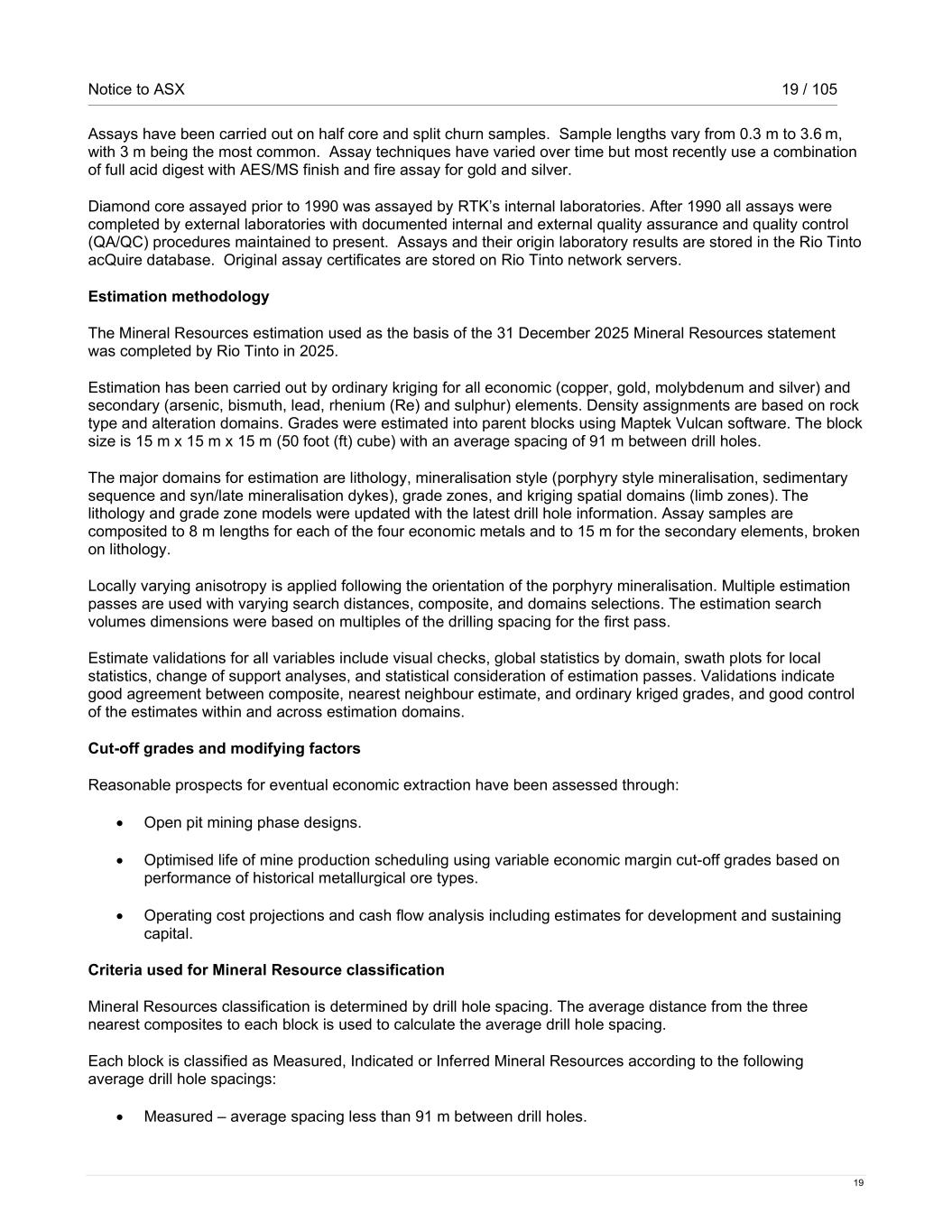 Notice to ASX 19 / 105 19 Assays have been carried out on half core and split churn samples. Sample lengths vary from 0.3 m to 3.6 m, with 3 m being the most common. Assay techniques have varied over time but most recently use a combination of full acid digest with AES/MS finish and fire assay for gold and silver. Diamond core assayed prior to 1990 was assayed by RTK’s internal laboratories. After 1990 all assays were completed by external laboratories with documented internal and external quality assurance and quality control (QA/QC) procedures maintained to present. Assays and their origin laboratory results are stored in the Rio Tinto acQuire database. Original assay certificates are stored on Rio Tinto network servers. Estimation methodology The Mineral Resources estimation used as the basis of the 31 December 2025 Mineral Resources statement was completed by Rio Tinto in 2025. Estimation has been carried out by ordinary kriging for all economic (copper, gold, molybdenum and silver) and secondary (arsenic, bismuth, lead, rhenium (Re) and sulphur) elements. Density assignments are based on rock type and alteration domains. Grades were estimated into parent blocks using Maptek Vulcan software. The block size is 15 m x 15 m x 15 m (50 foot (ft) cube) with an average spacing of 91 m between drill holes. The major domains for estimation are lithology, mineralisation style (porphyry style mineralisation, sedimentary sequence and syn/late mineralisation dykes), grade zones, and kriging spatial domains (limb zones). The lithology and grade zone models were updated with the latest drill hole information. Assay samples are composited to 8 m lengths for each of the four economic metals and to 15 m for the secondary elements, broken on lithology.  Locally varying anisotropy is applied following the orientation of the porphyry mineralisation. Multiple estimation passes are used with varying search distances, composite, and domains selections. The estimation search volumes dimensions were based on multiples of the drilling spacing for the first pass. Estimate validations for all variables include visual checks, global statistics by domain, swath plots for local statistics, change of support analyses, and statistical consideration of estimation passes. Validations indicate good agreement between composite, nearest neighbour estimate, and ordinary kriged grades, and good control of the estimates within and across estimation domains. Cut-off grades and modifying factors Reasonable prospects for eventual economic extraction have been assessed through: • Open pit mining phase designs. • Optimised life of mine production scheduling using variable economic margin cut-off grades based on performance of historical metallurgical ore types. • Operating cost projections and cash flow analysis including estimates for development and sustaining capital. Criteria used for Mineral Resource classification Mineral Resources classification is determined by drill hole spacing. The average distance from the three nearest composites to each block is used to calculate the average drill hole spacing. Each block is classified as Measured, Indicated or Inferred Mineral Resources according to the following average drill hole spacings: • Measured – average spacing less than 91 m between drill holes.