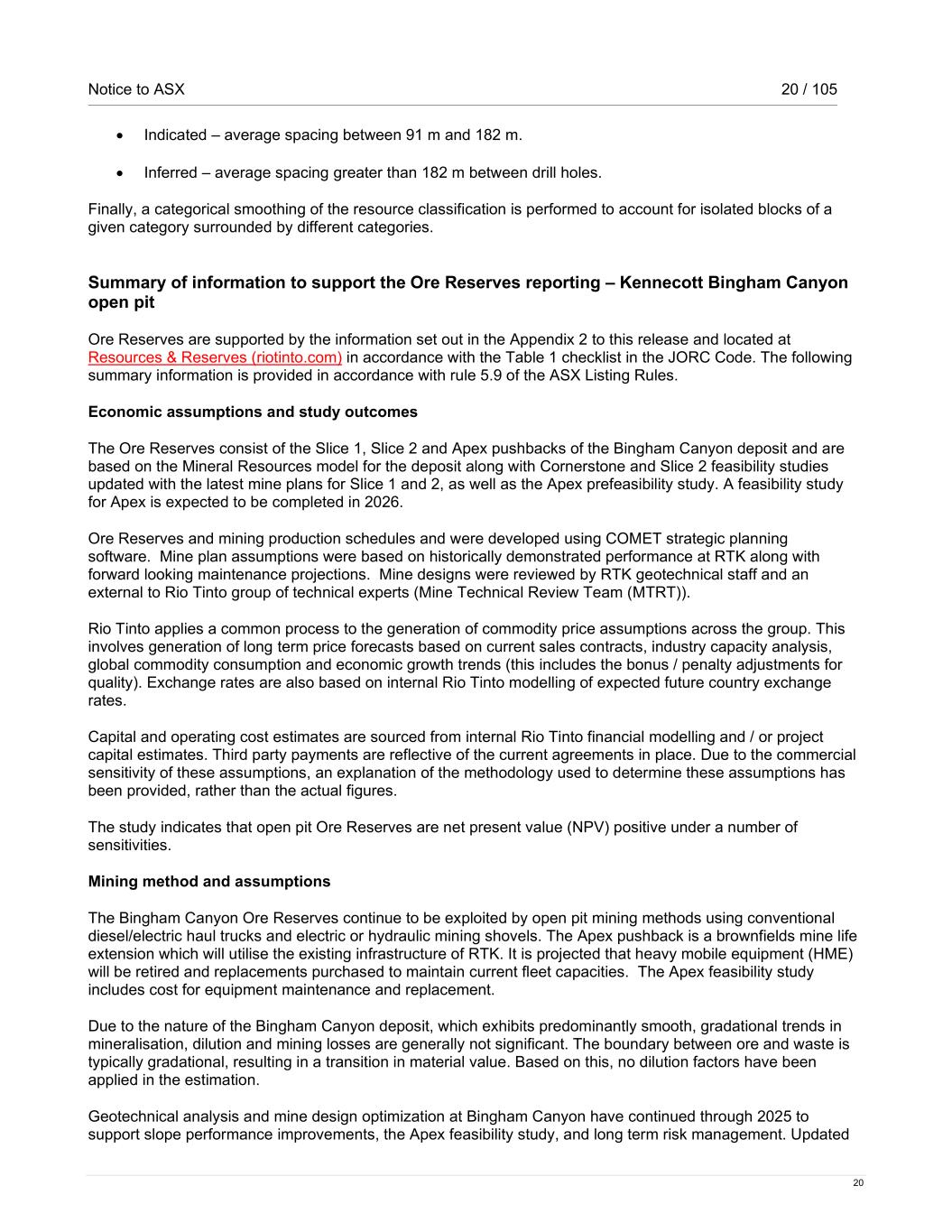 Notice to ASX 20 / 105 20 • Indicated – average spacing between 91 m and 182 m. • Inferred – average spacing greater than 182 m between drill holes. Finally, a categorical smoothing of the resource classification is performed to account for isolated blocks of a given category surrounded by different categories. Summary of information to support the Ore Reserves reporting – Kennecott Bingham Canyon open pit Ore Reserves are supported by the information set out in the Appendix 2 to this release and located at Resources & Reserves (riotinto.com) in accordance with the Table 1 checklist in the JORC Code. The following summary information is provided in accordance with rule 5.9 of the ASX Listing Rules. Economic assumptions and study outcomes The Ore Reserves consist of the Slice 1, Slice 2 and Apex pushbacks of the Bingham Canyon deposit and are based on the Mineral Resources model for the deposit along with Cornerstone and Slice 2 feasibility studies updated with the latest mine plans for Slice 1 and 2, as well as the Apex prefeasibility study. A feasibility study for Apex is expected to be completed in 2026. Ore Reserves and mining production schedules and were developed using COMET strategic planning software. Mine plan assumptions were based on historically demonstrated performance at RTK along with forward looking maintenance projections. Mine designs were reviewed by RTK geotechnical staff and an external to Rio Tinto group of technical experts (Mine Technical Review Team (MTRT)). Rio Tinto applies a common process to the generation of commodity price assumptions across the group. This involves generation of long term price forecasts based on current sales contracts, industry capacity analysis, global commodity consumption and economic growth trends (this includes the bonus / penalty adjustments for quality). Exchange rates are also based on internal Rio Tinto modelling of expected future country exchange rates. Capital and operating cost estimates are sourced from internal Rio Tinto financial modelling and / or project capital estimates. Third party payments are reflective of the current agreements in place. Due to the commercial sensitivity of these assumptions, an explanation of the methodology used to determine these assumptions has been provided, rather than the actual figures. The study indicates that open pit Ore Reserves are net present value (NPV) positive under a number of sensitivities. Mining method and assumptions The Bingham Canyon Ore Reserves continue to be exploited by open pit mining methods using conventional diesel/electric haul trucks and electric or hydraulic mining shovels. The Apex pushback is a brownfields mine life extension which will utilise the existing infrastructure of RTK. It is projected that heavy mobile equipment (HME) will be retired and replacements purchased to maintain current fleet capacities. The Apex feasibility study includes cost for equipment maintenance and replacement. Due to the nature of the Bingham Canyon deposit, which exhibits predominantly smooth, gradational trends in mineralisation, dilution and mining losses are generally not significant. The boundary between ore and waste is typically gradational, resulting in a transition in material value. Based on this, no dilution factors have been applied in the estimation. Geotechnical analysis and mine design optimization at Bingham Canyon have continued through 2025 to support slope performance improvements, the Apex feasibility study, and long term risk management. Updated