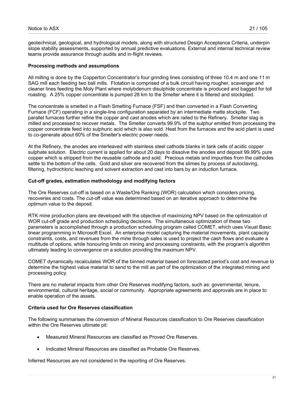 Notice to ASX 21 / 105 21 geotechnical, geological, and hydrological models, along with structured Design Acceptance Criteria, underpin slope stability assessments, supported by annual predictive evaluations. External and internal technical review teams provide assurance through audits and in-flight reviews. Processing methods and assumptions All milling is done by the Copperton Concentrator’s four grinding lines consisting of three 10.4 m and one 11 m SAG mill each feeding two ball mills. Flotation is comprised of a bulk circuit having rougher, scavenger and cleaner lines feeding the Moly Plant where molybdenum disulphide concentrate is produced and bagged for toll roasting. A 25% copper concentrate is pumped 28 km to the Smelter where it is filtered and stockpiled. The concentrate is smelted in a Flash Smelting Furnace (FSF) and then converted in a Flash Converting Furnace (FCF) operating in a single-line configuration separated by an intermediate matte stockpile. Two parallel furnaces further refine the copper and cast anodes which are railed to the Refinery. Smelter slag is milled and processed to recover metals. The Smelter converts 99.9% of the sulphur emitted from processing the copper concentrate feed into sulphuric acid which is also sold. Heat from the furnaces and the acid plant is used to co-generate about 60% of the Smelter's electric power needs. At the Refinery, the anodes are interleaved with stainless steel cathode blanks in tank cells of acidic copper sulphate solution. Electric current is applied for about 20 days to dissolve the anodes and deposit 99.99% pure copper which is stripped from the reusable cathode and sold. Precious metals and impurities from the cathodes settle to the bottom of the cells. Gold and silver are recovered from the slimes by process of autoclaving, filtering, hydrochloric leaching and solvent extraction and cast into bars by an induction furnace. Cut-off grades, estimation methodology and modifying factors The Ore Reserves cut-off is based on a Waste/Ore Ranking (WOR) calculation which considers pricing, recoveries and costs. The cut-off value was determined based on an iterative approach to determine the optimum value to the deposit. RTK mine production plans are developed with the objective of maximizing NPV based on the optimization of WOR cut-off grade and production scheduling decisions. The simultaneous optimization of these two parameters is accomplished through a production scheduling program called COMET, which uses Visual Basic linear programming in Microsoft Excel. An enterprise model capturing the material movements, plant capacity constraints, costs, and revenues from the mine through sales is used to project the cash flows and evaluate a multitude of options, while honouring limits on mining and processing constraints, with the program’s algorithm ultimately leading to convergence on a solution providing the maximum NPV. COMET dynamically recalculates WOR of the binned material based on forecasted period’s cost and revenue to determine the highest value material to send to the mill as part of the optimization of the integrated mining and processing policy. There are no material impacts from other Ore Reserves modifying factors, such as: governmental, tenure, environmental, cultural heritage, social or community. Appropriate agreements and approvals are in place to enable operation of the assets. Criteria used for Ore Reserves classification The following summarises the conversion of Mineral Resources classification to Ore Reserves classification within the Ore Reserves ultimate pit: • Measured Mineral Resources are classified as Proved Ore Reserves. • Indicated Mineral Resources are classified as Probable Ore Reserves. Inferred Resources are not considered in the reporting of Ore Reserves.