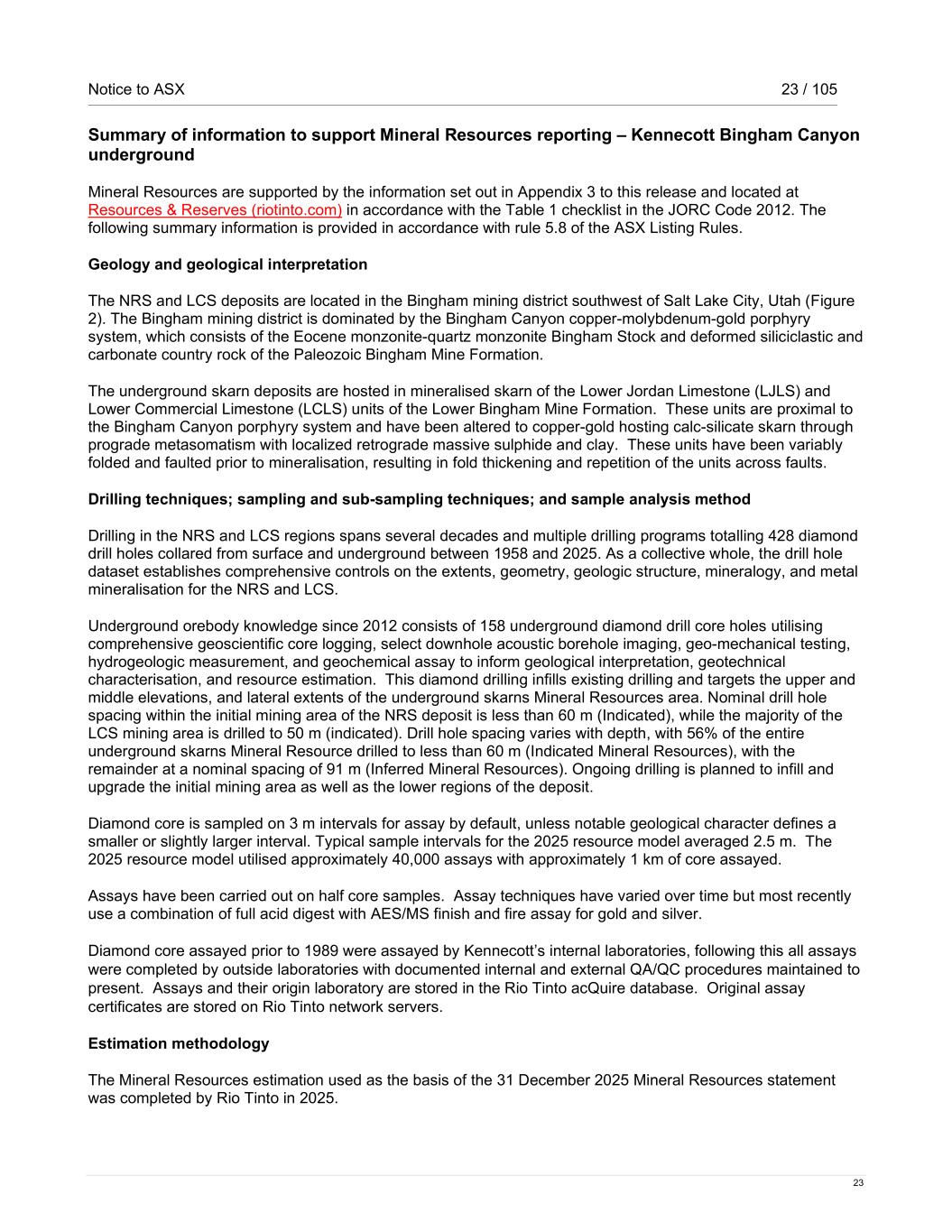 Notice to ASX 23 / 105 23 Summary of information to support Mineral Resources reporting – Kennecott Bingham Canyon underground Mineral Resources are supported by the information set out in Appendix 3 to this release and located at Resources & Reserves (riotinto.com) in accordance with the Table 1 checklist in the JORC Code 2012. The following summary information is provided in accordance with rule 5.8 of the ASX Listing Rules. Geology and geological interpretation The NRS and LCS deposits are located in the Bingham mining district southwest of Salt Lake City, Utah (Figure 2). The Bingham mining district is dominated by the Bingham Canyon copper-molybdenum-gold porphyry system, which consists of the Eocene monzonite-quartz monzonite Bingham Stock and deformed siliciclastic and carbonate country rock of the Paleozoic Bingham Mine Formation. The underground skarn deposits are hosted in mineralised skarn of the Lower Jordan Limestone (LJLS) and Lower Commercial Limestone (LCLS) units of the Lower Bingham Mine Formation. These units are proximal to the Bingham Canyon porphyry system and have been altered to copper-gold hosting calc-silicate skarn through prograde metasomatism with localized retrograde massive sulphide and clay. These units have been variably folded and faulted prior to mineralisation, resulting in fold thickening and repetition of the units across faults. Drilling techniques; sampling and sub-sampling techniques; and sample analysis method Drilling in the NRS and LCS regions spans several decades and multiple drilling programs totalling 428 diamond drill holes collared from surface and underground between 1958 and 2025. As a collective whole, the drill hole dataset establishes comprehensive controls on the extents, geometry, geologic structure, mineralogy, and metal mineralisation for the NRS and LCS. Underground orebody knowledge since 2012 consists of 158 underground diamond drill core holes utilising comprehensive geoscientific core logging, select downhole acoustic borehole imaging, geo-mechanical testing, hydrogeologic measurement, and geochemical assay to inform geological interpretation, geotechnical characterisation, and resource estimation. This diamond drilling infills existing drilling and targets the upper and middle elevations, and lateral extents of the underground skarns Mineral Resources area. Nominal drill hole spacing within the initial mining area of the NRS deposit is less than 60 m (Indicated), while the majority of the LCS mining area is drilled to 50 m (indicated). Drill hole spacing varies with depth, with 56% of the entire underground skarns Mineral Resource drilled to less than 60 m (Indicated Mineral Resources), with the remainder at a nominal spacing of 91 m (Inferred Mineral Resources). Ongoing drilling is planned to infill and upgrade the initial mining area as well as the lower regions of the deposit. Diamond core is sampled on 3 m intervals for assay by default, unless notable geological character defines a smaller or slightly larger interval. Typical sample intervals for the 2025 resource model averaged 2.5 m. The 2025 resource model utilised approximately 40,000 assays with approximately 1 km of core assayed. Assays have been carried out on half core samples. Assay techniques have varied over time but most recently use a combination of full acid digest with AES/MS finish and fire assay for gold and silver. Diamond core assayed prior to 1989 were assayed by Kennecott’s internal laboratories, following this all assays were completed by outside laboratories with documented internal and external QA/QC procedures maintained to present. Assays and their origin laboratory are stored in the Rio Tinto acQuire database. Original assay certificates are stored on Rio Tinto network servers. Estimation methodology The Mineral Resources estimation used as the basis of the 31 December 2025 Mineral Resources statement was completed by Rio Tinto in 2025.