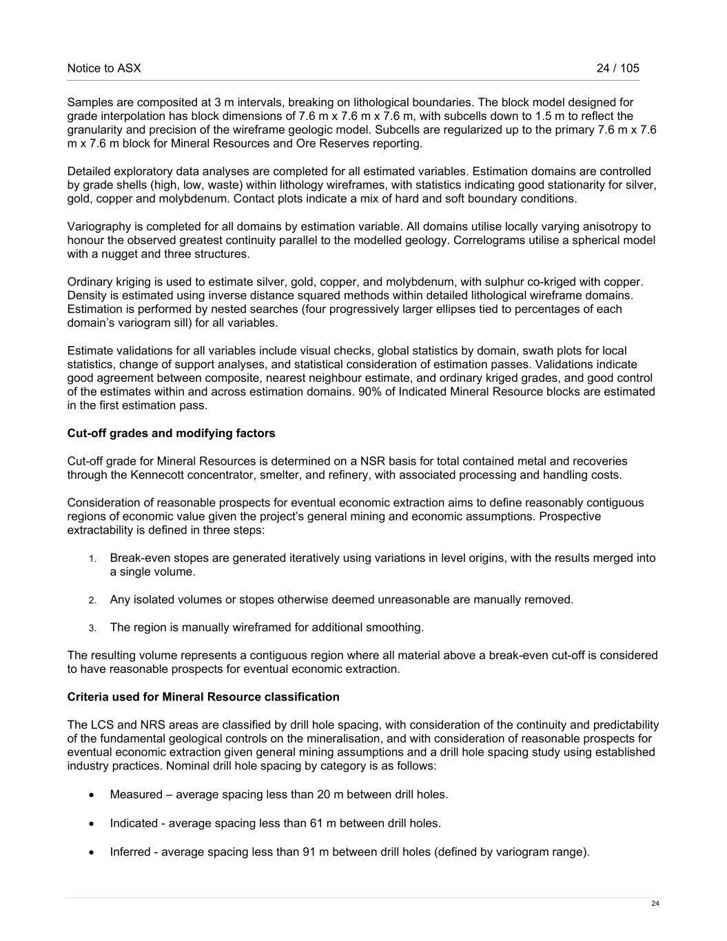 Notice to ASX 24 / 105 24 Samples are composited at 3 m intervals, breaking on lithological boundaries. The block model designed for grade interpolation has block dimensions of 7.6 m x 7.6 m x 7.6 m, with subcells down to 1.5 m to reflect the granularity and precision of the wireframe geologic model. Subcells are regularized up to the primary 7.6 m x 7.6 m x 7.6 m block for Mineral Resources and Ore Reserves reporting. Detailed exploratory data analyses are completed for all estimated variables. Estimation domains are controlled by grade shells (high, low, waste) within lithology wireframes, with statistics indicating good stationarity for silver, gold, copper and molybdenum. Contact plots indicate a mix of hard and soft boundary conditions. Variography is completed for all domains by estimation variable. All domains utilise locally varying anisotropy to honour the observed greatest continuity parallel to the modelled geology. Correlograms utilise a spherical model with a nugget and three structures. Ordinary kriging is used to estimate silver, gold, copper, and molybdenum, with sulphur co-kriged with copper. Density is estimated using inverse distance squared methods within detailed lithological wireframe domains. Estimation is performed by nested searches (four progressively larger ellipses tied to percentages of each domain’s variogram sill) for all variables. Estimate validations for all variables include visual checks, global statistics by domain, swath plots for local statistics, change of support analyses, and statistical consideration of estimation passes. Validations indicate good agreement between composite, nearest neighbour estimate, and ordinary kriged grades, and good control of the estimates within and across estimation domains. 90% of Indicated Mineral Resource blocks are estimated in the first estimation pass. Cut-off grades and modifying factors Cut-off grade for Mineral Resources is determined on a NSR basis for total contained metal and recoveries through the Kennecott concentrator, smelter, and refinery, with associated processing and handling costs. Consideration of reasonable prospects for eventual economic extraction aims to define reasonably contiguous regions of economic value given the project’s general mining and economic assumptions. Prospective extractability is defined in three steps: 1. Break-even stopes are generated iteratively using variations in level origins, with the results merged into a single volume. 2. Any isolated volumes or stopes otherwise deemed unreasonable are manually removed. 3. The region is manually wireframed for additional smoothing. The resulting volume represents a contiguous region where all material above a break-even cut-off is considered to have reasonable prospects for eventual economic extraction. Criteria used for Mineral Resource classification The LCS and NRS areas are classified by drill hole spacing, with consideration of the continuity and predictability of the fundamental geological controls on the mineralisation, and with consideration of reasonable prospects for eventual economic extraction given general mining assumptions and a drill hole spacing study using established industry practices. Nominal drill hole spacing by category is as follows: • Measured – average spacing less than 20 m between drill holes. • Indicated - average spacing less than 61 m between drill holes. • Inferred - average spacing less than 91 m between drill holes (defined by variogram range).