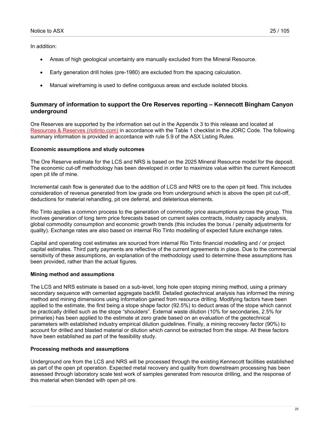 Notice to ASX 25 / 105 25 In addition: • Areas of high geological uncertainty are manually excluded from the Mineral Resource. • Early generation drill holes (pre-1980) are excluded from the spacing calculation. • Manual wireframing is used to define contiguous areas and exclude isolated blocks. Summary of information to support the Ore Reserves reporting – Kennecott Bingham Canyon underground Ore Reserves are supported by the information set out in the Appendix 3 to this release and located at Resources & Reserves (riotinto.com) in accordance with the Table 1 checklist in the JORC Code. The following summary information is provided in accordance with rule 5.9 of the ASX Listing Rules. Economic assumptions and study outcomes The Ore Reserve estimate for the LCS and NRS is based on the 2025 Mineral Resource model for the deposit. The economic cut-off methodology has been developed in order to maximize value within the current Kennecott open pit life of mine. Incremental cash flow is generated due to the addition of LCS and NRS ore to the open pit feed. This includes consideration of revenue generated from low grade ore from underground which is above the open pit cut-off, deductions for material rehandling, pit ore deferral, and deleterious elements. Rio Tinto applies a common process to the generation of commodity price assumptions across the group. This involves generation of long term price forecasts based on current sales contracts, industry capacity analysis, global commodity consumption and economic growth trends (this includes the bonus / penalty adjustments for quality). Exchange rates are also based on internal Rio Tinto modelling of expected future exchange rates. Capital and operating cost estimates are sourced from internal Rio Tinto financial modelling and / or project capital estimates. Third party payments are reflective of the current agreements in place. Due to the commercial sensitivity of these assumptions, an explanation of the methodology used to determine these assumptions has been provided, rather than the actual figures. Mining method and assumptions The LCS and NRS estimate is based on a sub-level, long hole open stoping mining method, using a primary secondary sequence with cemented aggregate backfill. Detailed geotechnical analysis has informed the mining method and mining dimensions using information gained from resource drilling. Modifying factors have been applied to the estimate, the first being a stope shape factor (92.5%) to deduct areas of the stope which cannot be practically drilled such as the stope “shoulders”. External waste dilution (10% for secondaries, 2.5% for primaries) has been applied to the estimate at zero grade based on an evaluation of the geotechnical parameters with established industry empirical dilution guidelines. Finally, a mining recovery factor (90%) to account for drilled and blasted material or dilution which cannot be extracted from the stope. All these factors have been established as part of the feasibility study. Processing methods and assumptions Underground ore from the LCS and NRS will be processed through the existing Kennecott facilities established as part of the open pit operation. Expected metal recovery and quality from downstream processing has been assessed through laboratory scale test work of samples generated from resource drilling, and the response of this material when blended with open pit ore.