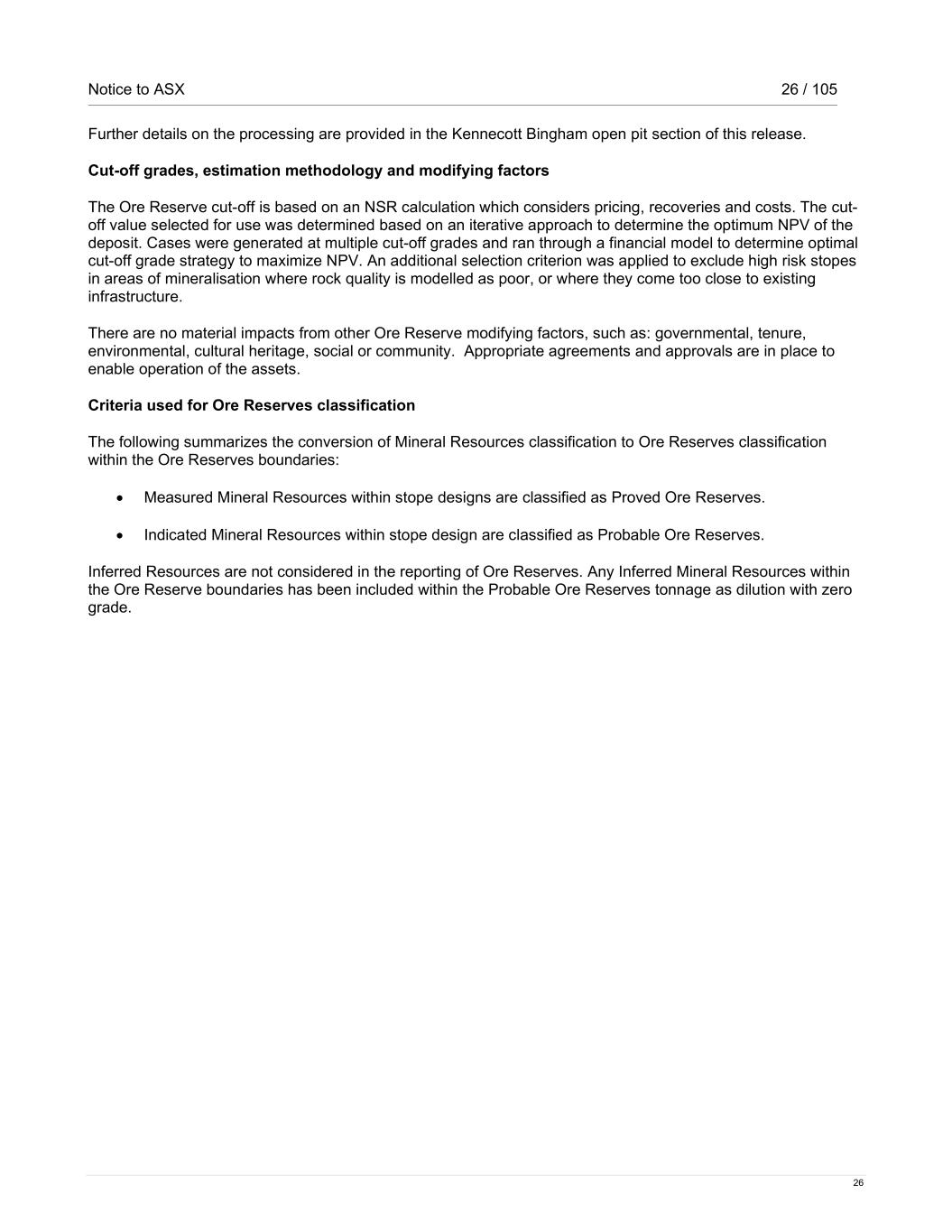 Notice to ASX 26 / 105 26 Further details on the processing are provided in the Kennecott Bingham open pit section of this release. Cut-off grades, estimation methodology and modifying factors The Ore Reserve cut-off is based on an NSR calculation which considers pricing, recoveries and costs. The cut- off value selected for use was determined based on an iterative approach to determine the optimum NPV of the deposit. Cases were generated at multiple cut-off grades and ran through a financial model to determine optimal cut-off grade strategy to maximize NPV. An additional selection criterion was applied to exclude high risk stopes in areas of mineralisation where rock quality is modelled as poor, or where they come too close to existing infrastructure. There are no material impacts from other Ore Reserve modifying factors, such as: governmental, tenure, environmental, cultural heritage, social or community. Appropriate agreements and approvals are in place to enable operation of the assets. Criteria used for Ore Reserves classification The following summarizes the conversion of Mineral Resources classification to Ore Reserves classification within the Ore Reserves boundaries: • Measured Mineral Resources within stope designs are classified as Proved Ore Reserves. • Indicated Mineral Resources within stope design are classified as Probable Ore Reserves. Inferred Resources are not considered in the reporting of Ore Reserves. Any Inferred Mineral Resources within the Ore Reserve boundaries has been included within the Probable Ore Reserves tonnage as dilution with zero grade.