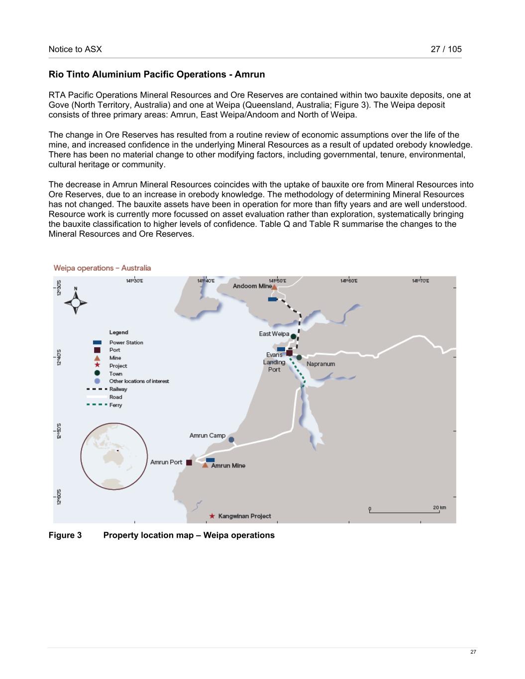 Notice to ASX 27 / 105 27 Rio Tinto Aluminium Pacific Operations - Amrun RTA Pacific Operations Mineral Resources and Ore Reserves are contained within two bauxite deposits, one at Gove (North Territory, Australia) and one at Weipa (Queensland, Australia; Figure 3). The Weipa deposit consists of three primary areas: Amrun, East Weipa/Andoom and North of Weipa. The change in Ore Reserves has resulted from a routine review of economic assumptions over the life of the mine, and increased confidence in the underlying Mineral Resources as a result of updated orebody knowledge. There has been no material change to other modifying factors, including governmental, tenure, environmental, cultural heritage or community. The decrease in Amrun Mineral Resources coincides with the uptake of bauxite ore from Mineral Resources into Ore Reserves, due to an increase in orebody knowledge. The methodology of determining Mineral Resources has not changed. The bauxite assets have been in operation for more than fifty years and are well understood. Resource work is currently more focussed on asset evaluation rather than exploration, systematically bringing the bauxite classification to higher levels of confidence. Table Q and Table R summarise the changes to the Mineral Resources and Ore Reserves. Figure 3 Property location map – Weipa operations