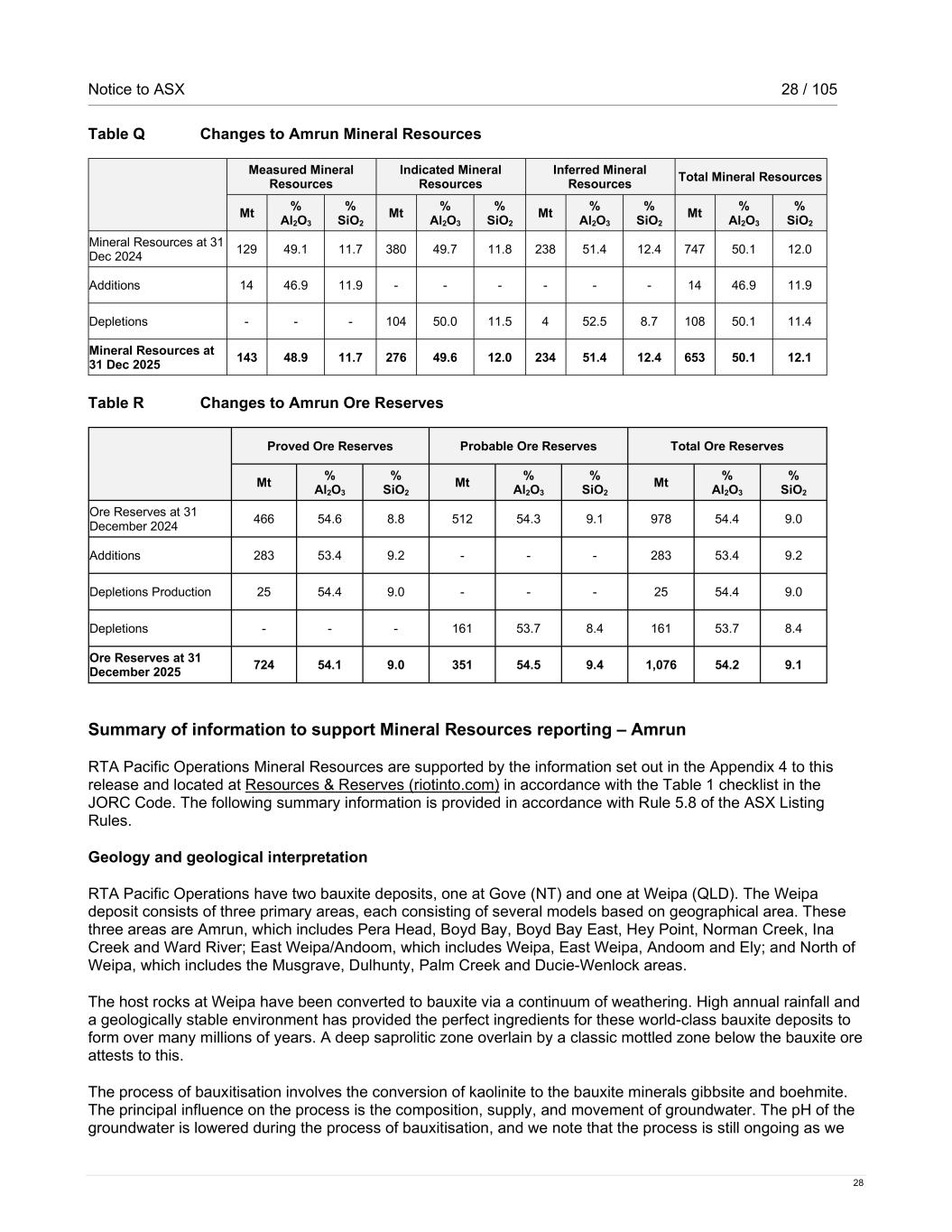 Notice to ASX 28 / 105 28 Table Q Changes to Amrun Mineral Resources Measured Mineral Resources Indicated Mineral Resources Inferred Mineral Resources Total Mineral Resources Mt % Al2O3 % SiO2 Mt % Al2O3 % SiO2 Mt % Al2O3 % SiO2 Mt % Al2O3 % SiO2 Mineral Resources at 31 Dec 2024 129 49.1 11.7 380 49.7 11.8 238 51.4 12.4 747 50.1 12.0 Additions 14 46.9 11.9 - - - - - - 14 46.9 11.9 Depletions - - - 104 50.0 11.5 4 52.5 8.7 108 50.1 11.4 Mineral Resources at 31 Dec 2025 143 48.9 11.7 276 49.6 12.0 234 51.4 12.4 653 50.1 12.1 Table R Changes to Amrun Ore Reserves Proved Ore Reserves Probable Ore Reserves Total Ore Reserves Mt % Al2O3 % SiO2 Mt % Al2O3 % SiO2 Mt % Al2O3 % SiO2 Ore Reserves at 31 December 2024 466 54.6 8.8 512 54.3 9.1 978 54.4 9.0 Additions 283 53.4 9.2 - - - 283 53.4 9.2 Depletions Production 25 54.4 9.0 - - - 25 54.4 9.0 Depletions - - - 161 53.7 8.4 161 53.7 8.4 Ore Reserves at 31 December 2025 724 54.1 9.0 351 54.5 9.4 1,076 54.2 9.1 Summary of information to support Mineral Resources reporting – Amrun RTA Pacific Operations Mineral Resources are supported by the information set out in the Appendix 4 to this release and located at Resources & Reserves (riotinto.com) in accordance with the Table 1 checklist in the JORC Code. The following summary information is provided in accordance with Rule 5.8 of the ASX Listing Rules. Geology and geological interpretation RTA Pacific Operations have two bauxite deposits, one at Gove (NT) and one at Weipa (QLD). The Weipa deposit consists of three primary areas, each consisting of several models based on geographical area. These three areas are Amrun, which includes Pera Head, Boyd Bay, Boyd Bay East, Hey Point, Norman Creek, Ina Creek and Ward River; East Weipa/Andoom, which includes Weipa, East Weipa, Andoom and Ely; and North of Weipa, which includes the Musgrave, Dulhunty, Palm Creek and Ducie-Wenlock areas. The host rocks at Weipa have been converted to bauxite via a continuum of weathering. High annual rainfall and a geologically stable environment has provided the perfect ingredients for these world-class bauxite deposits to form over many millions of years. A deep saprolitic zone overlain by a classic mottled zone below the bauxite ore attests to this. The process of bauxitisation involves the conversion of kaolinite to the bauxite minerals gibbsite and boehmite. The principal influence on the process is the composition, supply, and movement of groundwater. The pH of the groundwater is lowered during the process of bauxitisation, and we note that the process is still ongoing as we