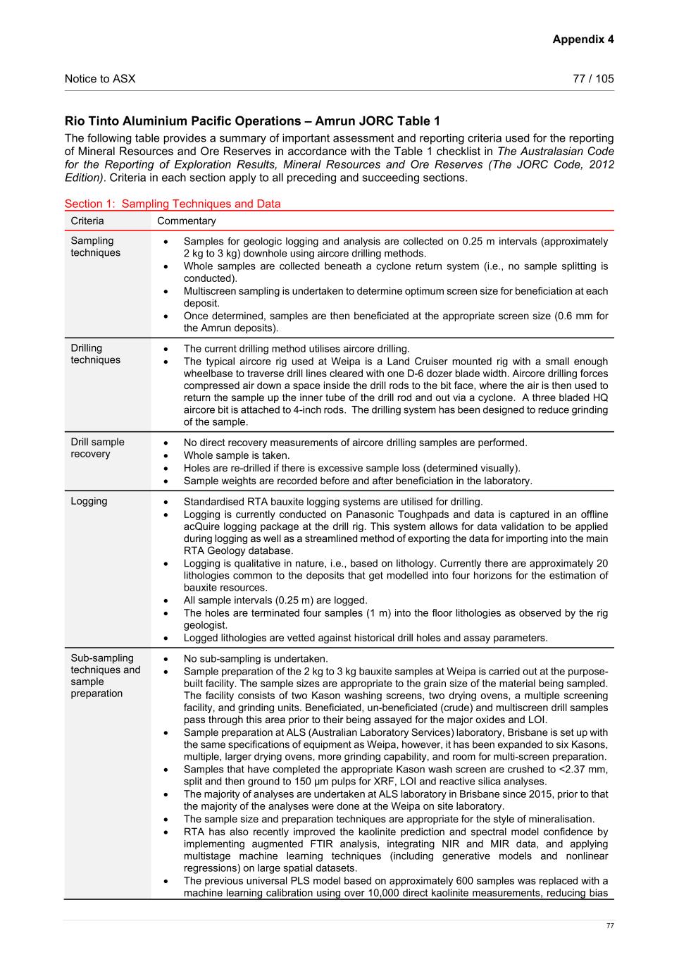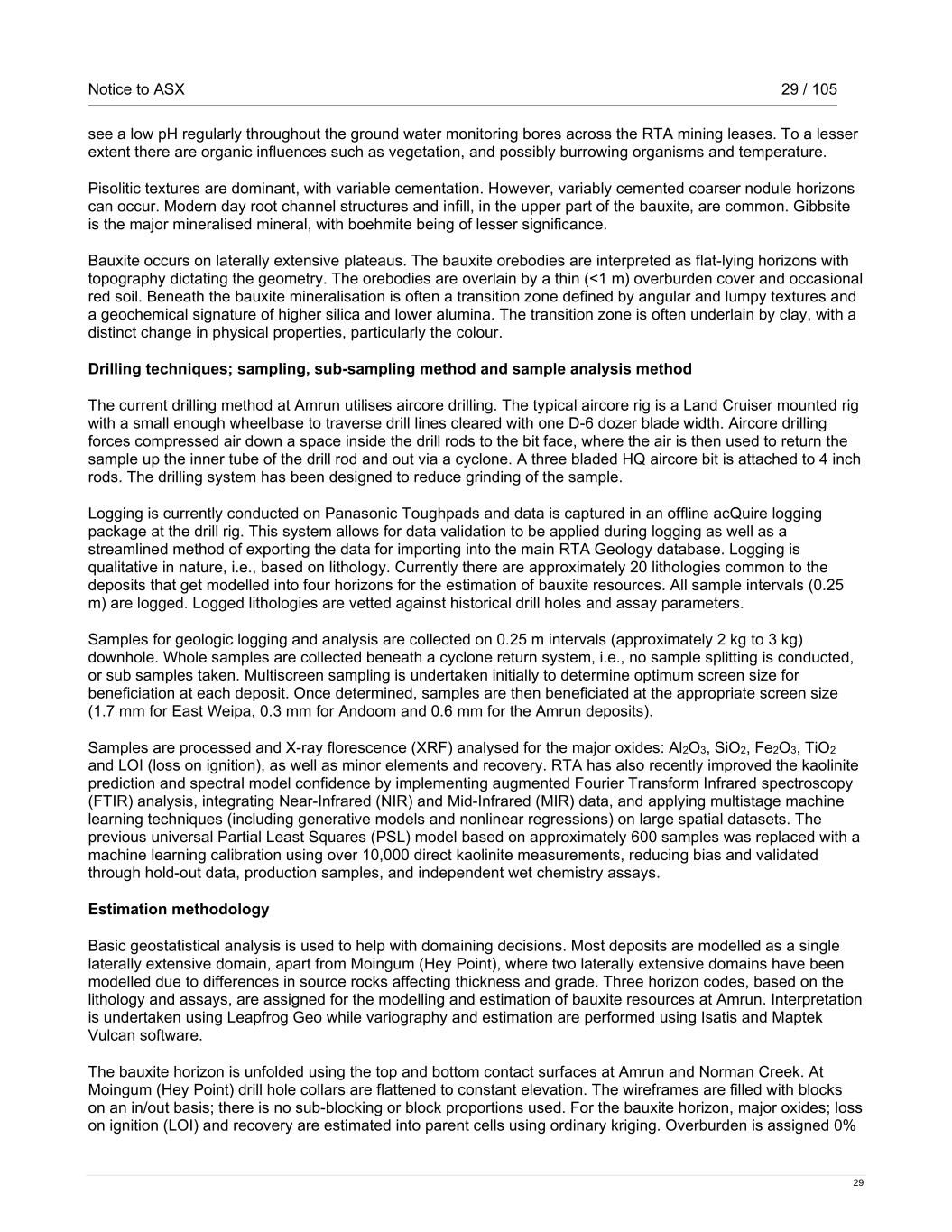 Notice to ASX 29 / 105 29 see a low pH regularly throughout the ground water monitoring bores across the RTA mining leases. To a lesser extent there are organic influences such as vegetation, and possibly burrowing organisms and temperature. Pisolitic textures are dominant, with variable cementation. However, variably cemented coarser nodule horizons can occur. Modern day root channel structures and infill, in the upper part of the bauxite, are common. Gibbsite is the major mineralised mineral, with boehmite being of lesser significance. Bauxite occurs on laterally extensive plateaus. The bauxite orebodies are interpreted as flat-lying horizons with topography dictating the geometry. The orebodies are overlain by a thin (<1 m) overburden cover and occasional red soil. Beneath the bauxite mineralisation is often a transition zone defined by angular and lumpy textures and a geochemical signature of higher silica and lower alumina. The transition zone is often underlain by clay, with a distinct change in physical properties, particularly the colour. Drilling techniques; sampling, sub-sampling method and sample analysis method The current drilling method at Amrun utilises aircore drilling. The typical aircore rig is a Land Cruiser mounted rig with a small enough wheelbase to traverse drill lines cleared with one D-6 dozer blade width. Aircore drilling forces compressed air down a space inside the drill rods to the bit face, where the air is then used to return the sample up the inner tube of the drill rod and out via a cyclone. A three bladed HQ aircore bit is attached to 4 inch rods. The drilling system has been designed to reduce grinding of the sample. Logging is currently conducted on Panasonic Toughpads and data is captured in an offline acQuire logging package at the drill rig. This system allows for data validation to be applied during logging as well as a streamlined method of exporting the data for importing into the main RTA Geology database. Logging is qualitative in nature, i.e., based on lithology. Currently there are approximately 20 lithologies common to the deposits that get modelled into four horizons for the estimation of bauxite resources. All sample intervals (0.25 m) are logged. Logged lithologies are vetted against historical drill holes and assay parameters. Samples for geologic logging and analysis are collected on 0.25 m intervals (approximately 2 kg to 3 kg) downhole. Whole samples are collected beneath a cyclone return system, i.e., no sample splitting is conducted, or sub samples taken. Multiscreen sampling is undertaken initially to determine optimum screen size for beneficiation at each deposit. Once determined, samples are then beneficiated at the appropriate screen size (1.7 mm for East Weipa, 0.3 mm for Andoom and 0.6 mm for the Amrun deposits). Samples are processed and X-ray florescence (XRF) analysed for the major oxides: Al2O3, SiO2, Fe2O3, TiO2 and LOI (loss on ignition), as well as minor elements and recovery. RTA has also recently improved the kaolinite prediction and spectral model confidence by implementing augmented Fourier Transform Infrared spectroscopy (FTIR) analysis, integrating Near-Infrared (NIR) and Mid-Infrared (MIR) data, and applying multistage machine learning techniques (including generative models and nonlinear regressions) on large spatial datasets. The previous universal Partial Least Squares (PSL) model based on approximately 600 samples was replaced with a machine learning calibration using over 10,000 direct kaolinite measurements, reducing bias and validated through hold-out data, production samples, and independent wet chemistry assays. Estimation methodology Basic geostatistical analysis is used to help with domaining decisions. Most deposits are modelled as a single laterally extensive domain, apart from Moingum (Hey Point), where two laterally extensive domains have been modelled due to differences in source rocks affecting thickness and grade. Three horizon codes, based on the lithology and assays, are assigned for the modelling and estimation of bauxite resources at Amrun. Interpretation is undertaken using Leapfrog Geo while variography and estimation are performed using Isatis and Maptek Vulcan software. The bauxite horizon is unfolded using the top and bottom contact surfaces at Amrun and Norman Creek. At Moingum (Hey Point) drill hole collars are flattened to constant elevation. The wireframes are filled with blocks on an in/out basis; there is no sub-blocking or block proportions used. For the bauxite horizon, major oxides; loss on ignition (LOI) and recovery are estimated into parent cells using ordinary kriging. Overburden is assigned 0%