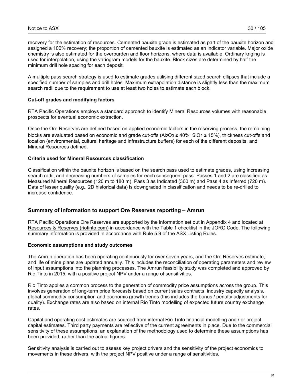 Notice to ASX 30 / 105 30 recovery for the estimation of resources. Cemented bauxite grade is estimated as part of the bauxite horizon and assigned a 100% recovery; the proportion of cemented bauxite is estimated as an indicator variable. Major oxide chemistry is also estimated for the overburden and floor horizons, where data is available. Ordinary kriging is used for interpolation, using the variogram models for the bauxite. Block sizes are determined by half the minimum drill hole spacing for each deposit. A multiple pass search strategy is used to estimate grades utilising different sized search ellipses that include a specified number of samples and drill holes. Maximum extrapolation distance is slightly less than the maximum search radii due to the requirement to use at least two holes to estimate each block. Cut-off grades and modifying factors RTA Pacific Operations employs a standard approach to identify Mineral Resources volumes with reasonable prospects for eventual economic extraction. Once the Ore Reserves are defined based on applied economic factors in the reserving process, the remaining blocks are evaluated based on economic and grade cut-offs (Al2O3 ≥ 40%; SiO2 ≤ 15%), thickness cut-offs and location (environmental, cultural heritage and infrastructure buffers) for each of the different deposits, and Mineral Resources defined. Criteria used for Mineral Resources classification Classification within the bauxite horizon is based on the search pass used to estimate grades, using increasing search radii, and decreasing numbers of samples for each subsequent pass. Passes 1 and 2 are classified as Measured Mineral Resources (120 m to 180 m), Pass 3 as Indicated (360 m) and Pass 4 as Inferred (720 m). Data of lesser quality (e.g., 2D historical data) is downgraded in classification and needs to be re-drilled to increase confidence. Summary of information to support Ore Reserves reporting – Amrun RTA Pacific Operations Ore Reserves are supported by the information set out in Appendix 4 and located at Resources & Reserves (riotinto.com) in accordance with the Table 1 checklist in the JORC Code. The following summary information is provided in accordance with Rule 5.9 of the ASX Listing Rules. Economic assumptions and study outcomes The Amrun operation has been operating continuously for over seven years, and the Ore Reserves estimate, and life of mine plans are updated annually. This includes the reconciliation of operating parameters and review of input assumptions into the planning processes. The Amrun feasibility study was completed and approved by Rio Tinto in 2015, with a positive project NPV under a range of sensitivities. Rio Tinto applies a common process to the generation of commodity price assumptions across the group. This involves generation of long-term price forecasts based on current sales contracts, industry capacity analysis, global commodity consumption and economic growth trends (this includes the bonus / penalty adjustments for quality). Exchange rates are also based on internal Rio Tinto modelling of expected future country exchange rates. Capital and operating cost estimates are sourced from internal Rio Tinto financial modelling and / or project capital estimates. Third party payments are reflective of the current agreements in place. Due to the commercial sensitivity of these assumptions, an explanation of the methodology used to determine these assumptions has been provided, rather than the actual figures. Sensitivity analysis is carried out to assess key project drivers and the sensitivity of the project economics to movements in these drivers, with the project NPV positive under a range of sensitivities.
