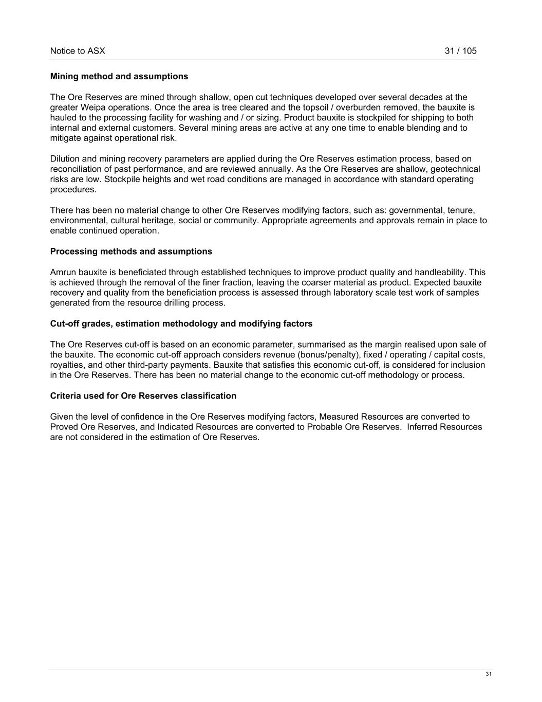Notice to ASX 31 / 105 31 Mining method and assumptions The Ore Reserves are mined through shallow, open cut techniques developed over several decades at the greater Weipa operations. Once the area is tree cleared and the topsoil / overburden removed, the bauxite is hauled to the processing facility for washing and / or sizing. Product bauxite is stockpiled for shipping to both internal and external customers. Several mining areas are active at any one time to enable blending and to mitigate against operational risk. Dilution and mining recovery parameters are applied during the Ore Reserves estimation process, based on reconciliation of past performance, and are reviewed annually. As the Ore Reserves are shallow, geotechnical risks are low. Stockpile heights and wet road conditions are managed in accordance with standard operating procedures. There has been no material change to other Ore Reserves modifying factors, such as: governmental, tenure, environmental, cultural heritage, social or community. Appropriate agreements and approvals remain in place to enable continued operation. Processing methods and assumptions Amrun bauxite is beneficiated through established techniques to improve product quality and handleability. This is achieved through the removal of the finer fraction, leaving the coarser material as product. Expected bauxite recovery and quality from the beneficiation process is assessed through laboratory scale test work of samples generated from the resource drilling process. Cut-off grades, estimation methodology and modifying factors The Ore Reserves cut-off is based on an economic parameter, summarised as the margin realised upon sale of the bauxite. The economic cut-off approach considers revenue (bonus/penalty), fixed / operating / capital costs, royalties, and other third-party payments. Bauxite that satisfies this economic cut-off, is considered for inclusion in the Ore Reserves. There has been no material change to the economic cut-off methodology or process. Criteria used for Ore Reserves classification Given the level of confidence in the Ore Reserves modifying factors, Measured Resources are converted to Proved Ore Reserves, and Indicated Resources are converted to Probable Ore Reserves. Inferred Resources are not considered in the estimation of Ore Reserves.