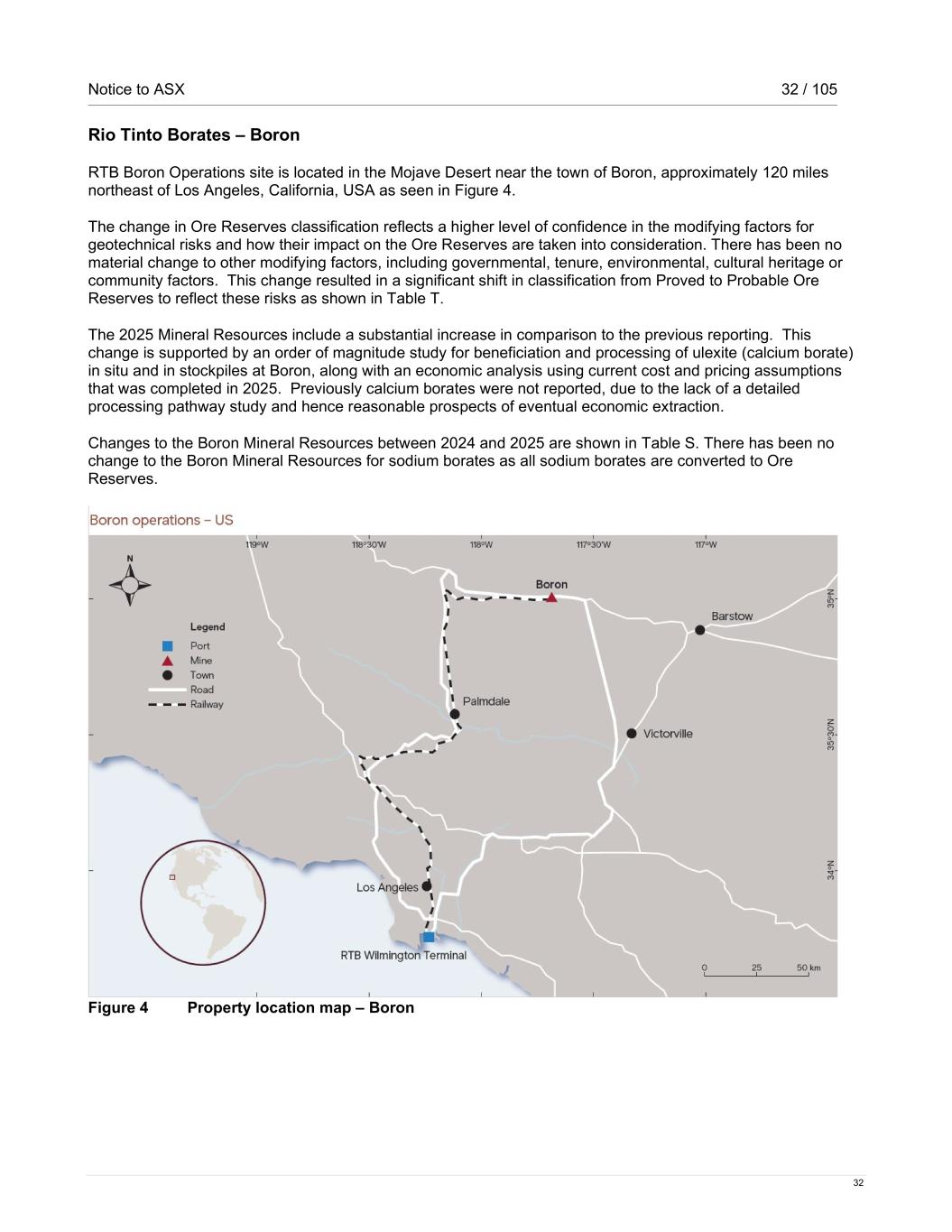 Notice to ASX 32 / 105 32 Rio Tinto Borates – Boron RTB Boron Operations site is located in the Mojave Desert near the town of Boron, approximately 120 miles northeast of Los Angeles, California, USA as seen in Figure 4. The change in Ore Reserves classification reflects a higher level of confidence in the modifying factors for geotechnical risks and how their impact on the Ore Reserves are taken into consideration. There has been no material change to other modifying factors, including governmental, tenure, environmental, cultural heritage or community factors. This change resulted in a significant shift in classification from Proved to Probable Ore Reserves to reflect these risks as shown in Table T. The 2025 Mineral Resources include a substantial increase in comparison to the previous reporting. This change is supported by an order of magnitude study for beneficiation and processing of ulexite (calcium borate) in situ and in stockpiles at Boron, along with an economic analysis using current cost and pricing assumptions that was completed in 2025. Previously calcium borates were not reported, due to the lack of a detailed processing pathway study and hence reasonable prospects of eventual economic extraction. Changes to the Boron Mineral Resources between 2024 and 2025 are shown in Table S. There has been no change to the Boron Mineral Resources for sodium borates as all sodium borates are converted to Ore Reserves. Figure 4 Property location map – Boron