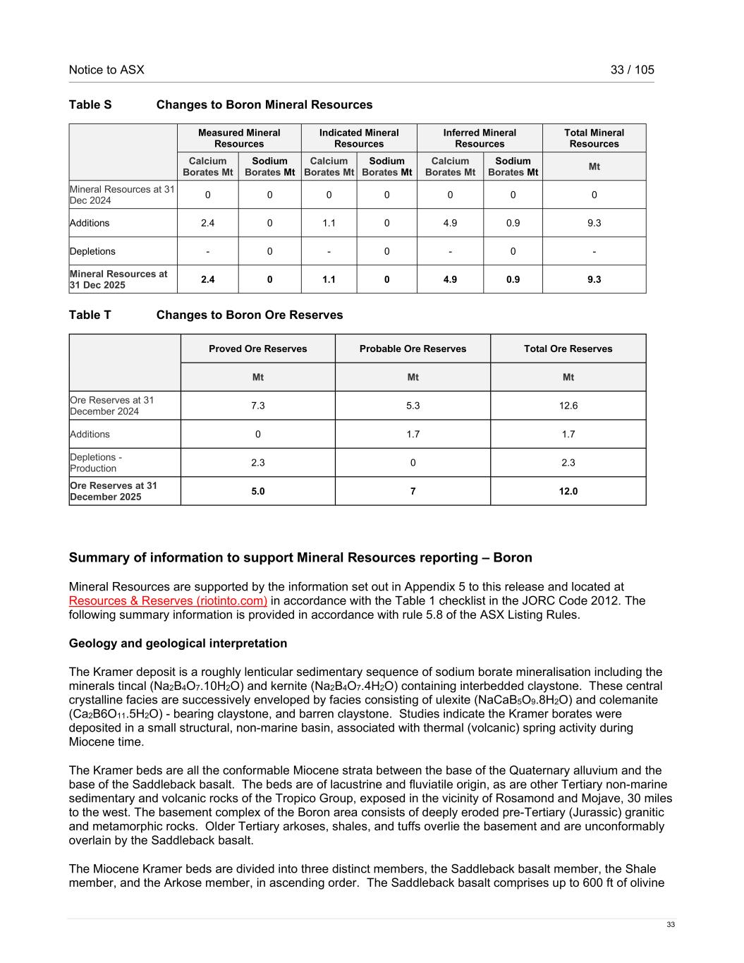 Notice to ASX 33 / 105 33 Table S Changes to Boron Mineral Resources Measured Mineral Resources Indicated Mineral Resources Inferred Mineral Resources Total Mineral Resources Calcium Borates Mt Sodium Borates Mt Calcium Borates Mt Sodium Borates Mt Calcium Borates Mt Sodium Borates Mt Mt Mineral Resources at 31 Dec 2024 0 0 0 0 0 0 0 Additions 2.4 0 1.1 0 4.9 0.9 9.3 Depletions - 0 - 0 - 0 - Mineral Resources at 31 Dec 2025 2.4 0 1.1 0 4.9 0.9 9.3 Table T Changes to Boron Ore Reserves Proved Ore Reserves Probable Ore Reserves Total Ore Reserves Mt Mt Mt Ore Reserves at 31 December 2024 7.3 5.3 12.6 Additions 0 1.7 1.7 Depletions - Production 2.3 0 2.3 Ore Reserves at 31 December 2025 5.0 7 12.0 Summary of information to support Mineral Resources reporting – Boron Mineral Resources are supported by the information set out in Appendix 5 to this release and located at Resources & Reserves (riotinto.com) in accordance with the Table 1 checklist in the JORC Code 2012. The following summary information is provided in accordance with rule 5.8 of the ASX Listing Rules. Geology and geological interpretation The Kramer deposit is a roughly lenticular sedimentary sequence of sodium borate mineralisation including the minerals tincal (Na2B4O7.10H2O) and kernite (Na2B4O7.4H2O) containing interbedded claystone. These central crystalline facies are successively enveloped by facies consisting of ulexite (NaCaB5O9.8H2O) and colemanite (Ca2B6O11.5H2O) - bearing claystone, and barren claystone. Studies indicate the Kramer borates were deposited in a small structural, non-marine basin, associated with thermal (volcanic) spring activity during Miocene time. The Kramer beds are all the conformable Miocene strata between the base of the Quaternary alluvium and the base of the Saddleback basalt. The beds are of lacustrine and fluviatile origin, as are other Tertiary non-marine sedimentary and volcanic rocks of the Tropico Group, exposed in the vicinity of Rosamond and Mojave, 30 miles to the west. The basement complex of the Boron area consists of deeply eroded pre-Tertiary (Jurassic) granitic and metamorphic rocks. Older Tertiary arkoses, shales, and tuffs overlie the basement and are unconformably overlain by the Saddleback basalt. The Miocene Kramer beds are divided into three distinct members, the Saddleback basalt member, the Shale member, and the Arkose member, in ascending order. The Saddleback basalt comprises up to 600 ft of olivine