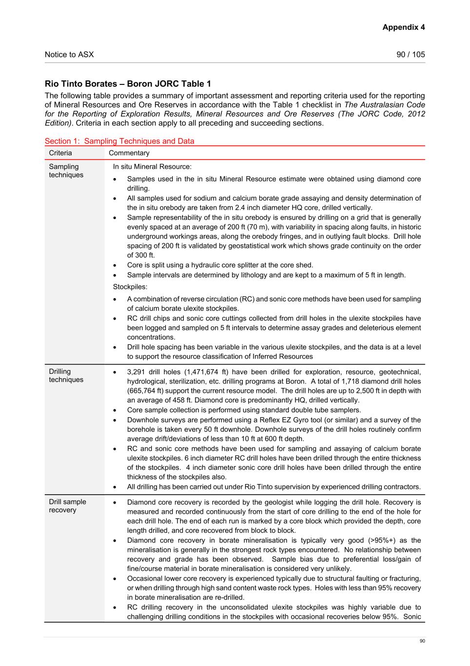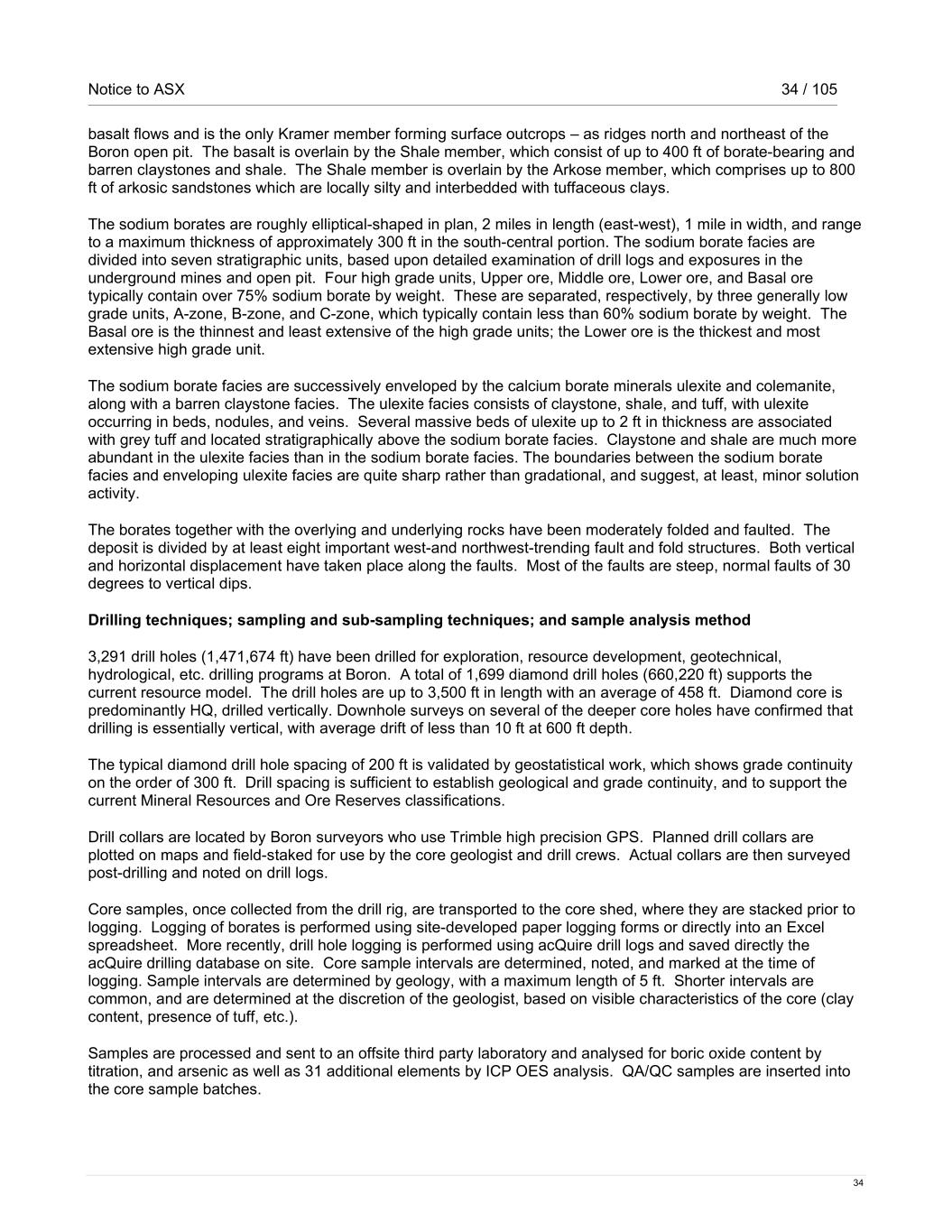 Notice to ASX 34 / 105 34 basalt flows and is the only Kramer member forming surface outcrops – as ridges north and northeast of the Boron open pit. The basalt is overlain by the Shale member, which consist of up to 400 ft of borate-bearing and barren claystones and shale. The Shale member is overlain by the Arkose member, which comprises up to 800 ft of arkosic sandstones which are locally silty and interbedded with tuffaceous clays. The sodium borates are roughly elliptical-shaped in plan, 2 miles in length (east-west), 1 mile in width, and range to a maximum thickness of approximately 300 ft in the south-central portion. The sodium borate facies are divided into seven stratigraphic units, based upon detailed examination of drill logs and exposures in the underground mines and open pit. Four high grade units, Upper ore, Middle ore, Lower ore, and Basal ore typically contain over 75% sodium borate by weight. These are separated, respectively, by three generally low grade units, A-zone, B-zone, and C-zone, which typically contain less than 60% sodium borate by weight. The Basal ore is the thinnest and least extensive of the high grade units; the Lower ore is the thickest and most extensive high grade unit. The sodium borate facies are successively enveloped by the calcium borate minerals ulexite and colemanite, along with a barren claystone facies. The ulexite facies consists of claystone, shale, and tuff, with ulexite occurring in beds, nodules, and veins. Several massive beds of ulexite up to 2 ft in thickness are associated with grey tuff and located stratigraphically above the sodium borate facies. Claystone and shale are much more abundant in the ulexite facies than in the sodium borate facies. The boundaries between the sodium borate facies and enveloping ulexite facies are quite sharp rather than gradational, and suggest, at least, minor solution activity. The borates together with the overlying and underlying rocks have been moderately folded and faulted. The deposit is divided by at least eight important west-and northwest-trending fault and fold structures. Both vertical and horizontal displacement have taken place along the faults. Most of the faults are steep, normal faults of 30 degrees to vertical dips. Drilling techniques; sampling and sub-sampling techniques; and sample analysis method 3,291 drill holes (1,471,674 ft) have been drilled for exploration, resource development, geotechnical, hydrological, etc. drilling programs at Boron. A total of 1,699 diamond drill holes (660,220 ft) supports the current resource model. The drill holes are up to 3,500 ft in length with an average of 458 ft. Diamond core is predominantly HQ, drilled vertically. Downhole surveys on several of the deeper core holes have confirmed that drilling is essentially vertical, with average drift of less than 10 ft at 600 ft depth. The typical diamond drill hole spacing of 200 ft is validated by geostatistical work, which shows grade continuity on the order of 300 ft. Drill spacing is sufficient to establish geological and grade continuity, and to support the current Mineral Resources and Ore Reserves classifications. Drill collars are located by Boron surveyors who use Trimble high precision GPS. Planned drill collars are plotted on maps and field-staked for use by the core geologist and drill crews. Actual collars are then surveyed post-drilling and noted on drill logs. Core samples, once collected from the drill rig, are transported to the core shed, where they are stacked prior to logging. Logging of borates is performed using site-developed paper logging forms or directly into an Excel spreadsheet. More recently, drill hole logging is performed using acQuire drill logs and saved directly the acQuire drilling database on site. Core sample intervals are determined, noted, and marked at the time of logging. Sample intervals are determined by geology, with a maximum length of 5 ft. Shorter intervals are common, and are determined at the discretion of the geologist, based on visible characteristics of the core (clay content, presence of tuff, etc.). Samples are processed and sent to an offsite third party laboratory and analysed for boric oxide content by titration, and arsenic as well as 31 additional elements by ICP OES analysis. QA/QC samples are inserted into the core sample batches.