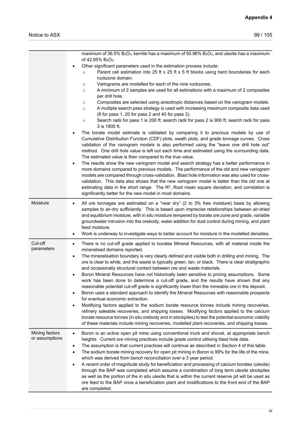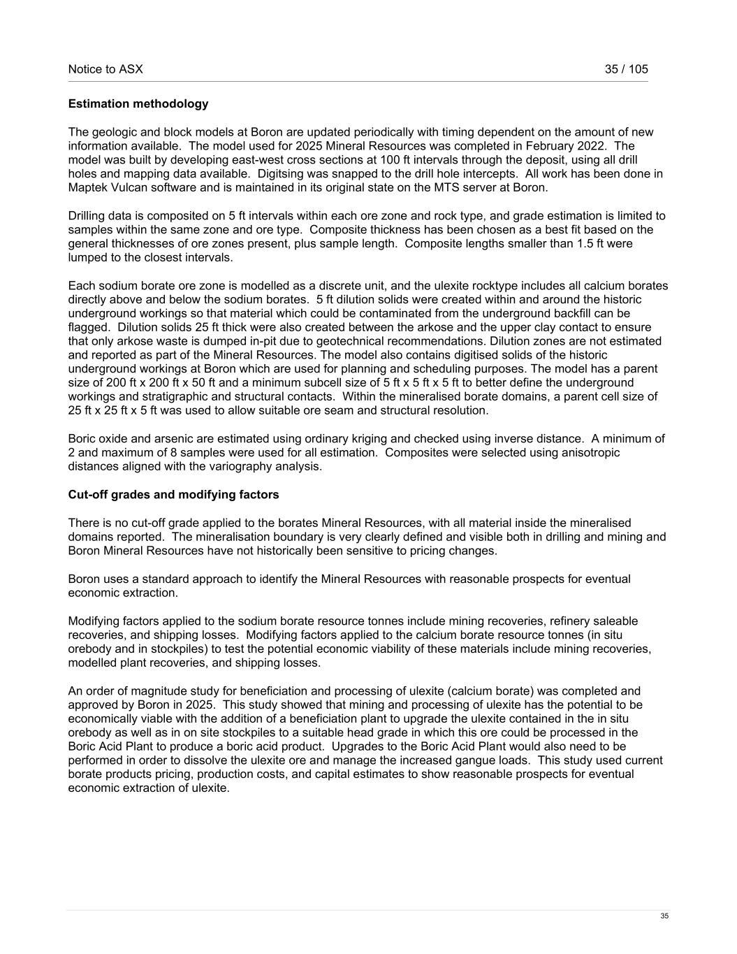 Notice to ASX 35 / 105 35 Estimation methodology The geologic and block models at Boron are updated periodically with timing dependent on the amount of new information available. The model used for 2025 Mineral Resources was completed in February 2022. The model was built by developing east-west cross sections at 100 ft intervals through the deposit, using all drill holes and mapping data available. Digitsing was snapped to the drill hole intercepts. All work has been done in Maptek Vulcan software and is maintained in its original state on the MTS server at Boron. Drilling data is composited on 5 ft intervals within each ore zone and rock type, and grade estimation is limited to samples within the same zone and ore type. Composite thickness has been chosen as a best fit based on the general thicknesses of ore zones present, plus sample length. Composite lengths smaller than 1.5 ft were lumped to the closest intervals. Each sodium borate ore zone is modelled as a discrete unit, and the ulexite rocktype includes all calcium borates directly above and below the sodium borates. 5 ft dilution solids were created within and around the historic underground workings so that material which could be contaminated from the underground backfill can be flagged. Dilution solids 25 ft thick were also created between the arkose and the upper clay contact to ensure that only arkose waste is dumped in-pit due to geotechnical recommendations. Dilution zones are not estimated and reported as part of the Mineral Resources. The model also contains digitised solids of the historic underground workings at Boron which are used for planning and scheduling purposes. The model has a parent size of 200 ft x 200 ft x 50 ft and a minimum subcell size of 5 ft x 5 ft x 5 ft to better define the underground workings and stratigraphic and structural contacts. Within the mineralised borate domains, a parent cell size of 25 ft x 25 ft x 5 ft was used to allow suitable ore seam and structural resolution. Boric oxide and arsenic are estimated using ordinary kriging and checked using inverse distance. A minimum of 2 and maximum of 8 samples were used for all estimation. Composites were selected using anisotropic distances aligned with the variography analysis. Cut-off grades and modifying factors There is no cut-off grade applied to the borates Mineral Resources, with all material inside the mineralised domains reported. The mineralisation boundary is very clearly defined and visible both in drilling and mining and Boron Mineral Resources have not historically been sensitive to pricing changes. Boron uses a standard approach to identify the Mineral Resources with reasonable prospects for eventual economic extraction. Modifying factors applied to the sodium borate resource tonnes include mining recoveries, refinery saleable recoveries, and shipping losses. Modifying factors applied to the calcium borate resource tonnes (in situ orebody and in stockpiles) to test the potential economic viability of these materials include mining recoveries, modelled plant recoveries, and shipping losses. An order of magnitude study for beneficiation and processing of ulexite (calcium borate) was completed and approved by Boron in 2025. This study showed that mining and processing of ulexite has the potential to be economically viable with the addition of a beneficiation plant to upgrade the ulexite contained in the in situ orebody as well as in on site stockpiles to a suitable head grade in which this ore could be processed in the Boric Acid Plant to produce a boric acid product. Upgrades to the Boric Acid Plant would also need to be performed in order to dissolve the ulexite ore and manage the increased gangue loads. This study used current borate products pricing, production costs, and capital estimates to show reasonable prospects for eventual economic extraction of ulexite.