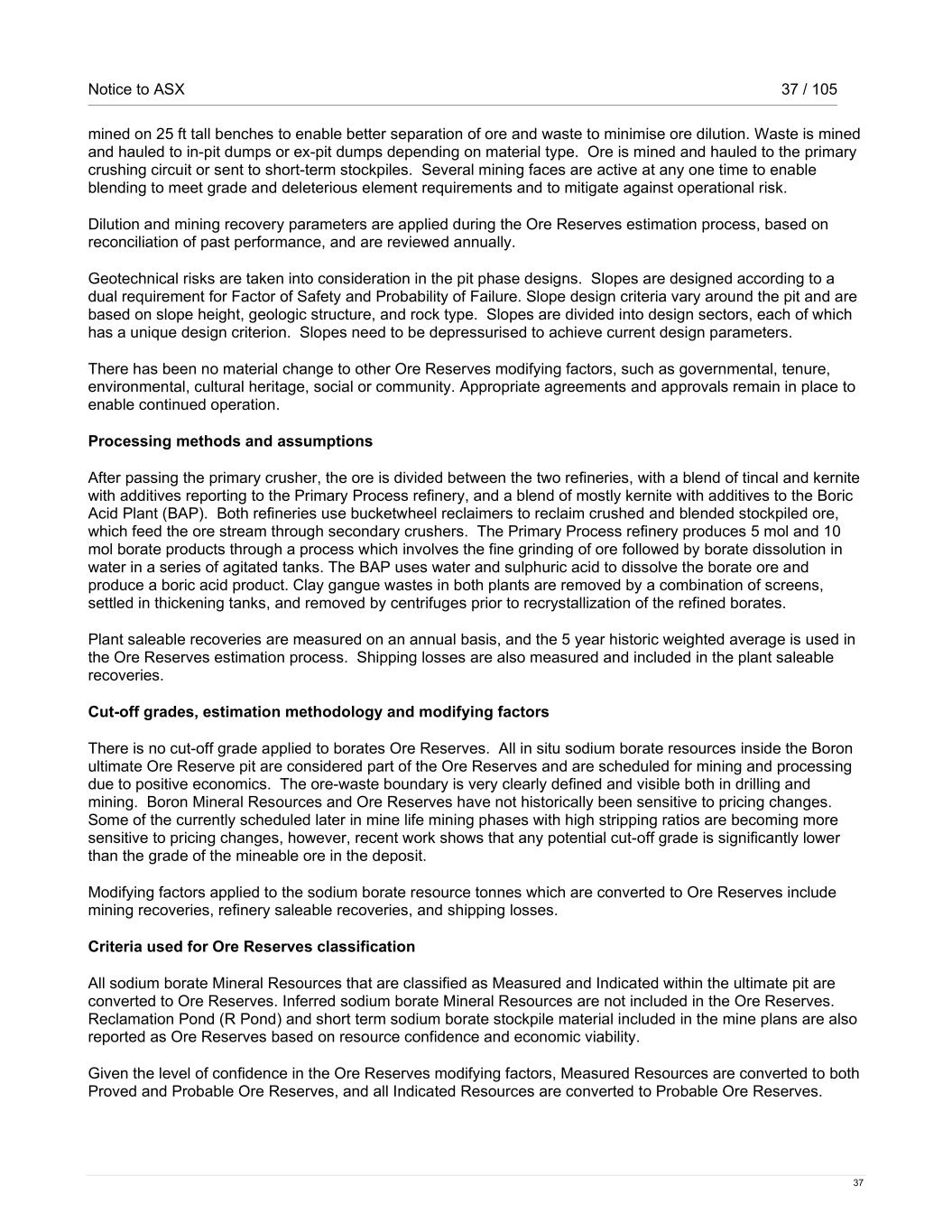Notice to ASX 37 / 105 37 mined on 25 ft tall benches to enable better separation of ore and waste to minimise ore dilution. Waste is mined and hauled to in-pit dumps or ex-pit dumps depending on material type. Ore is mined and hauled to the primary crushing circuit or sent to short-term stockpiles. Several mining faces are active at any one time to enable blending to meet grade and deleterious element requirements and to mitigate against operational risk. Dilution and mining recovery parameters are applied during the Ore Reserves estimation process, based on reconciliation of past performance, and are reviewed annually. Geotechnical risks are taken into consideration in the pit phase designs. Slopes are designed according to a dual requirement for Factor of Safety and Probability of Failure. Slope design criteria vary around the pit and are based on slope height, geologic structure, and rock type. Slopes are divided into design sectors, each of which has a unique design criterion. Slopes need to be depressurised to achieve current design parameters. There has been no material change to other Ore Reserves modifying factors, such as governmental, tenure, environmental, cultural heritage, social or community. Appropriate agreements and approvals remain in place to enable continued operation. Processing methods and assumptions After passing the primary crusher, the ore is divided between the two refineries, with a blend of tincal and kernite with additives reporting to the Primary Process refinery, and a blend of mostly kernite with additives to the Boric Acid Plant (BAP). Both refineries use bucketwheel reclaimers to reclaim crushed and blended stockpiled ore, which feed the ore stream through secondary crushers. The Primary Process refinery produces 5 mol and 10 mol borate products through a process which involves the fine grinding of ore followed by borate dissolution in water in a series of agitated tanks. The BAP uses water and sulphuric acid to dissolve the borate ore and produce a boric acid product. Clay gangue wastes in both plants are removed by a combination of screens, settled in thickening tanks, and removed by centrifuges prior to recrystallization of the refined borates. Plant saleable recoveries are measured on an annual basis, and the 5 year historic weighted average is used in the Ore Reserves estimation process. Shipping losses are also measured and included in the plant saleable recoveries. Cut-off grades, estimation methodology and modifying factors There is no cut-off grade applied to borates Ore Reserves. All in situ sodium borate resources inside the Boron ultimate Ore Reserve pit are considered part of the Ore Reserves and are scheduled for mining and processing due to positive economics. The ore-waste boundary is very clearly defined and visible both in drilling and mining. Boron Mineral Resources and Ore Reserves have not historically been sensitive to pricing changes. Some of the currently scheduled later in mine life mining phases with high stripping ratios are becoming more sensitive to pricing changes, however, recent work shows that any potential cut-off grade is significantly lower than the grade of the mineable ore in the deposit. Modifying factors applied to the sodium borate resource tonnes which are converted to Ore Reserves include mining recoveries, refinery saleable recoveries, and shipping losses. Criteria used for Ore Reserves classification All sodium borate Mineral Resources that are classified as Measured and Indicated within the ultimate pit are converted to Ore Reserves. Inferred sodium borate Mineral Resources are not included in the Ore Reserves. Reclamation Pond (R Pond) and short term sodium borate stockpile material included in the mine plans are also reported as Ore Reserves based on resource confidence and economic viability. Given the level of confidence in the Ore Reserves modifying factors, Measured Resources are converted to both Proved and Probable Ore Reserves, and all Indicated Resources are converted to Probable Ore Reserves.