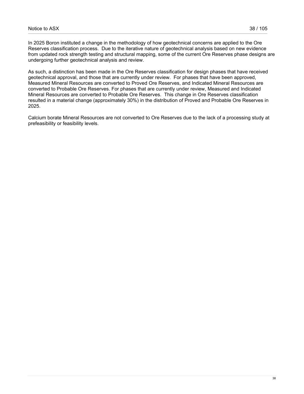 Notice to ASX 38 / 105 38 In 2025 Boron instituted a change in the methodology of how geotechnical concerns are applied to the Ore Reserves classification process. Due to the iterative nature of geotechnical analysis based on new evidence from updated rock strength testing and structural mapping, some of the current Ore Reserves phase designs are undergoing further geotechnical analysis and review. As such, a distinction has been made in the Ore Reserves classification for design phases that have received geotechnical approval, and those that are currently under review. For phases that have been approved, Measured Mineral Resources are converted to Proved Ore Reserves, and Indicated Mineral Resources are converted to Probable Ore Reserves. For phases that are currently under review, Measured and Indicated Mineral Resources are converted to Probable Ore Reserves. This change in Ore Reserves classification resulted in a material change (approximately 30%) in the distribution of Proved and Probable Ore Reserves in 2025. Calcium borate Mineral Resources are not converted to Ore Reserves due to the lack of a processing study at prefeasibility or feasibility levels.