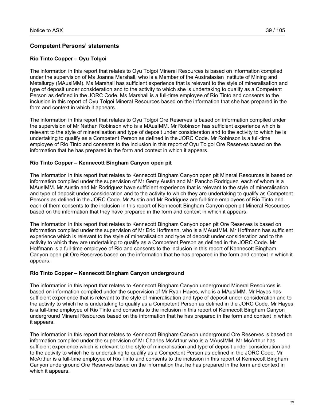 Notice to ASX 39 / 105 39 Competent Persons’ statements Rio Tinto Copper – Oyu Tolgoi The information in this report that relates to Oyu Tolgoi Mineral Resources is based on information compiled under the supervision of Ms Joanna Marshall, who is a Member of the Australasian Institute of Mining and Metallurgy (MAusIMM). Ms Marshall has sufficient experience that is relevant to the style of mineralisation and type of deposit under consideration and to the activity to which she is undertaking to qualify as a Competent Person as defined in the JORC Code. Ms Marshall is a full-time employee of Rio Tinto and consents to the inclusion in this report of Oyu Tolgoi Mineral Resources based on the information that she has prepared in the form and context in which it appears. The information in this report that relates to Oyu Tolgoi Ore Reserves is based on information compiled under the supervision of Mr Nathan Robinson who is a MAusIMM. Mr Robinson has sufficient experience which is relevant to the style of mineralisation and type of deposit under consideration and to the activity to which he is undertaking to qualify as a Competent Person as defined in the JORC Code. Mr Robinson is a full-time employee of Rio Tinto and consents to the inclusion in this report of Oyu Tolgoi Ore Reserves based on the information that he has prepared in the form and context in which it appears. Rio Tinto Copper – Kennecott Bingham Canyon open pit The information in this report that relates to Kennecott Bingham Canyon open pit Mineral Resources is based on information compiled under the supervision of Mr Gerry Austin and Mr Pancho Rodriguez, each of whom is a MAusIMM. Mr Austin and Mr Rodriguez have sufficient experience that is relevant to the style of mineralisation and type of deposit under consideration and to the activity to which they are undertaking to qualify as Competent Persons as defined in the JORC Code. Mr Austin and Mr Rodriguez are full-time employees of Rio Tinto and each of them consents to the inclusion in this report of Kennecott Bingham Canyon open pit Mineral Resources based on the information that they have prepared in the form and context in which it appears. The information in this report that relates to Kennecott Bingham Canyon open pit Ore Reserves is based on information compiled under the supervision of Mr Eric Hoffmann, who is a MAusIMM. Mr Hoffmann has sufficient experience which is relevant to the style of mineralisation and type of deposit under consideration and to the activity to which they are undertaking to qualify as a Competent Person as defined in the JORC Code. Mr Hoffmann is a full-time employee of Rio and consents to the inclusion in this report of Kennecott Bingham Canyon open pit Ore Reserves based on the information that he has prepared in the form and context in which it appears. Rio Tinto Copper – Kennecott Bingham Canyon underground The information in this report that relates to Kennecott Bingham Canyon underground Mineral Resources is based on information compiled under the supervision of Mr Ryan Hayes, who is a MAusIMM. Mr Hayes has sufficient experience that is relevant to the style of mineralisation and type of deposit under consideration and to the activity to which he is undertaking to qualify as a Competent Person as defined in the JORC Code. Mr Hayes is a full-time employee of Rio Tinto and consents to the inclusion in this report of Kennecott Bingham Canyon underground Mineral Resources based on the information that he has prepared in the form and context in which it appears. The information in this report that relates to Kennecott Bingham Canyon underground Ore Reserves is based on information compiled under the supervision of Mr Charles McArthur who is a MAusIMM. Mr McArthur has sufficient experience which is relevant to the style of mineralisation and type of deposit under consideration and to the activity to which he is undertaking to qualify as a Competent Person as defined in the JORC Code. Mr McArthur is a full-time employee of Rio Tinto and consents to the inclusion in this report of Kennecott Bingham Canyon underground Ore Reserves based on the information that he has prepared in the form and context in which it appears.