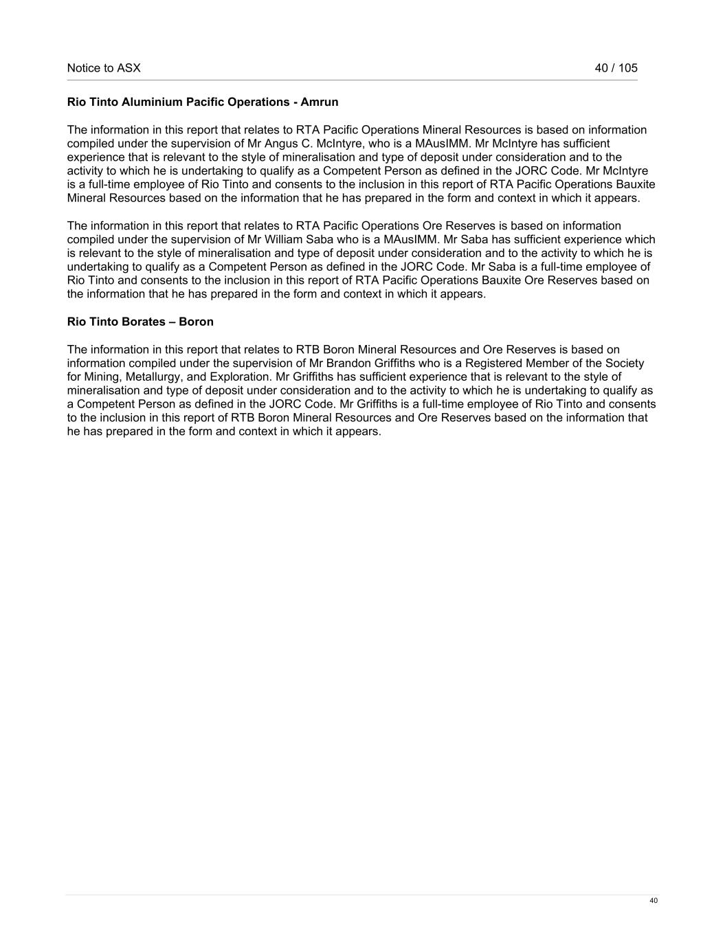 Notice to ASX 40 / 105 40 Rio Tinto Aluminium Pacific Operations - Amrun The information in this report that relates to RTA Pacific Operations Mineral Resources is based on information compiled under the supervision of Mr Angus C. McIntyre, who is a MAusIMM. Mr McIntyre has sufficient experience that is relevant to the style of mineralisation and type of deposit under consideration and to the activity to which he is undertaking to qualify as a Competent Person as defined in the JORC Code. Mr McIntyre is a full-time employee of Rio Tinto and consents to the inclusion in this report of RTA Pacific Operations Bauxite Mineral Resources based on the information that he has prepared in the form and context in which it appears. The information in this report that relates to RTA Pacific Operations Ore Reserves is based on information compiled under the supervision of Mr William Saba who is a MAusIMM. Mr Saba has sufficient experience which is relevant to the style of mineralisation and type of deposit under consideration and to the activity to which he is undertaking to qualify as a Competent Person as defined in the JORC Code. Mr Saba is a full-time employee of Rio Tinto and consents to the inclusion in this report of RTA Pacific Operations Bauxite Ore Reserves based on the information that he has prepared in the form and context in which it appears. Rio Tinto Borates – Boron The information in this report that relates to RTB Boron Mineral Resources and Ore Reserves is based on information compiled under the supervision of Mr Brandon Griffiths who is a Registered Member of the Society for Mining, Metallurgy, and Exploration. Mr Griffiths has sufficient experience that is relevant to the style of mineralisation and type of deposit under consideration and to the activity to which he is undertaking to qualify as a Competent Person as defined in the JORC Code. Mr Griffiths is a full-time employee of Rio Tinto and consents to the inclusion in this report of RTB Boron Mineral Resources and Ore Reserves based on the information that he has prepared in the form and context in which it appears.