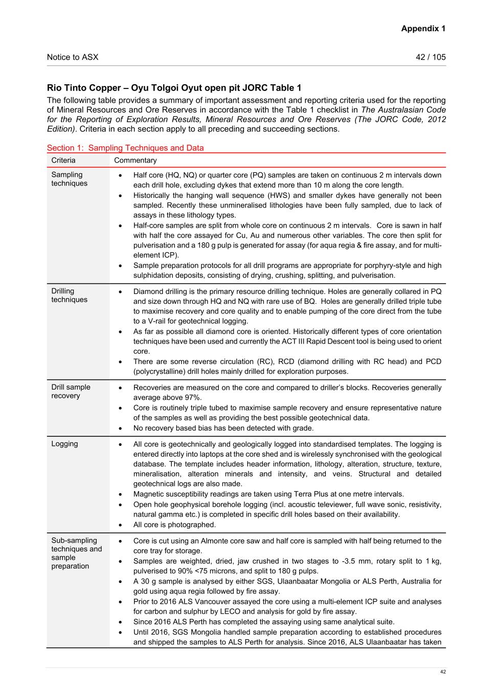 Appendix 1 Notice to ASX 42 / 105 42 Rio Tinto Copper – Oyu Tolgoi Oyut open pit JORC Table 1 The following table provides a summary of important assessment and reporting criteria used for the reporting of Mineral Resources and Ore Reserves in accordance with the Table 1 checklist in The Australasian Code for the Reporting of Exploration Results, Mineral Resources and Ore Reserves (The JORC Code, 2012 Edition). Criteria in each section apply to all preceding and succeeding sections. Section 1: Sampling Techniques and Data Criteria Commentary Sampling techniques • Half core (HQ, NQ) or quarter core (PQ) samples are taken on continuous 2 m intervals down each drill hole, excluding dykes that extend more than 10 m along the core length. • Historically the hanging wall sequence (HWS) and smaller dykes have generally not been sampled. Recently these unmineralised lithologies have been fully sampled, due to lack of assays in these lithology types. • Half-core samples are split from whole core on continuous 2 m intervals.   Core is sawn in half with half the core assayed for Cu, Au and numerous other variables. The core then split for pulverisation and a 180 g pulp is generated for assay (for aqua regia & fire assay, and for multi- element ICP). • Sample preparation protocols for all drill programs are appropriate for porphyry-style and high sulphidation deposits, consisting of drying, crushing, splitting, and pulverisation. Drilling techniques • Diamond drilling is the primary resource drilling technique. Holes are generally collared in PQ and size down through HQ and NQ with rare use of BQ. Holes are generally drilled triple tube to maximise recovery and core quality and to enable pumping of the core direct from the tube to a V-rail for geotechnical logging. • As far as possible all diamond core is oriented. Historically different types of core orientation techniques have been used and currently the ACT III Rapid Descent tool is being used to orient core. • There are some reverse circulation (RC), RCD (diamond drilling with RC head) and PCD (polycrystalline) drill holes mainly drilled for exploration purposes. Drill sample recovery • Recoveries are measured on the core and compared to driller’s blocks. Recoveries generally average above 97%. • Core is routinely triple tubed to maximise sample recovery and ensure representative nature of the samples as well as providing the best possible geotechnical data. • No recovery based bias has been detected with grade. Logging • All core is geotechnically and geologically logged into standardised templates. The logging is entered directly into laptops at the core shed and is wirelessly synchronised with the geological database. The template includes header information, lithology, alteration, structure, texture, mineralisation, alteration minerals and intensity, and veins. Structural and detailed geotechnical logs are also made. • Magnetic susceptibility readings are taken using Terra Plus at one metre intervals. • Open hole geophysical borehole logging (incl. acoustic televiewer, full wave sonic, resistivity, natural gamma etc.) is completed in specific drill holes based on their availability. • All core is photographed. Sub-sampling techniques and sample preparation • Core is cut using an Almonte core saw and half core is sampled with half being returned to the core tray for storage. • Samples are weighted, dried, jaw crushed in two stages to -3.5 mm, rotary split to 1 kg, pulverised to 90% <75 microns, and split to 180 g pulps. • A 30 g sample is analysed by either SGS, Ulaanbaatar Mongolia or ALS Perth, Australia for gold using aqua regia followed by fire assay. • Prior to 2016 ALS Vancouver assayed the core using a multi-element ICP suite and analyses for carbon and sulphur by LECO and analysis for gold by fire assay. • Since 2016 ALS Perth has completed the assaying using same analytical suite. • Until 2016, SGS Mongolia handled sample preparation according to established procedures and shipped the samples to ALS Perth for analysis. Since 2016, ALS Ulaanbaatar has taken