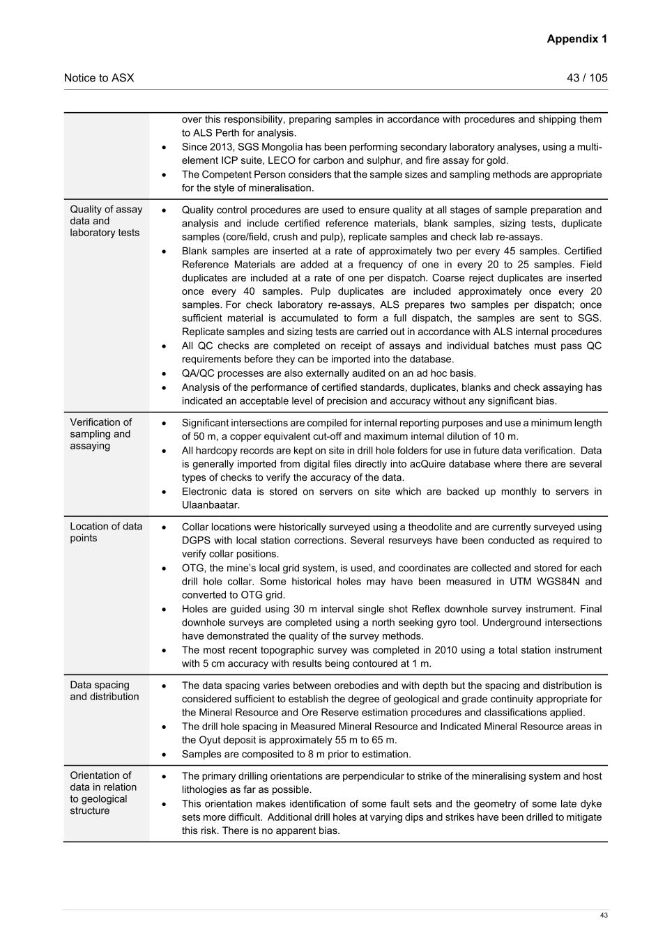 Appendix 1 Notice to ASX 43 / 105 43 over this responsibility, preparing samples in accordance with procedures and shipping them to ALS Perth for analysis. • Since 2013, SGS Mongolia has been performing secondary laboratory analyses, using a multi- element ICP suite, LECO for carbon and sulphur, and fire assay for gold. • The Competent Person considers that the sample sizes and sampling methods are appropriate for the style of mineralisation. Quality of assay data and laboratory tests • Quality control procedures are used to ensure quality at all stages of sample preparation and analysis and include certified reference materials, blank samples, sizing tests, duplicate samples (core/field, crush and pulp), replicate samples and check lab re-assays. • Blank samples are inserted at a rate of approximately two per every 45 samples. Certified Reference Materials are added at a frequency of one in every 20 to 25 samples. Field duplicates are included at a rate of one per dispatch. Coarse reject duplicates are inserted once every 40 samples. Pulp duplicates are included approximately once every 20 samples. For check laboratory re-assays, ALS prepares two samples per dispatch; once sufficient material is accumulated to form a full dispatch, the samples are sent to SGS. Replicate samples and sizing tests are carried out in accordance with ALS internal procedures • All QC checks are completed on receipt of assays and individual batches must pass QC requirements before they can be imported into the database. • QA/QC processes are also externally audited on an ad hoc basis. • Analysis of the performance of certified standards, duplicates, blanks and check assaying has indicated an acceptable level of precision and accuracy without any significant bias. Verification of sampling and assaying • Significant intersections are compiled for internal reporting purposes and use a minimum length of 50 m, a copper equivalent cut-off and maximum internal dilution of 10 m. • All hardcopy records are kept on site in drill hole folders for use in future data verification. Data is generally imported from digital files directly into acQuire database where there are several types of checks to verify the accuracy of the data. • Electronic data is stored on servers on site which are backed up monthly to servers in Ulaanbaatar. Location of data points • Collar locations were historically surveyed using a theodolite and are currently surveyed using DGPS with local station corrections. Several resurveys have been conducted as required to verify collar positions. • OTG, the mine’s local grid system, is used, and coordinates are collected and stored for each drill hole collar. Some historical holes may have been measured in UTM WGS84N and converted to OTG grid. • Holes are guided using 30 m interval single shot Reflex downhole survey instrument. Final downhole surveys are completed using a north seeking gyro tool. Underground intersections have demonstrated the quality of the survey methods. • The most recent topographic survey was completed in 2010 using a total station instrument with 5 cm accuracy with results being contoured at 1 m. Data spacing and distribution • The data spacing varies between orebodies and with depth but the spacing and distribution is considered sufficient to establish the degree of geological and grade continuity appropriate for the Mineral Resource and Ore Reserve estimation procedures and classifications applied. • The drill hole spacing in Measured Mineral Resource and Indicated Mineral Resource areas in the Oyut deposit is approximately 55 m to 65 m. • Samples are composited to 8 m prior to estimation. Orientation of data in relation to geological structure • The primary drilling orientations are perpendicular to strike of the mineralising system and host lithologies as far as possible. • This orientation makes identification of some fault sets and the geometry of some late dyke sets more difficult. Additional drill holes at varying dips and strikes have been drilled to mitigate this risk. There is no apparent bias.