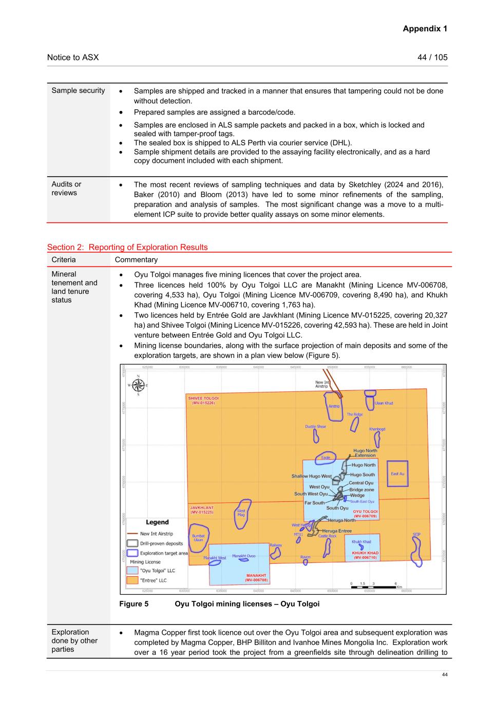 Appendix 1 Notice to ASX 44 / 105 44 Sample security • Samples are shipped and tracked in a manner that ensures that tampering could not be done without detection. • Prepared samples are assigned a barcode/code. • Samples are enclosed in ALS sample packets and packed in a box, which is locked and sealed with tamper-proof tags. • The sealed box is shipped to ALS Perth via courier service (DHL). • Sample shipment details are provided to the assaying facility electronically, and as a hard copy document included with each shipment. Audits or reviews • The most recent reviews of sampling techniques and data by Sketchley (2024 and 2016), Baker (2010) and Bloom (2013) have led to some minor refinements of the sampling, preparation and analysis of samples. The most significant change was a move to a multi- element ICP suite to provide better quality assays on some minor elements. Section 2: Reporting of Exploration Results Criteria Commentary Mineral tenement and land tenure status • Oyu Tolgoi manages five mining licences that cover the project area. • Three licences held 100% by Oyu Tolgoi LLC are Manakht (Mining Licence MV-006708, covering 4,533 ha), Oyu Tolgoi (Mining Licence MV-006709, covering 8,490 ha), and Khukh Khad (Mining Licence MV-006710, covering 1,763 ha). • Two licences held by Entrée Gold are Javkhlant (Mining Licence MV-015225, covering 20,327 ha) and Shivee Tolgoi (Mining Licence MV-015226, covering 42,593 ha). These are held in Joint venture between Entrée Gold and Oyu Tolgoi LLC. • Mining license boundaries, along with the surface projection of main deposits and some of the exploration targets, are shown in a plan view below (Figure 5). Figure 5 Oyu Tolgoi mining licenses – Oyu Tolgoi Exploration done by other parties • Magma Copper first took licence out over the Oyu Tolgoi area and subsequent exploration was completed by Magma Copper, BHP Billiton and Ivanhoe Mines Mongolia Inc. Exploration work over a 16 year period took the project from a greenfields site through delineation drilling to