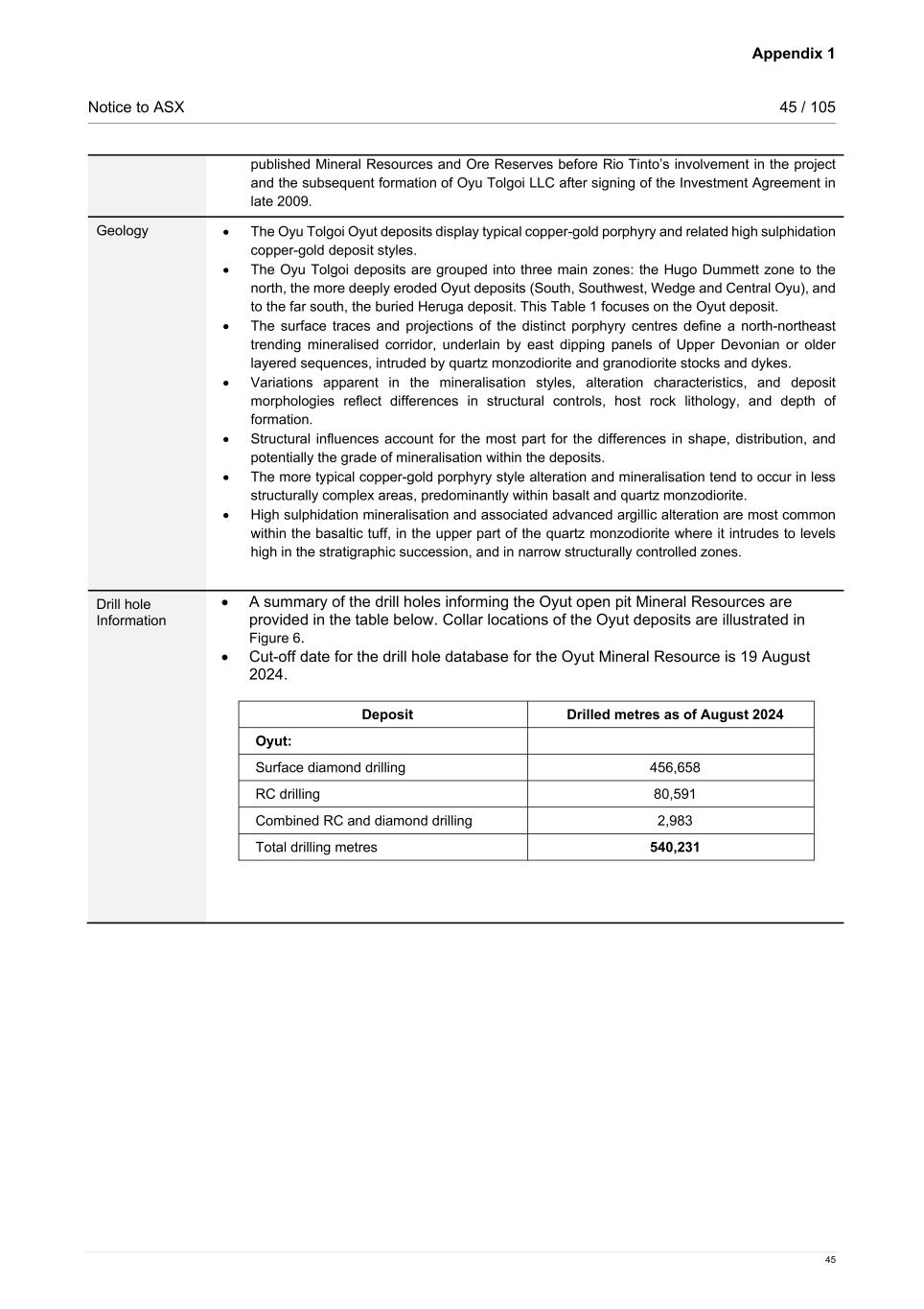 Appendix 1 Notice to ASX 45 / 105 45 published Mineral Resources and Ore Reserves before Rio Tinto’s involvement in the project and the subsequent formation of Oyu Tolgoi LLC after signing of the Investment Agreement in late 2009. Geology • The Oyu Tolgoi Oyut deposits display typical copper-gold porphyry and related high sulphidation copper-gold deposit styles. • The Oyu Tolgoi deposits are grouped into three main zones: the Hugo Dummett zone to the north, the more deeply eroded Oyut deposits (South, Southwest, Wedge and Central Oyu), and to the far south, the buried Heruga deposit. This Table 1 focuses on the Oyut deposit. • The surface traces and projections of the distinct porphyry centres define a north-northeast trending mineralised corridor, underlain by east dipping panels of Upper Devonian or older layered sequences, intruded by quartz monzodiorite and granodiorite stocks and dykes. • Variations apparent in the mineralisation styles, alteration characteristics, and deposit morphologies reflect differences in structural controls, host rock lithology, and depth of formation. • Structural influences account for the most part for the differences in shape, distribution, and potentially the grade of mineralisation within the deposits. • The more typical copper-gold porphyry style alteration and mineralisation tend to occur in less structurally complex areas, predominantly within basalt and quartz monzodiorite. • High sulphidation mineralisation and associated advanced argillic alteration are most common within the basaltic tuff, in the upper part of the quartz monzodiorite where it intrudes to levels high in the stratigraphic succession, and in narrow structurally controlled zones. Drill hole Information • A summary of the drill holes informing the Oyut open pit Mineral Resources are provided in the table below. Collar locations of the Oyut deposits are illustrated in Figure 6. • Cut-off date for the drill hole database for the Oyut Mineral Resource is 19 August 2024. Deposit Drilled metres as of August 2024 Oyut: Surface diamond drilling 456,658 RC drilling 80,591 Combined RC and diamond drilling 2,983 Total drilling metres 540,231