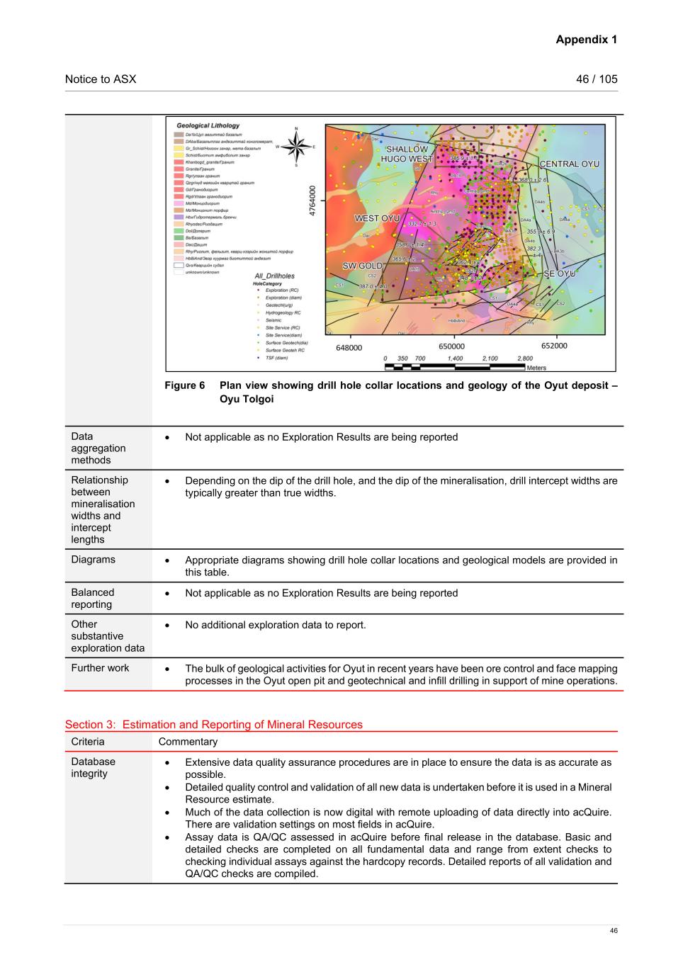 Appendix 1 Notice to ASX 46 / 105 46 Figure 6 Plan view showing drill hole collar locations and geology of the Oyut deposit – Oyu Tolgoi Data aggregation methods • Not applicable as no Exploration Results are being reported Relationship between mineralisation widths and intercept lengths • Depending on the dip of the drill hole, and the dip of the mineralisation, drill intercept widths are typically greater than true widths. Diagrams • Appropriate diagrams showing drill hole collar locations and geological models are provided in this table. Balanced reporting • Not applicable as no Exploration Results are being reported Other substantive exploration data • No additional exploration data to report. Further work • The bulk of geological activities for Oyut in recent years have been ore control and face mapping processes in the Oyut open pit and geotechnical and infill drilling in support of mine operations. Section 3: Estimation and Reporting of Mineral Resources Criteria Commentary Database integrity • Extensive data quality assurance procedures are in place to ensure the data is as accurate as possible. • Detailed quality control and validation of all new data is undertaken before it is used in a Mineral Resource estimate. • Much of the data collection is now digital with remote uploading of data directly into acQuire. There are validation settings on most fields in acQuire. • Assay data is QA/QC assessed in acQuire before final release in the database. Basic and detailed checks are completed on all fundamental data and range from extent checks to checking individual assays against the hardcopy records. Detailed reports of all validation and QA/QC checks are compiled.