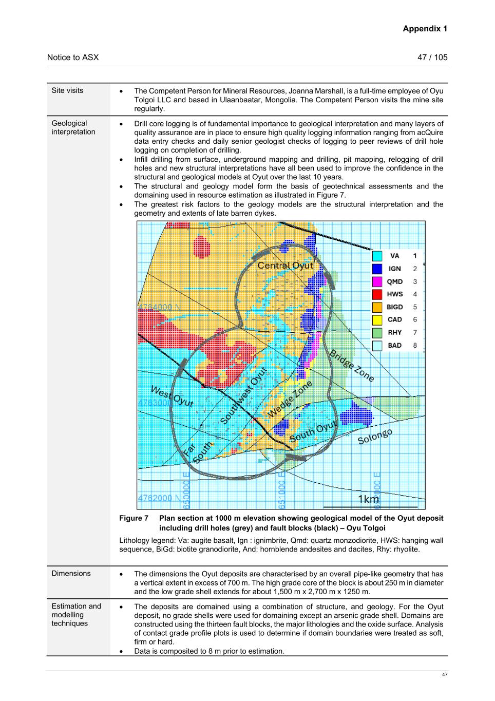 Appendix 1 Notice to ASX 47 / 105 47 Site visits • The Competent Person for Mineral Resources, Joanna Marshall, is a full-time employee of Oyu Tolgoi LLC and based in Ulaanbaatar, Mongolia. The Competent Person visits the mine site regularly. Geological interpretation • Drill core logging is of fundamental importance to geological interpretation and many layers of quality assurance are in place to ensure high quality logging information ranging from acQuire data entry checks and daily senior geologist checks of logging to peer reviews of drill hole logging on completion of drilling. • Infill drilling from surface, underground mapping and drilling, pit mapping, relogging of drill holes and new structural interpretations have all been used to improve the confidence in the structural and geological models at Oyut over the last 10 years. • The structural and geology model form the basis of geotechnical assessments and the domaining used in resource estimation as illustrated in Figure 7. • The greatest risk factors to the geology models are the structural interpretation and the geometry and extents of late barren dykes. Figure 7 Plan section at 1000 m elevation showing geological model of the Oyut deposit including drill holes (grey) and fault blocks (black) – Oyu Tolgoi Lithology legend: Va: augite basalt, Ign : ignimbrite, Qmd: quartz monzodiorite, HWS: hanging wall sequence, BiGd: biotite granodiorite, And: hornblende andesites and dacites, Rhy: rhyolite. Dimensions • The dimensions the Oyut deposits are characterised by an overall pipe-like geometry that has a vertical extent in excess of 700 m. The high grade core of the block is about 250 m in diameter and the low grade shell extends for about 1,500 m x 2,700 m x 1250 m. Estimation and modelling techniques • The deposits are domained using a combination of structure, and geology. For the Oyut deposit, no grade shells were used for domaining except an arsenic grade shell. Domains are constructed using the thirteen fault blocks, the major lithologies and the oxide surface. Analysis of contact grade profile plots is used to determine if domain boundaries were treated as soft, firm or hard. • Data is composited to 8 m prior to estimation.