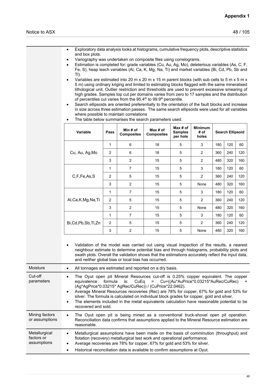 Appendix 1 Notice to ASX 48 / 105 48 • Exploratory data analysis looks at histograms, cumulative frequency plots, descriptive statistics and box plots. • Variography was undertaken on composite files using correlograms. • Estimation is completed for: grade variables (Cu, Au, Ag, Mo), deleterious variables (As, C, F, Fe, S), heap leach variables (Al, Ca, K, Mg, Na, Ti) and market variables (Bi, Cd, Pb, Sb and Tl). • Variables are estimated into 20 m x 20 m x 15 m parent blocks (with sub cells to 5 m x 5 m x 5 m) using ordinary kriging and limited to estimating blocks flagged with the same mineralised lithological unit. Outlier restriction and thresholds are used to prevent excessive smearing of high grades. Samples top cut per domains varies from zero to 17 samples and the distribution of percentiles cut varies from the 95.4th to 99.9th percentile. • Search ellipsoids are oriented preferentially to the orientation of the fault blocks and increase in size across three estimation passes. The same search ellipsoids were used for all variables where possible to maintain correlations • The table below summarises the search parameters used. Variable Pass Min # of Composites Max # of Composites Max # of Samples per hole Minimum # of holes Search Ellipsoid Cu, Au, Ag,Mo 1 6 18 5 3 180 120 60 2 6 18 5 2 360 240 120 3 2 15 5 2 480 320 160 C,F,Fe,As,S 1 7 15 5 3 180 120 60 2 5 15 5 2 360 240 120 3 2 15 5 None 480 320 160 Al,Ca,K,Mg,Na,Ti 1 7 15 5 3 180 120 60 2 5 15 5 2 360 240 120 3 2 15 5 None 480 320 160 Bi,Cd,Pb,Sb,Tl,Zn 1 7 15 5 3 180 120 60 2 5 15 5 2 360 240 120 3 2 15 5 None 480 320 160 • Validation of the model was carried out using visual inspection of the results, a nearest neighbour estimate to determine potential bias and through histograms, probability plots and swath plots. Overall the validation shows that the estimations accurately reflect the input data, and neither global bias or local bias has occurred. Moisture • All tonnages are estimated and reported on a dry basis. Cut-off parameters • The Oyut open pit Mineral Resources cut-off is 0.25% copper equivalent. The copper equivalence formula is: CuEq = Cu+((Au*AuPrice*0.03215*AuRec/CuRec) + (Ag*AgPrice*0.03215* AgRec/CuRec)) / (CuPrice*22.0462). • Average Mineral Resources recoveries (Rec) are 78% for copper, 67% for gold and 53% for silver. The formula is calculated on individual block grades for copper, gold and silver. • The elements included in the metal equivalents calculation have reasonable potential to be recovered and sold. Mining factors or assumptions • The Oyut open pit is being mined as a conventional truck-shovel open pit operation. Reconciliation data confirms that assumptions applied to the Mineral Resource estimation are reasonable. Metallurgical factors or assumptions • Metallurgical assumptions have been made on the basis of comminution (throughput) and flotation (recovery) metallurgical test work and operational performance. • Average recoveries are 78% for copper, 67% for gold and 53% for silver. • Historical reconciliation data is available to confirm assumptions at Oyut.