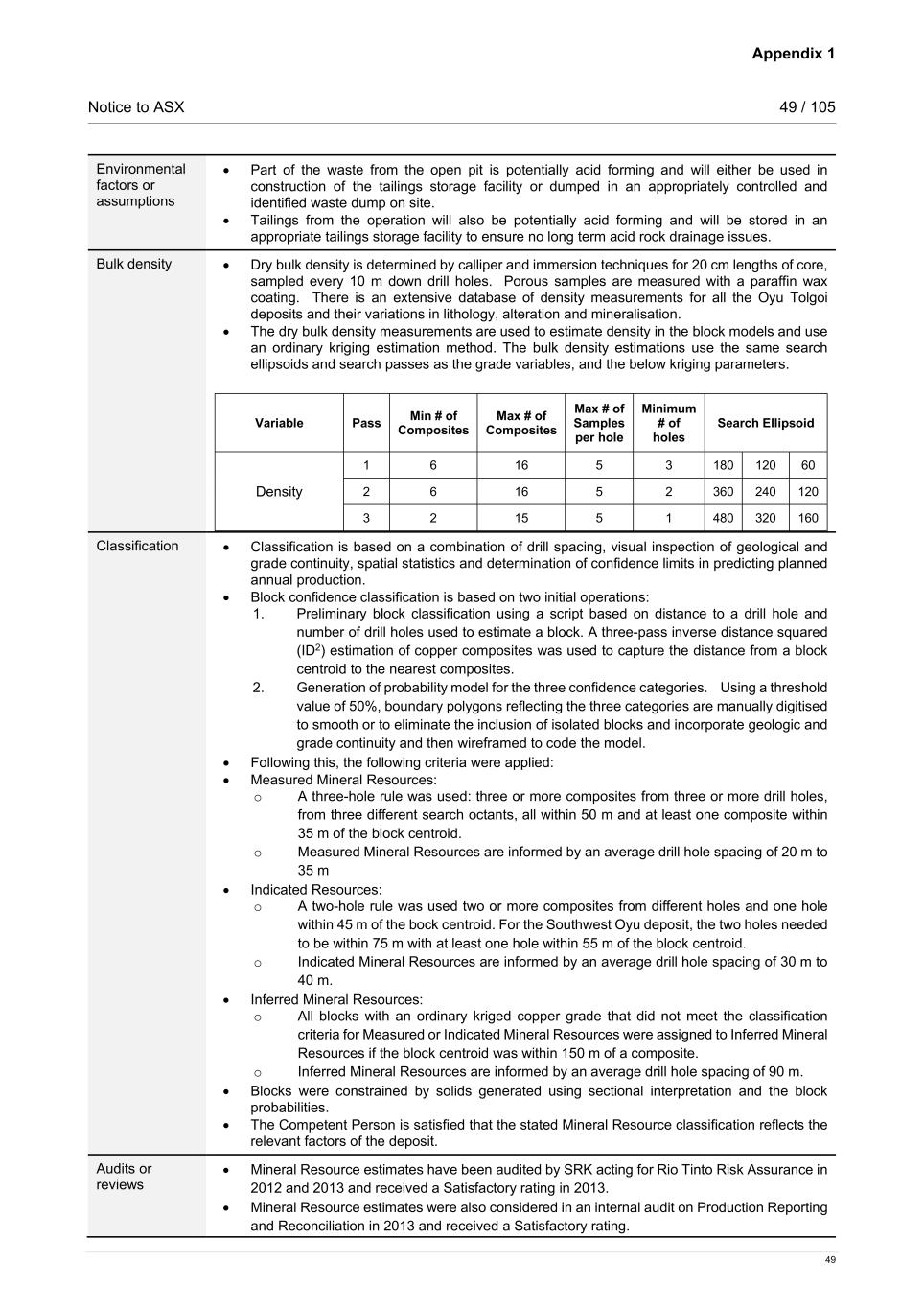 Appendix 1 Notice to ASX 49 / 105 49 Environmental factors or assumptions • Part of the waste from the open pit is potentially acid forming and will either be used in construction of the tailings storage facility or dumped in an appropriately controlled and identified waste dump on site. • Tailings from the operation will also be potentially acid forming and will be stored in an appropriate tailings storage facility to ensure no long term acid rock drainage issues. Bulk density • Dry bulk density is determined by calliper and immersion techniques for 20 cm lengths of core, sampled every 10 m down drill holes. Porous samples are measured with a paraffin wax coating. There is an extensive database of density measurements for all the Oyu Tolgoi deposits and their variations in lithology, alteration and mineralisation. • The dry bulk density measurements are used to estimate density in the block models and use an ordinary kriging estimation method. The bulk density estimations use the same search ellipsoids and search passes as the grade variables, and the below kriging parameters. Variable Pass Min # of Composites Max # of Composites Max # of Samples per hole Minimum # of holes Search Ellipsoid Density 1 6 16 5 3 180 120 60 2 6 16 5 2 360 240 120 3 2 15 5 1 480 320 160 Classification • Classification is based on a combination of drill spacing, visual inspection of geological and grade continuity, spatial statistics and determination of confidence limits in predicting planned annual production. • Block confidence classification is based on two initial operations: 1. Preliminary block classification using a script based on distance to a drill hole and number of drill holes used to estimate a block. A three-pass inverse distance squared (ID2) estimation of copper composites was used to capture the distance from a block centroid to the nearest composites. 2. Generation of probability model for the three confidence categories. Using a threshold value of 50%, boundary polygons reflecting the three categories are manually digitised to smooth or to eliminate the inclusion of isolated blocks and incorporate geologic and grade continuity and then wireframed to code the model. • Following this, the following criteria were applied: • Measured Mineral Resources: o A three-hole rule was used: three or more composites from three or more drill holes, from three different search octants, all within 50 m and at least one composite within 35 m of the block centroid. o Measured Mineral Resources are informed by an average drill hole spacing of 20 m to 35 m • Indicated Resources: o A two-hole rule was used two or more composites from different holes and one hole within 45 m of the bock centroid. For the Southwest Oyu deposit, the two holes needed to be within 75 m with at least one hole within 55 m of the block centroid. o Indicated Mineral Resources are informed by an average drill hole spacing of 30 m to 40 m. • Inferred Mineral Resources: o All blocks with an ordinary kriged copper grade that did not meet the classification criteria for Measured or Indicated Mineral Resources were assigned to Inferred Mineral Resources if the block centroid was within 150 m of a composite. o Inferred Mineral Resources are informed by an average drill hole spacing of 90 m. • Blocks were constrained by solids generated using sectional interpretation and the block probabilities. • The Competent Person is satisfied that the stated Mineral Resource classification reflects the relevant factors of the deposit. Audits or reviews • Mineral Resource estimates have been audited by SRK acting for Rio Tinto Risk Assurance in 2012 and 2013 and received a Satisfactory rating in 2013. • Mineral Resource estimates were also considered in an internal audit on Production Reporting and Reconciliation in 2013 and received a Satisfactory rating.