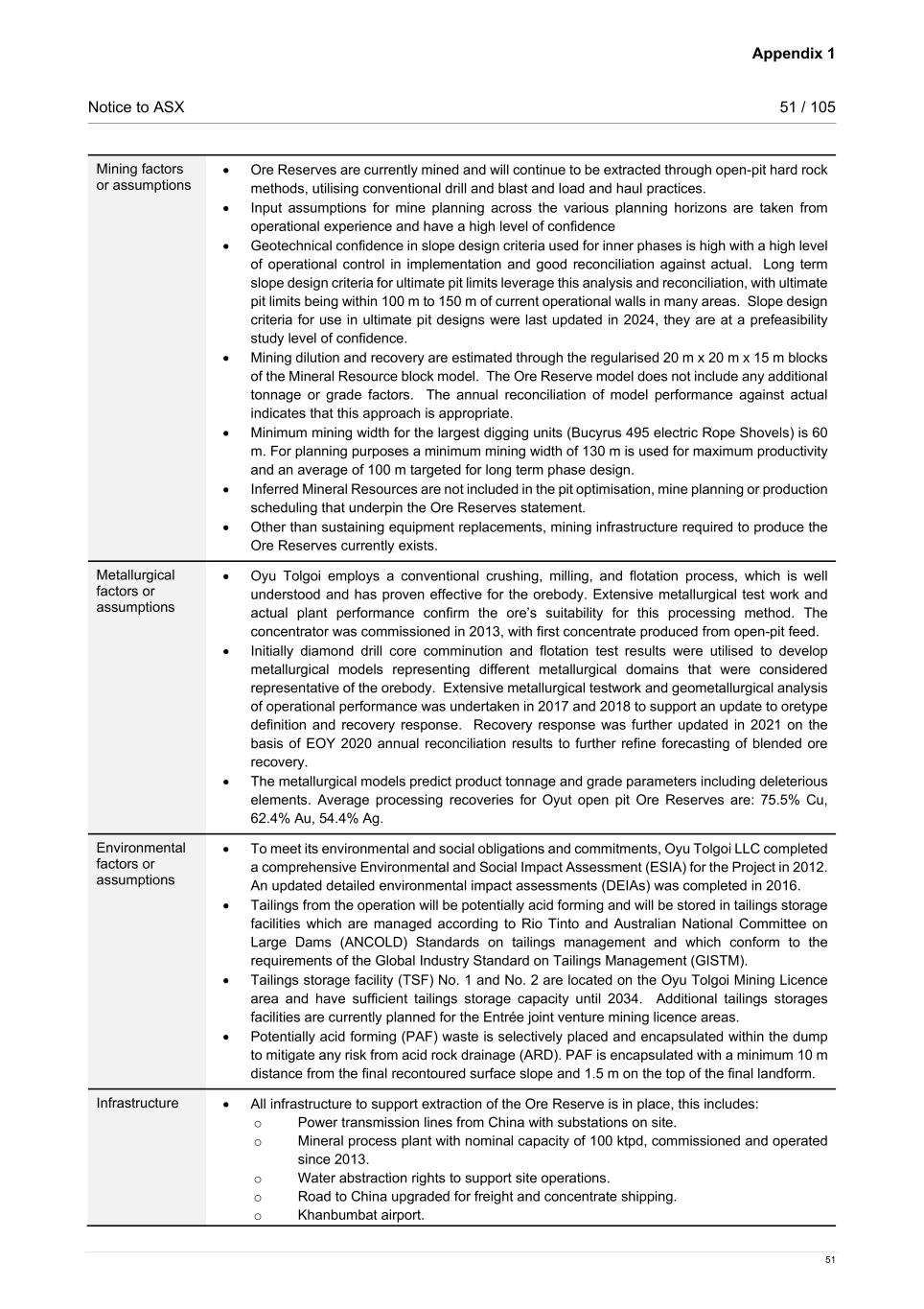 Appendix 1 Notice to ASX 51 / 105 51 Mining factors or assumptions • Ore Reserves are currently mined and will continue to be extracted through open-pit hard rock methods, utilising conventional drill and blast and load and haul practices. • Input assumptions for mine planning across the various planning horizons are taken from operational experience and have a high level of confidence • Geotechnical confidence in slope design criteria used for inner phases is high with a high level of operational control in implementation and good reconciliation against actual. Long term slope design criteria for ultimate pit limits leverage this analysis and reconciliation, with ultimate pit limits being within 100 m to 150 m of current operational walls in many areas. Slope design criteria for use in ultimate pit designs were last updated in 2024, they are at a prefeasibility study level of confidence. • Mining dilution and recovery are estimated through the regularised 20 m x 20 m x 15 m blocks of the Mineral Resource block model. The Ore Reserve model does not include any additional tonnage or grade factors. The annual reconciliation of model performance against actual indicates that this approach is appropriate. • Minimum mining width for the largest digging units (Bucyrus 495 electric Rope Shovels) is 60 m. For planning purposes a minimum mining width of 130 m is used for maximum productivity and an average of 100 m targeted for long term phase design. • Inferred Mineral Resources are not included in the pit optimisation, mine planning or production scheduling that underpin the Ore Reserves statement. • Other than sustaining equipment replacements, mining infrastructure required to produce the Ore Reserves currently exists. Metallurgical factors or assumptions • Oyu Tolgoi employs a conventional crushing, milling, and flotation process, which is well understood and has proven effective for the orebody. Extensive metallurgical test work and actual plant performance confirm the ore’s suitability for this processing method. The concentrator was commissioned in 2013, with first concentrate produced from open-pit feed. • Initially diamond drill core comminution and flotation test results were utilised to develop metallurgical models representing different metallurgical domains that were considered representative of the orebody. Extensive metallurgical testwork and geometallurgical analysis of operational performance was undertaken in 2017 and 2018 to support an update to oretype definition and recovery response. Recovery response was further updated in 2021 on the basis of EOY 2020 annual reconciliation results to further refine forecasting of blended ore recovery. • The metallurgical models predict product tonnage and grade parameters including deleterious elements. Average processing recoveries for Oyut open pit Ore Reserves are: 75.5% Cu, 62.4% Au, 54.4% Ag. Environmental factors or assumptions • To meet its environmental and social obligations and commitments, Oyu Tolgoi LLC completed a comprehensive Environmental and Social Impact Assessment (ESIA) for the Project in 2012. An updated detailed environmental impact assessments (DEIAs) was completed in 2016. • Tailings from the operation will be potentially acid forming and will be stored in tailings storage facilities which are managed according to Rio Tinto and Australian National Committee on Large Dams (ANCOLD) Standards on tailings management and which conform to the requirements of the Global Industry Standard on Tailings Management (GISTM). • Tailings storage facility (TSF) No. 1 and No. 2 are located on the Oyu Tolgoi Mining Licence area and have sufficient tailings storage capacity until 2034. Additional tailings storages facilities are currently planned for the Entrée joint venture mining licence areas. • Potentially acid forming (PAF) waste is selectively placed and encapsulated within the dump to mitigate any risk from acid rock drainage (ARD). PAF is encapsulated with a minimum 10 m distance from the final recontoured surface slope and 1.5 m on the top of the final landform. Infrastructure • All infrastructure to support extraction of the Ore Reserve is in place, this includes: o Power transmission lines from China with substations on site. o Mineral process plant with nominal capacity of 100 ktpd, commissioned and operated since 2013. o Water abstraction rights to support site operations. o Road to China upgraded for freight and concentrate shipping. o Khanbumbat airport.