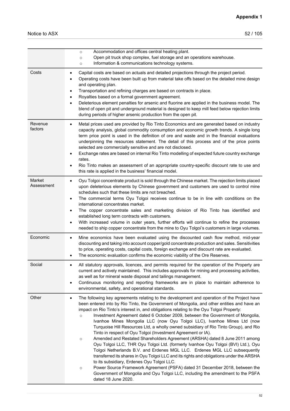 Appendix 1 Notice to ASX 52 / 105 52 o Accommodation and offices central heating plant. o Open pit truck shop complex, fuel storage and an operations warehouse. o Information & communications technology systems. Costs • Capital costs are based on actuals and detailed projections through the project period. • Operating costs have been built up from material take offs based on the detailed mine design and operating plan. • Transportation and refining charges are based on contracts in place. • Royalties based on a formal government agreement. • Deleterious element penalties for arsenic and fluorine are applied in the business model. The blend of open pit and underground material is designed to keep mill feed below rejection limits during periods of higher arsenic production from the open pit. Revenue factors • Metal prices used are provided by Rio Tinto Economics and are generated based on industry capacity analysis, global commodity consumption and economic growth trends. A single long term price point is used in the definition of ore and waste and in the financial evaluations underpinning the resources statement. The detail of this process and of the price points selected are commercially sensitive and are not disclosed. • Exchange rates are based on internal Rio Tinto modelling of expected future country exchange rates. • Rio Tinto makes an assessment of an appropriate country-specific discount rate to use and this rate is applied in the business’ financial model. Market Assessment • Oyu Tolgoi concentrate product is sold through the Chinese market. The rejection limits placed upon deleterious elements by Chinese government and customers are used to control mine schedules such that these limits are not breached. • The commercial terms Oyu Tolgoi receives continue to be in line with conditions on the international concentrates market. • The copper concentrate sales and marketing division of Rio Tinto has identified and established long term contracts with customers. • With increased volume in outer years, further efforts will continue to refine the processes needed to ship copper concentrate from the mine to Oyu Tolgoi’s customers in large volumes. Economic • Mine economics have been evaluated using the discounted cash flow method, mid-year discounting and taking into account copper/gold concentrate production and sales. Sensitivities to price, operating costs, capital costs, foreign exchange and discount rate are evaluated. • The economic evaluation confirms the economic viability of the Ore Reserves. Social • All statutory approvals, licences, and permits required for the operation of the Property are current and actively maintained. This includes approvals for mining and processing activities, as well as for mineral waste disposal and tailings management. • Continuous monitoring and reporting frameworks are in place to maintain adherence to environmental, safety, and operational standards. Other • The following key agreements relating to the development and operation of the Project have been entered into by Rio Tinto, the Government of Mongolia, and other entities and have an impact on Rio Tinto’s interest in, and obligations relating to the Oyu Tolgoi Property: o Investment Agreement dated 6 October 2009, between the Government of Mongolia, Ivanhoe Mines Mongolia LLC (now Oyu Tolgoi LLC), Ivanhoe Mines Ltd (now Turquoise Hill Resources Ltd, a wholly owned subsidiary of Rio Tinto Group), and Rio Tinto in respect of Oyu Tolgoi (Investment Agreement or IA). o Amended and Restated Shareholders Agreement (ARSHA) dated 8 June 2011 among Oyu Tolgoi LLC, THR Oyu Tolgoi Ltd. (formerly Ivanhoe Oyu Tolgoi (BVI) Ltd.), Oyu Tolgoi Netherlands B.V. and Erdenes MGL LLC. Erdenes MGL LLC subsequently transferred its shares in Oyu Tolgoi LLC and its rights and obligations under the ARSHA to its subsidiary, Erdenes Oyu Tolgoi LLC. o Power Source Framework Agreement (PSFA) dated 31 December 2018, between the Government of Mongolia and Oyu Tolgoi LLC, including the amendment to the PSFA dated 18 June 2020.