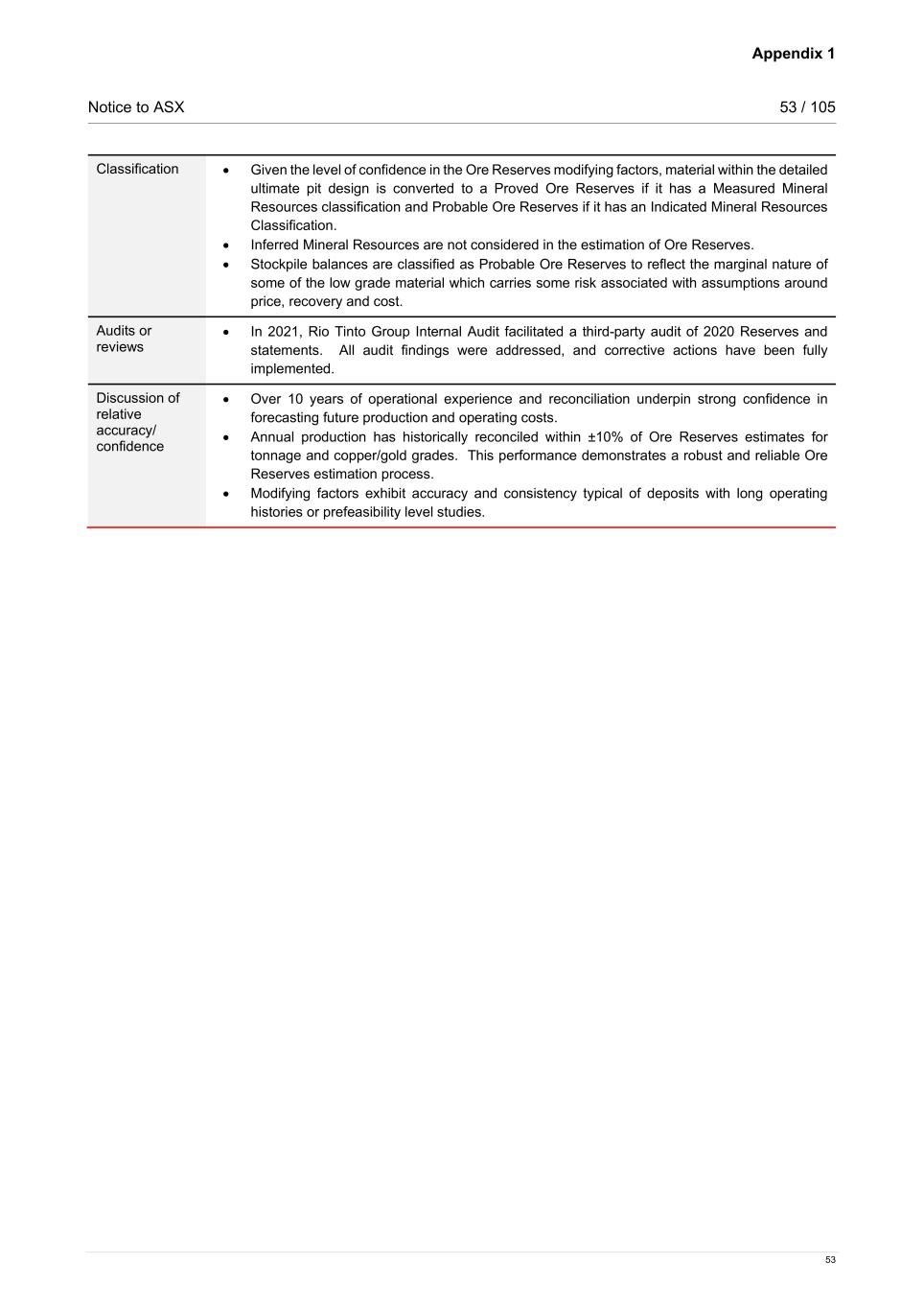 Appendix 1 Notice to ASX 53 / 105 53 Classification • Given the level of confidence in the Ore Reserves modifying factors, material within the detailed ultimate pit design is converted to a Proved Ore Reserves if it has a Measured Mineral Resources classification and Probable Ore Reserves if it has an Indicated Mineral Resources Classification. • Inferred Mineral Resources are not considered in the estimation of Ore Reserves. • Stockpile balances are classified as Probable Ore Reserves to reflect the marginal nature of some of the low grade material which carries some risk associated with assumptions around price, recovery and cost. Audits or reviews • In 2021, Rio Tinto Group Internal Audit facilitated a third-party audit of 2020 Reserves and statements. All audit findings were addressed, and corrective actions have been fully implemented. Discussion of relative accuracy/ confidence • Over 10 years of operational experience and reconciliation underpin strong confidence in forecasting future production and operating costs. • Annual production has historically reconciled within ±10% of Ore Reserves estimates for tonnage and copper/gold grades. This performance demonstrates a robust and reliable Ore Reserves estimation process. • Modifying factors exhibit accuracy and consistency typical of deposits with long operating histories or prefeasibility level studies.