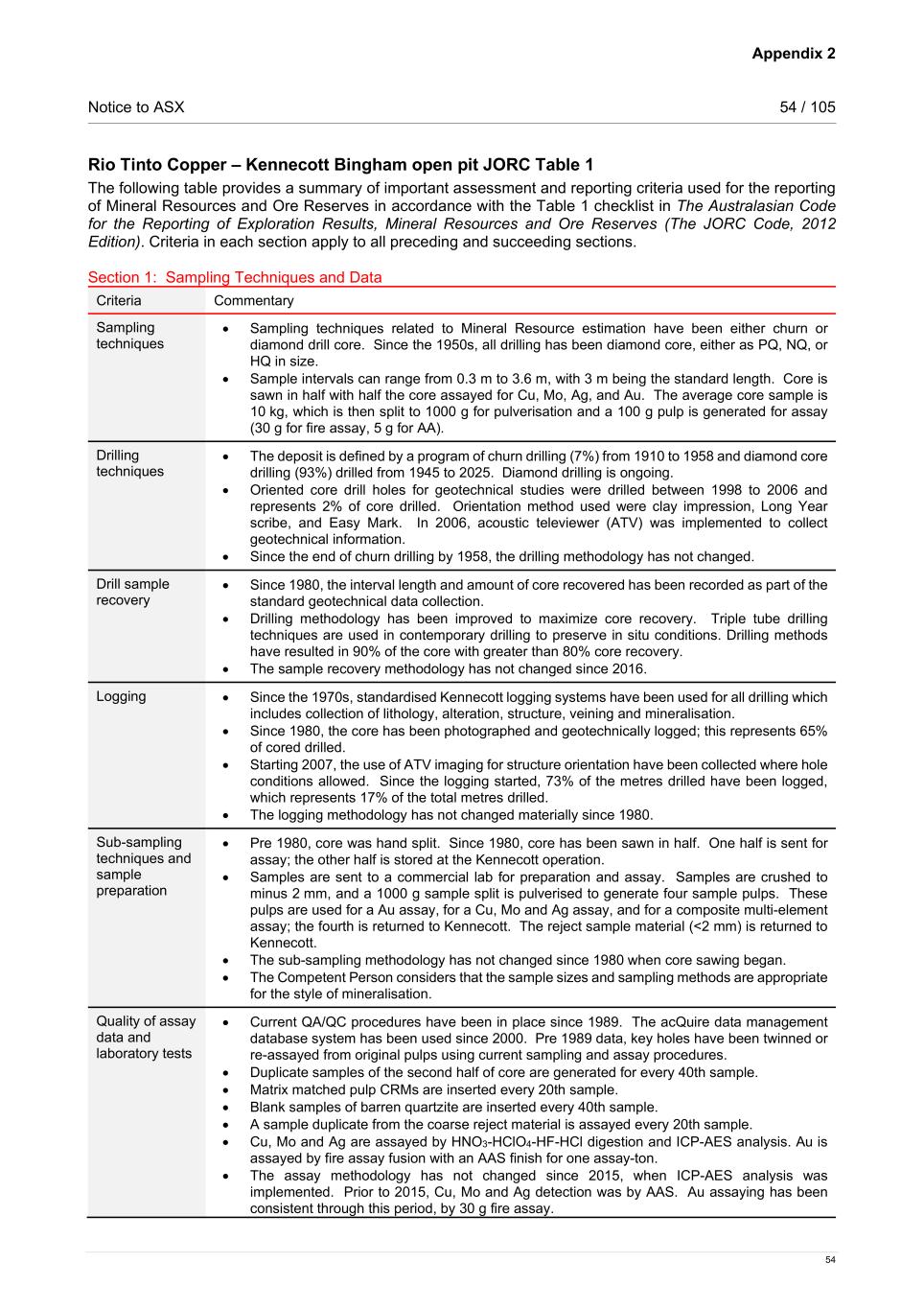 Appendix 2 Notice to ASX 54 / 105 54 Rio Tinto Copper – Kennecott Bingham open pit JORC Table 1 The following table provides a summary of important assessment and reporting criteria used for the reporting of Mineral Resources and Ore Reserves in accordance with the Table 1 checklist in The Australasian Code for the Reporting of Exploration Results, Mineral Resources and Ore Reserves (The JORC Code, 2012 Edition). Criteria in each section apply to all preceding and succeeding sections. Section 1: Sampling Techniques and Data Criteria Commentary Sampling techniques • Sampling techniques related to Mineral Resource estimation have been either churn or diamond drill core. Since the 1950s, all drilling has been diamond core, either as PQ, NQ, or HQ in size. • Sample intervals can range from 0.3 m to 3.6 m, with 3 m being the standard length. Core is sawn in half with half the core assayed for Cu, Mo, Ag, and Au. The average core sample is 10 kg, which is then split to 1000 g for pulverisation and a 100 g pulp is generated for assay (30 g for fire assay, 5 g for AA). Drilling techniques • The deposit is defined by a program of churn drilling (7%) from 1910 to 1958 and diamond core drilling (93%) drilled from 1945 to 2025. Diamond drilling is ongoing. • Oriented core drill holes for geotechnical studies were drilled between 1998 to 2006 and represents 2% of core drilled. Orientation method used were clay impression, Long Year scribe, and Easy Mark. In 2006, acoustic televiewer (ATV) was implemented to collect geotechnical information. • Since the end of churn drilling by 1958, the drilling methodology has not changed. Drill sample recovery • Since 1980, the interval length and amount of core recovered has been recorded as part of the standard geotechnical data collection. • Drilling methodology has been improved to maximize core recovery. Triple tube drilling techniques are used in contemporary drilling to preserve in situ conditions. Drilling methods have resulted in 90% of the core with greater than 80% core recovery. • The sample recovery methodology has not changed since 2016. Logging • Since the 1970s, standardised Kennecott logging systems have been used for all drilling which includes collection of lithology, alteration, structure, veining and mineralisation. • Since 1980, the core has been photographed and geotechnically logged; this represents 65% of cored drilled. • Starting 2007, the use of ATV imaging for structure orientation have been collected where hole conditions allowed. Since the logging started, 73% of the metres drilled have been logged, which represents 17% of the total metres drilled. • The logging methodology has not changed materially since 1980. Sub-sampling techniques and sample preparation • Pre 1980, core was hand split. Since 1980, core has been sawn in half. One half is sent for assay; the other half is stored at the Kennecott operation. • Samples are sent to a commercial lab for preparation and assay. Samples are crushed to minus 2 mm, and a 1000 g sample split is pulverised to generate four sample pulps. These pulps are used for a Au assay, for a Cu, Mo and Ag assay, and for a composite multi-element assay; the fourth is returned to Kennecott. The reject sample material (<2 mm) is returned to Kennecott. • The sub-sampling methodology has not changed since 1980 when core sawing began. • The Competent Person considers that the sample sizes and sampling methods are appropriate for the style of mineralisation. Quality of assay data and laboratory tests • Current QA/QC procedures have been in place since 1989. The acQuire data management database system has been used since 2000. Pre 1989 data, key holes have been twinned or re-assayed from original pulps using current sampling and assay procedures. • Duplicate samples of the second half of core are generated for every 40th sample. • Matrix matched pulp CRMs are inserted every 20th sample. • Blank samples of barren quartzite are inserted every 40th sample. • A sample duplicate from the coarse reject material is assayed every 20th sample. • Cu, Mo and Ag are assayed by HNO3-HClO4-HF-HCl digestion and ICP-AES analysis. Au is assayed by fire assay fusion with an AAS finish for one assay-ton. • The assay methodology has not changed since 2015, when ICP-AES analysis was implemented. Prior to 2015, Cu, Mo and Ag detection was by AAS. Au assaying has been consistent through this period, by 30 g fire assay.
