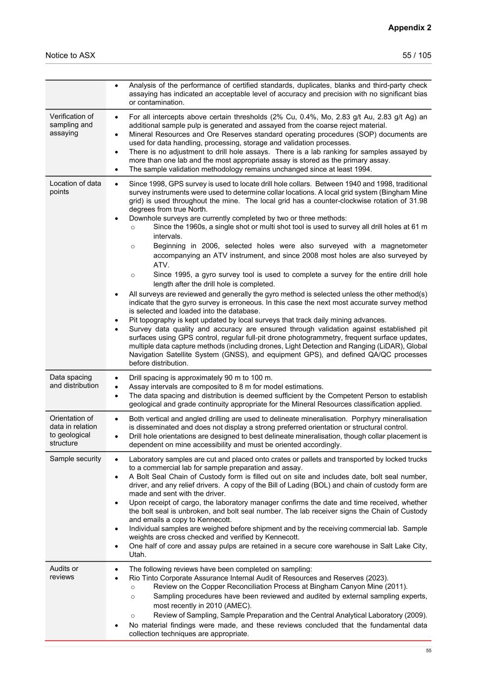 Appendix 2 Notice to ASX 55 / 105 55 • Analysis of the performance of certified standards, duplicates, blanks and third-party check assaying has indicated an acceptable level of accuracy and precision with no significant bias or contamination. Verification of sampling and assaying • For all intercepts above certain thresholds (2% Cu, 0.4%, Mo, 2.83 g/t Au, 2.83 g/t Ag) an additional sample pulp is generated and assayed from the coarse reject material. • Mineral Resources and Ore Reserves standard operating procedures (SOP) documents are used for data handling, processing, storage and validation processes. • There is no adjustment to drill hole assays. There is a lab ranking for samples assayed by more than one lab and the most appropriate assay is stored as the primary assay. • The sample validation methodology remains unchanged since at least 1994. Location of data points • Since 1998, GPS survey is used to locate drill hole collars. Between 1940 and 1998, traditional survey instruments were used to determine collar locations. A local grid system (Bingham Mine grid) is used throughout the mine. The local grid has a counter-clockwise rotation of 31.98 degrees from true North. • Downhole surveys are currently completed by two or three methods: o Since the 1960s, a single shot or multi shot tool is used to survey all drill holes at 61 m intervals. o Beginning in 2006, selected holes were also surveyed with a magnetometer accompanying an ATV instrument, and since 2008 most holes are also surveyed by ATV. o Since 1995, a gyro survey tool is used to complete a survey for the entire drill hole length after the drill hole is completed. • All surveys are reviewed and generally the gyro method is selected unless the other method(s) indicate that the gyro survey is erroneous. In this case the next most accurate survey method is selected and loaded into the database. • Pit topography is kept updated by local surveys that track daily mining advances. • Survey data quality and accuracy are ensured through validation against established pit surfaces using GPS control, regular full‑pit drone photogrammetry, frequent surface updates, multiple data capture methods (including drones, Light Detection and Ranging (LiDAR), Global Navigation Satellite System (GNSS), and equipment GPS), and defined QA/QC processes before distribution. Data spacing and distribution • Drill spacing is approximately 90 m to 100 m. • Assay intervals are composited to 8 m for model estimations. • The data spacing and distribution is deemed sufficient by the Competent Person to establish geological and grade continuity appropriate for the Mineral Resources classification applied. Orientation of data in relation to geological structure • Both vertical and angled drilling are used to delineate mineralisation. Porphyry mineralisation is disseminated and does not display a strong preferred orientation or structural control. • Drill hole orientations are designed to best delineate mineralisation, though collar placement is dependent on mine accessibility and must be oriented accordingly. Sample security • Laboratory samples are cut and placed onto crates or pallets and transported by locked trucks to a commercial lab for sample preparation and assay. • A Bolt Seal Chain of Custody form is filled out on site and includes date, bolt seal number, driver, and any relief drivers. A copy of the Bill of Lading (BOL) and chain of custody form are made and sent with the driver. • Upon receipt of cargo, the laboratory manager confirms the date and time received, whether the bolt seal is unbroken, and bolt seal number. The lab receiver signs the Chain of Custody and emails a copy to Kennecott. • Individual samples are weighed before shipment and by the receiving commercial lab. Sample weights are cross checked and verified by Kennecott. • One half of core and assay pulps are retained in a secure core warehouse in Salt Lake City, Utah. Audits or reviews • The following reviews have been completed on sampling: • Rio Tinto Corporate Assurance Internal Audit of Resources and Reserves (2023). o Review on the Copper Reconciliation Process at Bingham Canyon Mine (2011). o Sampling procedures have been reviewed and audited by external sampling experts, most recently in 2010 (AMEC). o Review of Sampling, Sample Preparation and the Central Analytical Laboratory (2009). • No material findings were made, and these reviews concluded that the fundamental data collection techniques are appropriate.