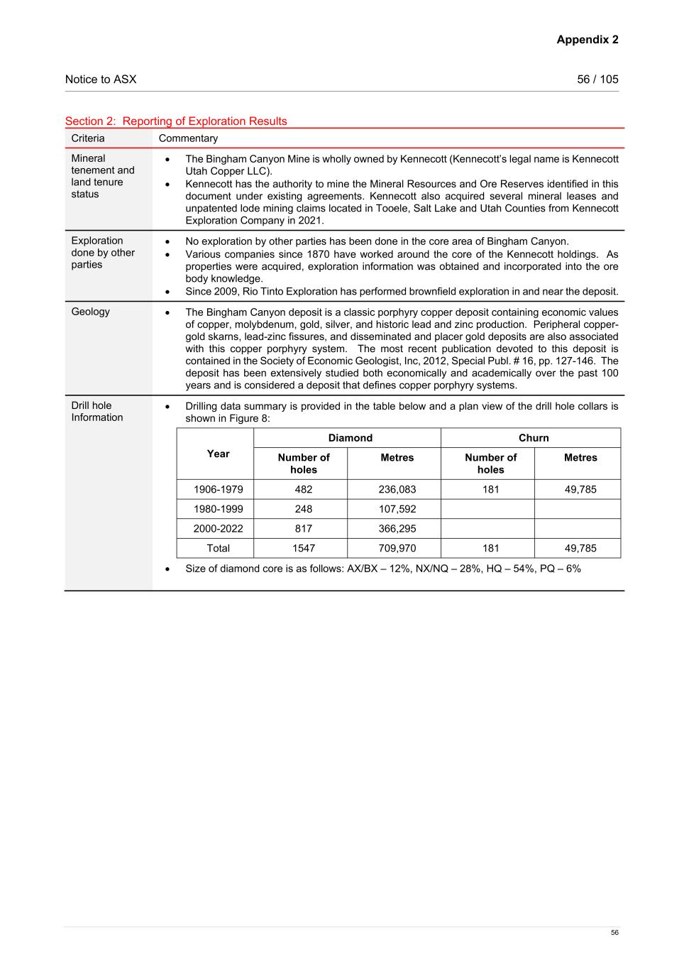 Appendix 2 Notice to ASX 56 / 105 56 Section 2: Reporting of Exploration Results Criteria Commentary Mineral tenement and land tenure status • The Bingham Canyon Mine is wholly owned by Kennecott (Kennecott’s legal name is Kennecott Utah Copper LLC). • Kennecott has the authority to mine the Mineral Resources and Ore Reserves identified in this document under existing agreements. Kennecott also acquired several mineral leases and unpatented lode mining claims located in Tooele, Salt Lake and Utah Counties from Kennecott Exploration Company in 2021. Exploration done by other parties • No exploration by other parties has been done in the core area of Bingham Canyon. • Various companies since 1870 have worked around the core of the Kennecott holdings. As properties were acquired, exploration information was obtained and incorporated into the ore body knowledge. • Since 2009, Rio Tinto Exploration has performed brownfield exploration in and near the deposit. Geology • The Bingham Canyon deposit is a classic porphyry copper deposit containing economic values of copper, molybdenum, gold, silver, and historic lead and zinc production. Peripheral copper- gold skarns, lead-zinc fissures, and disseminated and placer gold deposits are also associated with this copper porphyry system. The most recent publication devoted to this deposit is contained in the Society of Economic Geologist, Inc, 2012, Special Publ. # 16, pp. 127-146. The deposit has been extensively studied both economically and academically over the past 100 years and is considered a deposit that defines copper porphyry systems. Drill hole Information • Drilling data summary is provided in the table below and a plan view of the drill hole collars is shown in Figure 8: Year Diamond Churn Number of holes Metres Number of holes Metres 1906-1979 482 236,083 181 49,785 1980-1999 248 107,592 2000-2022 817 366,295 Total 1547 709,970 181 49,785 • Size of diamond core is as follows: AX/BX – 12%, NX/NQ – 28%, HQ – 54%, PQ – 6%