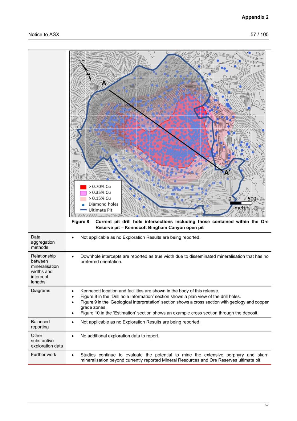 Appendix 2 Notice to ASX 57 / 105 57 Figure 8 Current pit drill hole intersections including those contained within the Ore Reserve pit – Kennecott Bingham Canyon open pit Data aggregation methods • Not applicable as no Exploration Results are being reported. Relationship between mineralisation widths and intercept lengths • Downhole intercepts are reported as true width due to disseminated mineralisation that has no preferred orientation. Diagrams • Kennecott location and facilities are shown in the body of this release. • Figure 8 in the ‘Drill hole Information’ section shows a plan view of the drill holes. • Figure 9 in the ‘Geological Interpretation’ section shows a cross section with geology and copper grade zones. • Figure 10 in the ‘Estimation’ section shows an example cross section through the deposit. Balanced reporting • Not applicable as no Exploration Results are being reported. Other substantive exploration data • No additional exploration data to report. Further work • Studies continue to evaluate the potential to mine the extensive porphyry and skarn mineralisation beyond currently reported Mineral Resources and Ore Reserves ultimate pit.