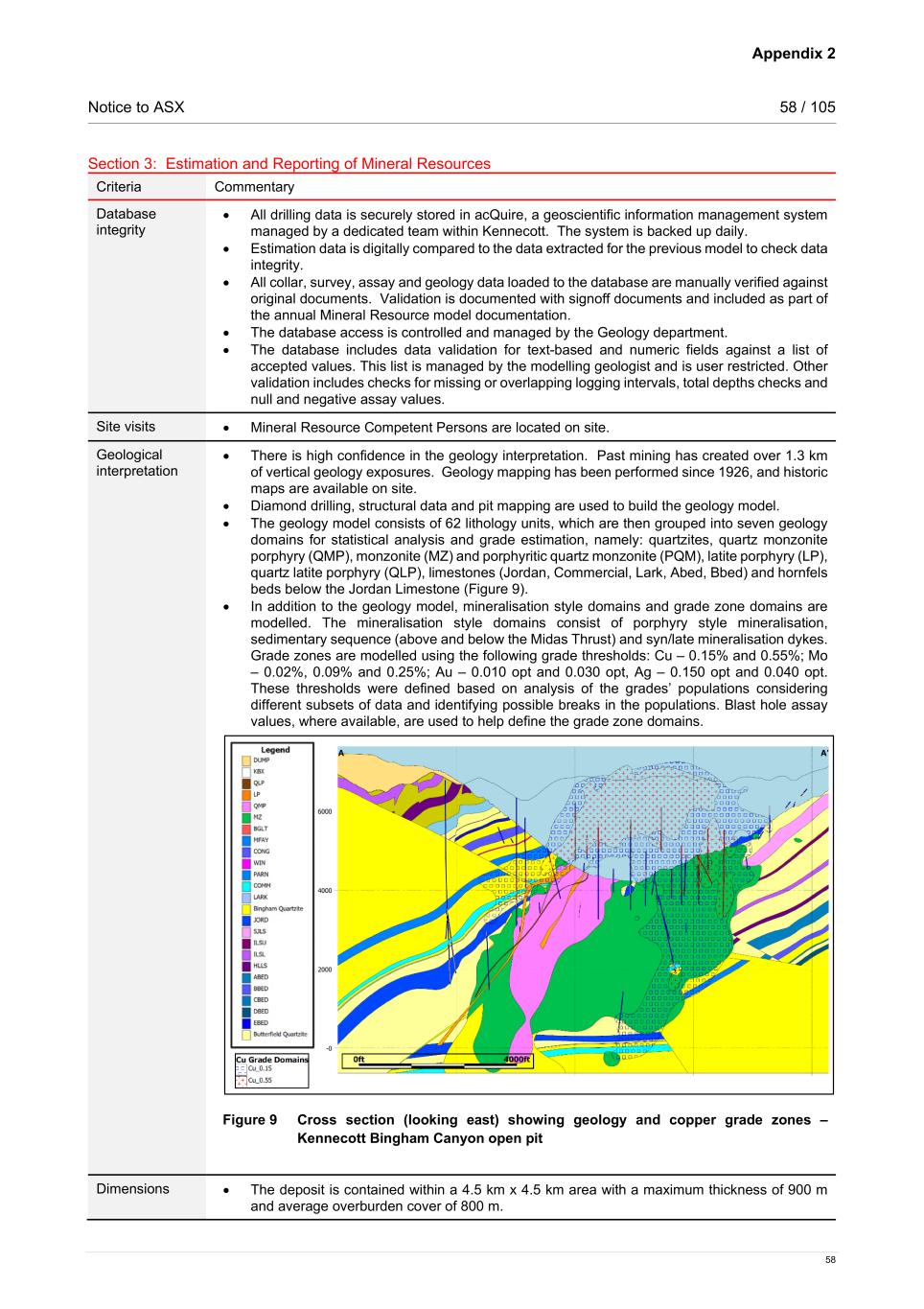 Appendix 2 Notice to ASX 58 / 105 58 Section 3: Estimation and Reporting of Mineral Resources Criteria Commentary Database integrity • All drilling data is securely stored in acQuire, a geoscientific information management system managed by a dedicated team within Kennecott. The system is backed up daily. • Estimation data is digitally compared to the data extracted for the previous model to check data integrity. • All collar, survey, assay and geology data loaded to the database are manually verified against original documents. Validation is documented with signoff documents and included as part of the annual Mineral Resource model documentation. • The database access is controlled and managed by the Geology department. • The database includes data validation for text-based and numeric fields against a list of accepted values. This list is managed by the modelling geologist and is user restricted. Other validation includes checks for missing or overlapping logging intervals, total depths checks and null and negative assay values. Site visits • Mineral Resource Competent Persons are located on site. Geological interpretation • There is high confidence in the geology interpretation. Past mining has created over 1.3 km of vertical geology exposures. Geology mapping has been performed since 1926, and historic maps are available on site. • Diamond drilling, structural data and pit mapping are used to build the geology model. • The geology model consists of 62 lithology units, which are then grouped into seven geology domains for statistical analysis and grade estimation, namely: quartzites, quartz monzonite porphyry (QMP), monzonite (MZ) and porphyritic quartz monzonite (PQM), latite porphyry (LP), quartz latite porphyry (QLP), limestones (Jordan, Commercial, Lark, Abed, Bbed) and hornfels beds below the Jordan Limestone (Figure 9). • In addition to the geology model, mineralisation style domains and grade zone domains are modelled. The mineralisation style domains consist of porphyry style mineralisation, sedimentary sequence (above and below the Midas Thrust) and syn/late mineralisation dykes. Grade zones are modelled using the following grade thresholds: Cu – 0.15% and 0.55%; Mo – 0.02%, 0.09% and 0.25%; Au – 0.010 opt and 0.030 opt, Ag – 0.150 opt and 0.040 opt. These thresholds were defined based on analysis of the grades’ populations considering different subsets of data and identifying possible breaks in the populations. Blast hole assay values, where available, are used to help define the grade zone domains. Figure 9 Cross section (looking east) showing geology and copper grade zones – Kennecott Bingham Canyon open pit Dimensions • The deposit is contained within a 4.5 km x 4.5 km area with a maximum thickness of 900 m and average overburden cover of 800 m.