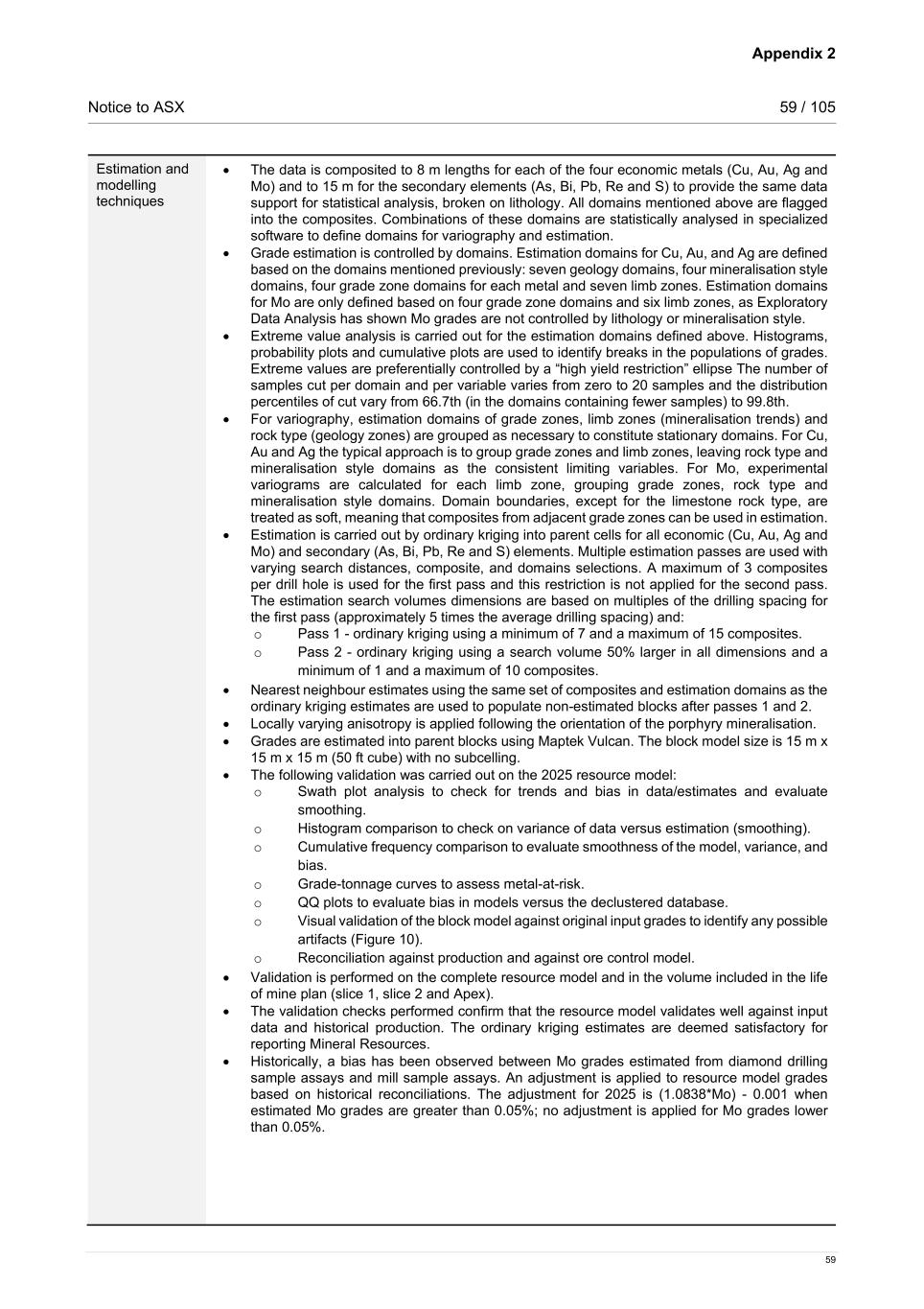 Appendix 2 Notice to ASX 59 / 105 59 Estimation and modelling techniques • The data is composited to 8 m lengths for each of the four economic metals (Cu, Au, Ag and Mo) and to 15 m for the secondary elements (As, Bi, Pb, Re and S) to provide the same data support for statistical analysis, broken on lithology. All domains mentioned above are flagged into the composites. Combinations of these domains are statistically analysed in specialized software to define domains for variography and estimation. • Grade estimation is controlled by domains. Estimation domains for Cu, Au, and Ag are defined based on the domains mentioned previously: seven geology domains, four mineralisation style domains, four grade zone domains for each metal and seven limb zones. Estimation domains for Mo are only defined based on four grade zone domains and six limb zones, as Exploratory Data Analysis has shown Mo grades are not controlled by lithology or mineralisation style. • Extreme value analysis is carried out for the estimation domains defined above. Histograms, probability plots and cumulative plots are used to identify breaks in the populations of grades. Extreme values are preferentially controlled by a “high yield restriction” ellipse The number of samples cut per domain and per variable varies from zero to 20 samples and the distribution percentiles of cut vary from 66.7th (in the domains containing fewer samples) to 99.8th. • For variography, estimation domains of grade zones, limb zones (mineralisation trends) and rock type (geology zones) are grouped as necessary to constitute stationary domains. For Cu, Au and Ag the typical approach is to group grade zones and limb zones, leaving rock type and mineralisation style domains as the consistent limiting variables. For Mo, experimental variograms are calculated for each limb zone, grouping grade zones, rock type and mineralisation style domains. Domain boundaries, except for the limestone rock type, are treated as soft, meaning that composites from adjacent grade zones can be used in estimation. • Estimation is carried out by ordinary kriging into parent cells for all economic (Cu, Au, Ag and Mo) and secondary (As, Bi, Pb, Re and S) elements. Multiple estimation passes are used with varying search distances, composite, and domains selections. A maximum of 3 composites per drill hole is used for the first pass and this restriction is not applied for the second pass. The estimation search volumes dimensions are based on multiples of the drilling spacing for the first pass (approximately 5 times the average drilling spacing) and: o Pass 1 - ordinary kriging using a minimum of 7 and a maximum of 15 composites. o Pass 2 - ordinary kriging using a search volume 50% larger in all dimensions and a minimum of 1 and a maximum of 10 composites. • Nearest neighbour estimates using the same set of composites and estimation domains as the ordinary kriging estimates are used to populate non-estimated blocks after passes 1 and 2. • Locally varying anisotropy is applied following the orientation of the porphyry mineralisation. • Grades are estimated into parent blocks using Maptek Vulcan. The block model size is 15 m x 15 m x 15 m (50 ft cube) with no subcelling. • The following validation was carried out on the 2025 resource model: o Swath plot analysis to check for trends and bias in data/estimates and evaluate smoothing. o Histogram comparison to check on variance of data versus estimation (smoothing). o Cumulative frequency comparison to evaluate smoothness of the model, variance, and bias. o Grade-tonnage curves to assess metal-at-risk. o QQ plots to evaluate bias in models versus the declustered database. o Visual validation of the block model against original input grades to identify any possible artifacts (Figure 10). o Reconciliation against production and against ore control model. • Validation is performed on the complete resource model and in the volume included in the life of mine plan (slice 1, slice 2 and Apex). • The validation checks performed confirm that the resource model validates well against input data and historical production. The ordinary kriging estimates are deemed satisfactory for reporting Mineral Resources. • Historically, a bias has been observed between Mo grades estimated from diamond drilling sample assays and mill sample assays. An adjustment is applied to resource model grades based on historical reconciliations. The adjustment for 2025 is (1.0838*Mo) - 0.001 when estimated Mo grades are greater than 0.05%; no adjustment is applied for Mo grades lower than 0.05%.