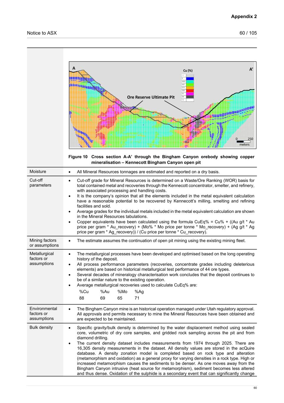 Appendix 2 Notice to ASX 60 / 105 60 Figure 10 Cross section A-A’ through the Bingham Canyon orebody showing copper mineralisation – Kennecott Bingham Canyon open pit Moisture • All Mineral Resources tonnages are estimated and reported on a dry basis. Cut-off parameters • Cut-off grade for Mineral Resources is determined on a Waste/Ore Ranking (WOR) basis for total contained metal and recoveries through the Kennecott concentrator, smelter, and refinery, with associated processing and handling costs.    • It is the company’s opinion that all the elements included in the metal equivalent calculation have a reasonable potential to be recovered by Kennecott’s milling, smelting and refining facilities and sold. • Average grades for the individual metals included in the metal equivalent calculation are shown in the Mineral Resources tabulations. • Copper equivalents have been calculated using the formula CuEq% = Cu% + ((Au g/t * Au price per gram * Au_recovery) + (Mo% * Mo price per tonne * Mo_recovery) + (Ag g/t * Ag price per gram * Ag_recovery)) / (Cu price per tonne * Cu_recovery). Mining factors or assumptions • The estimate assumes the continuation of open pit mining using the existing mining fleet. Metallurgical factors or assumptions • The metallurgical processes have been developed and optimised based on the long operating history of the deposit. • All process performance parameters (recoveries, concentrate grades including deleterious elements) are based on historical metallurgical test performance of 44 ore types. • Several decades of mineralogy characterisation work concludes that the deposit continues to be of a similar nature to the existing operation. • Average metallurgical recoveries used to calculate CuEq% are: %Cu %Au %Mo %Ag 88 69 65 71 Environmental factors or assumptions • The Bingham Canyon mine is an historical operation managed under Utah regulatory approval. All approvals and permits necessary to mine the Mineral Resources have been obtained and are expected to be maintained. Bulk density • Specific gravity/bulk density is determined by the water displacement method using sealed core, volumetric of dry core samples, and gridded rock sampling across the pit and from diamond drilling. • The current density dataset includes measurements from 1974 through 2025. There are 16,305 density measurements in the dataset. All density values are stored in the acQuire database. A density zonation model is completed based on rock type and alteration (metamorphism and oxidation) as a general proxy for varying densities in a rock type. High or increased metamorphism causes the sediments to be denser. As one moves away from the Bingham Canyon intrusive (heat source for metamorphism), sediment becomes less altered and thus dense. Oxidation of the sulphide is a secondary event that can significantly change