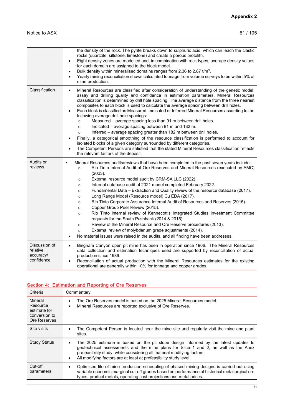 Appendix 2 Notice to ASX 61 / 105 61 the density of the rock. The pyrite breaks down to sulphuric acid, which can leach the clastic rocks (quartzite, siltstone, limestone) and create a porous protolith. • Eight density zones are modelled and, in combination with rock types, average density values for each domain are assigned to the block model. • Bulk density within mineralised domains ranges from 2.36 to 2.87 t/m3. • Yearly mining reconciliation shows calculated tonnage from volume surveys to be within 5% of mine production. Classification • Mineral Resources are classified after consideration of understanding of the genetic model, assay and drilling quality and confidence in estimation parameters. Mineral Resources classification is determined by drill hole spacing. The average distance from the three nearest composites to each block is used to calculate the average spacing between drill holes. • Each block is classified as Measured, Indicated or Inferred Mineral Resources according to the following average drill hole spacings: o Measured – average spacing less than 91 m between drill holes. o Indicated – average spacing between 91 m and 182 m. o Inferred – average spacing greater than 182 m between drill holes. • Finally, a categorical smoothing of the resource classification is performed to account for isolated blocks of a given category surrounded by different categories. • The Competent Persons are satisfied that the stated Mineral Resources classification reflects the relevant factors of the deposit. Audits or reviews • Mineral Resources audits/reviews that have been completed in the past seven years include: o Rio Tinto Internal Audit of Ore Reserves and Mineral Resources (executed by AMC) (2023). o External resource model audit by CRM-SA LLC (2022). o Internal database audit of 2021 model completed February 2022. o Fundamental Data – Extraction and Quality review of the resource database (2017). o Long Range Model (Resource model) Cu EDA (2017). o Rio Tinto Corporate Assurance Internal Audit of Resources and Reserves (2015). o Copper Group Peer Review (2015). o Rio Tinto internal review of Kennecott’s Integrated Studies Investment Committee requests for the South Pushback (2014 & 2015). o Review of the Mineral Resource and Ore Reserve procedures (2013). o External review of molybdenum grade adjustments (2014). • No material issues were raised in the audits, and all finding have been addresses. Discussion of relative accuracy/ confidence • Bingham Canyon open pit mine has been in operation since 1906. The Mineral Resources data collection and estimation techniques used are supported by reconciliation of actual production since 1989. • Reconciliation of actual production with the Mineral Resources estimates for the existing operational are generally within 10% for tonnage and copper grades. Section 4: Estimation and Reporting of Ore Reserves Criteria Commentary Mineral Resource estimate for conversion to Ore Reserves • The Ore Reserves model is based on the 2025 Mineral Resources model. • Mineral Resources are reported exclusive of Ore Reserves. Site visits • The Competent Person is located near the mine site and regularly visit the mine and plant sites. Study Status • The 2025 estimate is based on the pit slope design informed by the latest updates to geotechnical assessments and the mine plans for Slice 1 and 2, as well as the Apex prefeasibility study, while considering all material modifying factors. • All modifying factors are at least at prefeasibility study level. Cut-off parameters • Optimised life of mine production scheduling of phased mining designs is carried out using variable economic marginal cut-off grades based on performance of historical metallurgical ore types, product metals, operating cost projections and metal prices.
