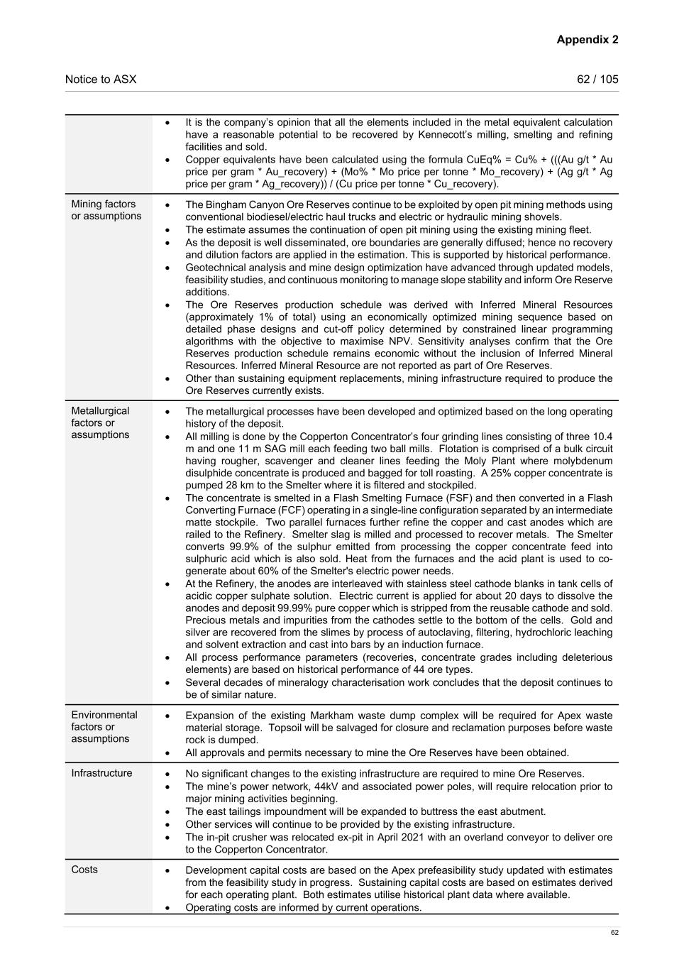 Appendix 2 Notice to ASX 62 / 105 62 • It is the company’s opinion that all the elements included in the metal equivalent calculation have a reasonable potential to be recovered by Kennecott’s milling, smelting and refining facilities and sold. • Copper equivalents have been calculated using the formula CuEq% = Cu% + (((Au g/t * Au price per gram * Au_recovery) + (Mo% * Mo price per tonne * Mo_recovery) + (Ag g/t * Ag price per gram * Ag_recovery)) / (Cu price per tonne * Cu_recovery). Mining factors or assumptions • The Bingham Canyon Ore Reserves continue to be exploited by open pit mining methods using conventional biodiesel/electric haul trucks and electric or hydraulic mining shovels. • The estimate assumes the continuation of open pit mining using the existing mining fleet. • As the deposit is well disseminated, ore boundaries are generally diffused; hence no recovery and dilution factors are applied in the estimation. This is supported by historical performance. • Geotechnical analysis and mine design optimization have advanced through updated models, feasibility studies, and continuous monitoring to manage slope stability and inform Ore Reserve additions. • The Ore Reserves production schedule was derived with Inferred Mineral Resources (approximately 1% of total) using an economically optimized mining sequence based on detailed phase designs and cut-off policy determined by constrained linear programming algorithms with the objective to maximise NPV. Sensitivity analyses confirm that the Ore Reserves production schedule remains economic without the inclusion of Inferred Mineral Resources. Inferred Mineral Resource are not reported as part of Ore Reserves. • Other than sustaining equipment replacements, mining infrastructure required to produce the Ore Reserves currently exists. Metallurgical factors or assumptions • The metallurgical processes have been developed and optimized based on the long operating history of the deposit. • All milling is done by the Copperton Concentrator’s four grinding lines consisting of three 10.4 m and one 11 m SAG mill each feeding two ball mills. Flotation is comprised of a bulk circuit having rougher, scavenger and cleaner lines feeding the Moly Plant where molybdenum disulphide concentrate is produced and bagged for toll roasting. A 25% copper concentrate is pumped 28 km to the Smelter where it is filtered and stockpiled. • The concentrate is smelted in a Flash Smelting Furnace (FSF) and then converted in a Flash Converting Furnace (FCF) operating in a single-line configuration separated by an intermediate matte stockpile. Two parallel furnaces further refine the copper and cast anodes which are railed to the Refinery. Smelter slag is milled and processed to recover metals. The Smelter converts 99.9% of the sulphur emitted from processing the copper concentrate feed into sulphuric acid which is also sold. Heat from the furnaces and the acid plant is used to co- generate about 60% of the Smelter's electric power needs. • At the Refinery, the anodes are interleaved with stainless steel cathode blanks in tank cells of acidic copper sulphate solution. Electric current is applied for about 20 days to dissolve the anodes and deposit 99.99% pure copper which is stripped from the reusable cathode and sold. Precious metals and impurities from the cathodes settle to the bottom of the cells. Gold and silver are recovered from the slimes by process of autoclaving, filtering, hydrochloric leaching and solvent extraction and cast into bars by an induction furnace. • All process performance parameters (recoveries, concentrate grades including deleterious elements) are based on historical performance of 44 ore types. • Several decades of mineralogy characterisation work concludes that the deposit continues to be of similar nature. Environmental factors or assumptions • Expansion of the existing Markham waste dump complex will be required for Apex waste material storage. Topsoil will be salvaged for closure and reclamation purposes before waste rock is dumped. • All approvals and permits necessary to mine the Ore Reserves have been obtained. Infrastructure • No significant changes to the existing infrastructure are required to mine Ore Reserves. • The mine’s power network, 44kV and associated power poles, will require relocation prior to major mining activities beginning. • The east tailings impoundment will be expanded to buttress the east abutment. • Other services will continue to be provided by the existing infrastructure. • The in-pit crusher was relocated ex-pit in April 2021 with an overland conveyor to deliver ore to the Copperton Concentrator. Costs • Development capital costs are based on the Apex prefeasibility study updated with estimates from the feasibility study in progress. Sustaining capital costs are based on estimates derived for each operating plant. Both estimates utilise historical plant data where available. • Operating costs are informed by current operations.
