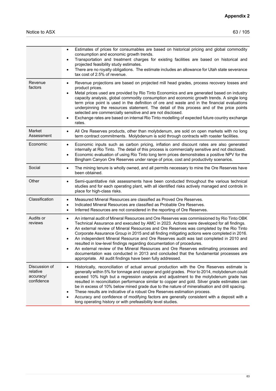 Appendix 2 Notice to ASX 63 / 105 63 • Estimates of prices for consumables are based on historical pricing and global commodity consumption and economic growth trends. • Transportation and treatment charges for existing facilities are based on historical and projected feasibility study estimates. • There are no royalty obligations. The estimate includes an allowance for Utah state severance tax cost of 2.5% of revenue. Revenue factors • Revenue projections are based on projected mill head grades, process recovery losses and product prices. • Metal prices used are provided by Rio Tinto Economics and are generated based on industry capacity analysis, global commodity consumption and economic growth trends. A single long term price point is used in the definition of ore and waste and in the financial evaluations underpinning the resources statement. The detail of this process and of the price points selected are commercially sensitive and are not disclosed. • Exchange rates are based on internal Rio Tinto modelling of expected future country exchange rates. Market Assessment • All Ore Reserves products, other than molybdenum, are sold on open markets with no long term contract commitments. Molybdenum is sold through contracts with roaster facilities. Economic • Economic inputs such as carbon pricing, inflation and discount rates are also generated internally at Rio Tinto. The detail of this process is commercially sensitive and not disclosed. • Economic evaluation of using Rio Tinto long term prices demonstrates a positive NPV for the Bingham Canyon Ore Reserves under range of price, cost and productivity scenarios. Social • The mining tenure is wholly owned, and all permits necessary to mine the Ore Reserves have been obtained. Other • Semi-quantitative risk assessments have been conducted throughout the various technical studies and for each operating plant, with all identified risks actively managed and controls in place for high-class risks. Classification • Measured Mineral Resources are classified as Proved Ore Reserves. • Indicated Mineral Resources are classified as Probable Ore Reserves. • Inferred Resources are not considered in the reporting of Ore Reserves. Audits or reviews • An internal audit of Mineral Resources and Ore Reserves was commissioned by Rio Tinto OBK Technical Assurance and executed by AMC in 2023. Actions were developed for all findings. • An external review of Mineral Resources and Ore Reserves was completed by the Rio Tinto Corporate Assurance Group in 2015 and all finding mitigating actions were completed in 2016. • An independent Mineral Resource and Ore Reserves audit was last completed in 2010 and resulted in low-level findings regarding documentation of procedures. • An external review of the Mineral Resources and Ore Reserves estimating processes and documentation was conducted in 2013 and concluded that the fundamental processes are appropriate. All audit findings have been fully addressed. Discussion of relative accuracy/ confidence • Historically, reconciliation of actual annual production with the Ore Reserves estimate is generally within 5% for tonnage and copper and gold grades. Prior to 2014, molybdenum could exceed 10% high but a regression analysis and adjustment to the molybdenum grade has resulted in reconciliation performance similar to copper and gold. Silver grade estimates can be in excess of 10% below mined grade due to the nature of mineralisation and drill spacing. • These results are indicative of a robust Ore Reserves estimation process. • Accuracy and confidence of modifying factors are generally consistent with a deposit with a long operating history or with prefeasibility level studies.