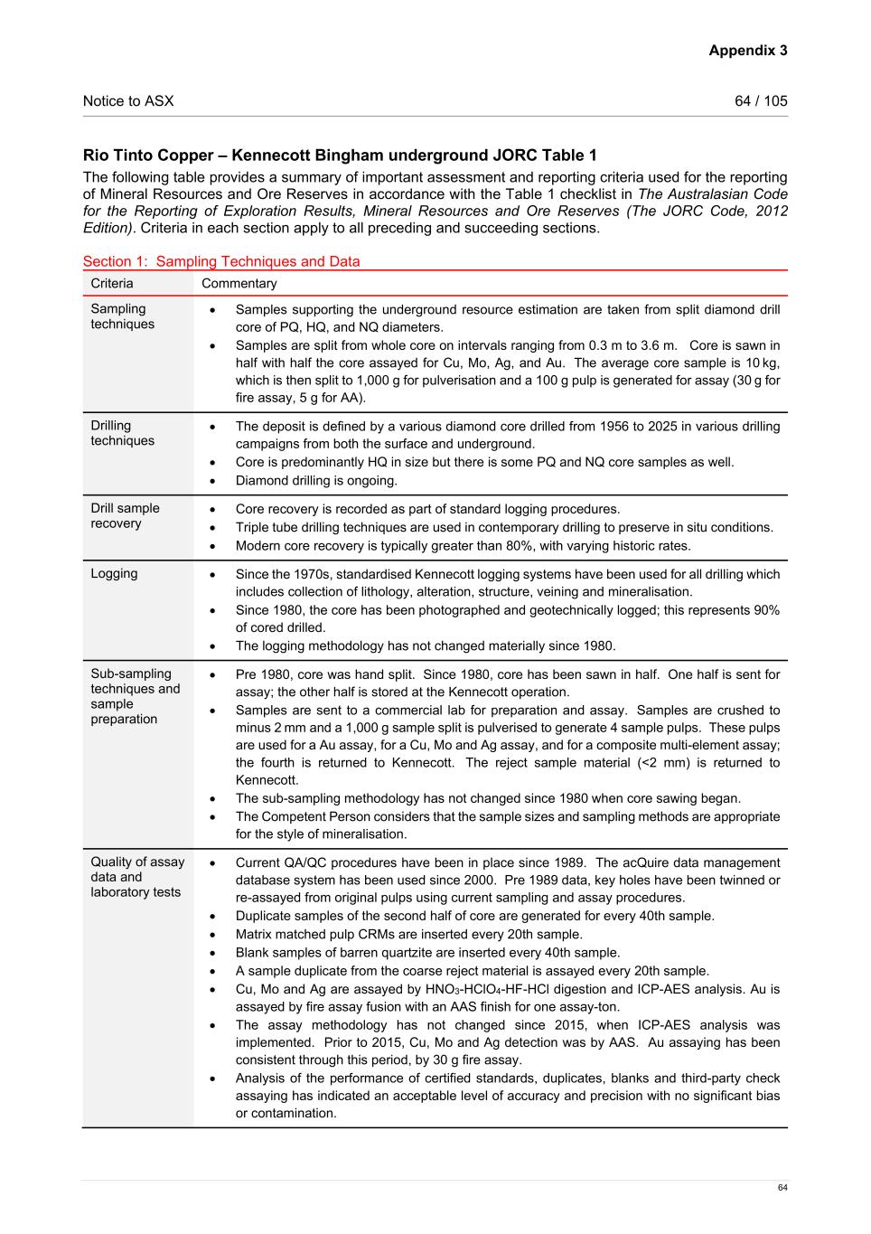 Appendix 3 Notice to ASX 64 / 105 64 Rio Tinto Copper – Kennecott Bingham underground JORC Table 1 The following table provides a summary of important assessment and reporting criteria used for the reporting of Mineral Resources and Ore Reserves in accordance with the Table 1 checklist in The Australasian Code for the Reporting of Exploration Results, Mineral Resources and Ore Reserves (The JORC Code, 2012 Edition). Criteria in each section apply to all preceding and succeeding sections. Section 1: Sampling Techniques and Data Criteria Commentary Sampling techniques • Samples supporting the underground resource estimation are taken from split diamond drill core of PQ, HQ, and NQ diameters.   • Samples are split from whole core on intervals ranging from 0.3 m to 3.6 m.    Core is sawn in half with half the core assayed for Cu, Mo, Ag, and Au. The average core sample is 10 kg, which is then split to 1,000 g for pulverisation and a 100 g pulp is generated for assay (30 g for fire assay, 5 g for AA). Drilling techniques • The deposit is defined by a various diamond core drilled from 1956 to 2025 in various drilling campaigns from both the surface and underground. • Core is predominantly HQ in size but there is some PQ and NQ core samples as well. • Diamond drilling is ongoing. Drill sample recovery • Core recovery is recorded as part of standard logging procedures.    • Triple tube drilling techniques are used in contemporary drilling to preserve in situ conditions.  • Modern core recovery is typically greater than 80%, with varying historic rates.  Logging • Since the 1970s, standardised Kennecott logging systems have been used for all drilling which includes collection of lithology, alteration, structure, veining and mineralisation. • Since 1980, the core has been photographed and geotechnically logged; this represents 90% of cored drilled. • The logging methodology has not changed materially since 1980. Sub-sampling techniques and sample preparation • Pre 1980, core was hand split. Since 1980, core has been sawn in half. One half is sent for assay; the other half is stored at the Kennecott operation.   • Samples are sent to a commercial lab for preparation and assay. Samples are crushed to minus 2 mm and a 1,000 g sample split is pulverised to generate 4 sample pulps. These pulps are used for a Au assay, for a Cu, Mo and Ag assay, and for a composite multi-element assay; the fourth is returned to Kennecott. The reject sample material (<2 mm) is returned to Kennecott. • The sub-sampling methodology has not changed since 1980 when core sawing began. • The Competent Person considers that the sample sizes and sampling methods are appropriate for the style of mineralisation. Quality of assay data and laboratory tests • Current QA/QC procedures have been in place since 1989. The acQuire data management database system has been used since 2000. Pre 1989 data, key holes have been twinned or re-assayed from original pulps using current sampling and assay procedures. • Duplicate samples of the second half of core are generated for every 40th sample. • Matrix matched pulp CRMs are inserted every 20th sample. • Blank samples of barren quartzite are inserted every 40th sample. • A sample duplicate from the coarse reject material is assayed every 20th sample. • Cu, Mo and Ag are assayed by HNO3-HClO4-HF-HCl digestion and ICP-AES analysis. Au is assayed by fire assay fusion with an AAS finish for one assay-ton. • The assay methodology has not changed since 2015, when ICP-AES analysis was implemented. Prior to 2015, Cu, Mo and Ag detection was by AAS. Au assaying has been consistent through this period, by 30 g fire assay. • Analysis of the performance of certified standards, duplicates, blanks and third-party check assaying has indicated an acceptable level of accuracy and precision with no significant bias or contamination.