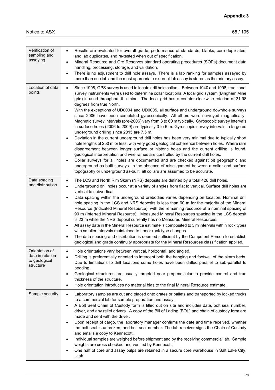 Appendix 3 Notice to ASX 65 / 105 65 Verification of sampling and assaying • Results are evaluated for overall grade, performance of standards, blanks, core duplicates, and lab duplicates, and re-tested when out of specification.   • Mineral Resource and Ore Reserves standard operating procedures (SOPs) document data handling, processing, storage, and validation.  • There is no adjustment to drill hole assays.  There is a lab ranking for samples assayed by more than one lab and the most appropriate external lab assay is stored as the primary assay.  Location of data points • Since 1998, GPS survey is used to locate drill hole collars. Between 1940 and 1998, traditional survey instruments were used to determine collar locations. A local grid system (Bingham Mine grid) is used throughout the mine. The local grid has a counter-clockwise rotation of 31.98 degrees from true North.    • With the exceptions of UD0004 and UD0005, all surface and underground downhole surveys since 2006 have been completed gyroscopically.  All others were surveyed magnetically.  Magnetic survey intervals (pre-2006) vary from 3 to 60 m typically.  Gyroscopic survey intervals in surface holes (2006 to 2009) are typically 3 to 6 m. Gyroscopic survey intervals in targeted underground drilling since 2015 are 7.5 m.     • Deviation in the current underground drill holes has been very minimal due to typically short hole lengths of 250 m or less, with very good geological coherence between holes.  Where rare disagreement between longer surface or historic holes and the current drilling is found, geological interpretation and wireframes are controlled by the current drill holes.    • Collar surveys for all holes are documented and are checked against pit geographic and underground as-built surveys. In the absence of misalignment between a collar and surface topography or underground as-built, all collars are assumed to be accurate.  Data spacing and distribution • The LCS and North Rim Skarn (NRS) deposits are defined by a total 428 drill holes.   • Underground drill holes occur at a variety of angles from flat to vertical. Surface drill holes are vertical to subvertical.   • Data spacing within the underground orebodies varies depending on location. Nominal drill hole spacing in the LCS and NRS deposits is less than 60 m for the majority of the Mineral Resource (Indicated Mineral Resource), with the remaining resource at a nominal spacing of 90 m (Inferred Mineral Resource).   Measured Mineral Resources spacing in the LCS deposit is 23 m while the NRS deposit currently has no Measured Mineral Resources. • All assay data in the Mineral Resource estimate is composited to 3 m intervals within rock types with smaller intervals maintained to honor rock type changes.  • The data spacing and distribution is deemed sufficient by the Competent Person to establish geological and grade continuity appropriate for the Mineral Resources classification applied. Orientation of data in relation to geological structure • Hole orientations vary between vertical, horizontal, and angled.    • Drilling is preferentially oriented to intercept both the hanging and footwall of the skarn beds. Due to limitations to drill locations some holes have been drilled parallel to sub-parallel to bedding. • Geological structures are usually targeted near perpendicular to provide control and true thickness of the structure.    • Hole orientation introduces no material bias to the final Mineral Resource estimate.  Sample security • Laboratory samples are cut and placed onto crates or pallets and transported by locked trucks to a commercial lab for sample preparation and assay. • A Bolt Seal Chain of Custody form is filled out on site and includes date, bolt seal number, driver, and any relief drivers. A copy of the Bill of Lading (BOL) and chain of custody form are made and sent with the driver. • Upon receipt of cargo, the laboratory manager confirms the date and time received, whether the bolt seal is unbroken, and bolt seal number. The lab receiver signs the Chain of Custody and emails a copy to Kennecott. • Individual samples are weighed before shipment and by the receiving commercial lab. Sample weights are cross checked and verified by Kennecott. • One half of core and assay pulps are retained in a secure core warehouse in Salt Lake City, Utah.