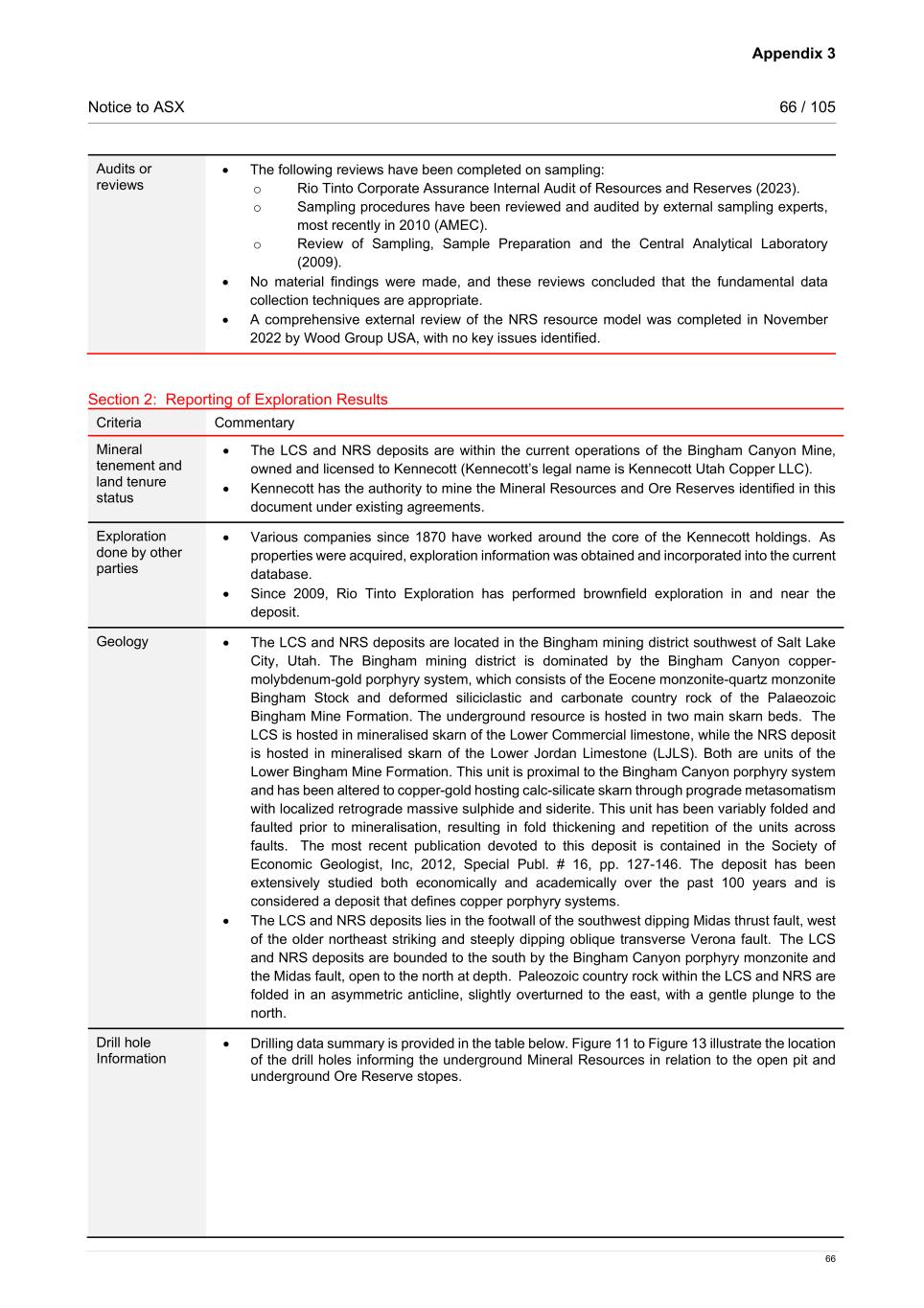 Appendix 3 Notice to ASX 66 / 105 66 Audits or reviews • The following reviews have been completed on sampling: o Rio Tinto Corporate Assurance Internal Audit of Resources and Reserves (2023). o Sampling procedures have been reviewed and audited by external sampling experts, most recently in 2010 (AMEC). o Review of Sampling, Sample Preparation and the Central Analytical Laboratory (2009). • No material findings were made, and these reviews concluded that the fundamental data collection techniques are appropriate. • A comprehensive external review of the NRS resource model was completed in November 2022 by Wood Group USA, with no key issues identified.   Section 2: Reporting of Exploration Results Criteria Commentary Mineral tenement and land tenure status • The LCS and NRS deposits are within the current operations of the Bingham Canyon Mine, owned and licensed to Kennecott (Kennecott’s legal name is Kennecott Utah Copper LLC). • Kennecott has the authority to mine the Mineral Resources and Ore Reserves identified in this document under existing agreements. Exploration done by other parties • Various companies since 1870 have worked around the core of the Kennecott holdings.  As properties were acquired, exploration information was obtained and incorporated into the current database. • Since 2009, Rio Tinto Exploration has performed brownfield exploration in and near the deposit.  Geology • The LCS and NRS deposits are located in the Bingham mining district southwest of Salt Lake City, Utah. The Bingham mining district is dominated by the Bingham Canyon copper- molybdenum-gold porphyry system, which consists of the Eocene monzonite-quartz monzonite Bingham Stock and deformed siliciclastic and carbonate country rock of the Palaeozoic Bingham Mine Formation. The underground resource is hosted in two main skarn beds. The LCS is hosted in mineralised skarn of the Lower Commercial limestone, while the NRS deposit is hosted in mineralised skarn of the Lower Jordan Limestone (LJLS). Both are units of the Lower Bingham Mine Formation. This unit is proximal to the Bingham Canyon porphyry system and has been altered to copper-gold hosting calc-silicate skarn through prograde metasomatism with localized retrograde massive sulphide and siderite. This unit has been variably folded and faulted prior to mineralisation, resulting in fold thickening and repetition of the units across faults.    The most recent publication devoted to this deposit is contained in the Society of Economic Geologist, Inc, 2012, Special Publ. # 16, pp. 127-146. The deposit has been extensively studied both economically and academically over the past 100 years and is considered a deposit that defines copper porphyry systems. • The LCS and NRS deposits lies in the footwall of the southwest dipping Midas thrust fault, west of the older northeast striking and steeply dipping oblique transverse Verona fault.  The LCS and NRS deposits are bounded to the south by the Bingham Canyon porphyry monzonite and the Midas fault, open to the north at depth.  Paleozoic country rock within the LCS and NRS are folded in an asymmetric anticline, slightly overturned to the east, with a gentle plunge to the north.    Drill hole Information • Drilling data summary is provided in the table below. Figure 11 to Figure 13 illustrate the location of the drill holes informing the underground Mineral Resources in relation to the open pit and underground Ore Reserve stopes.