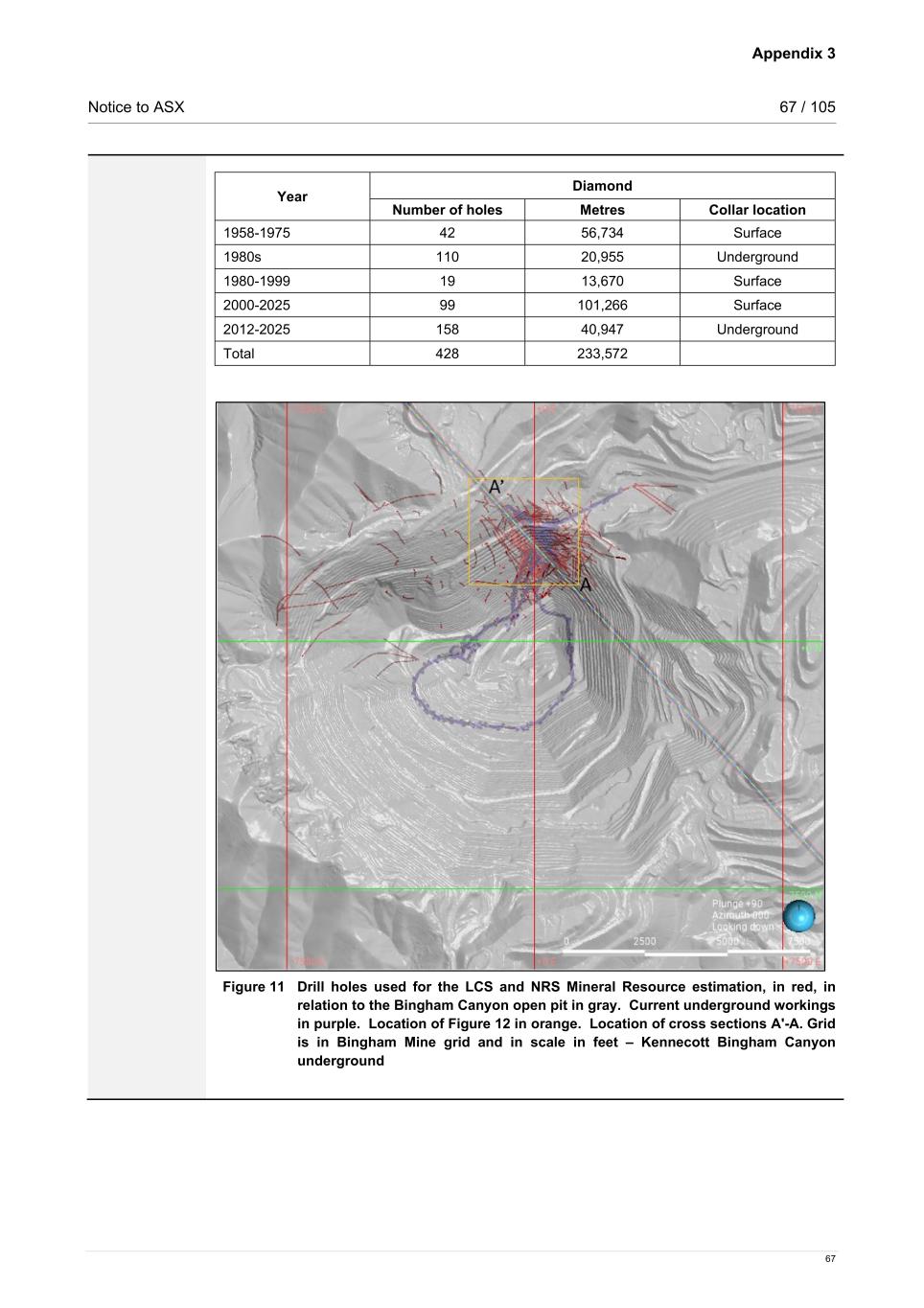 Appendix 3 Notice to ASX 67 / 105 67 Year Diamond Number of holes Metres Collar location 1958-1975 42 56,734 Surface 1980s 110 20,955 Underground 1980-1999 19 13,670 Surface 2000-2025 99 101,266 Surface 2012-2025 158 40,947 Underground Total 428 233,572 Figure 11 Drill holes used for the LCS and NRS Mineral Resource estimation, in red, in relation to the Bingham Canyon open pit in gray. Current underground workings in purple. Location of Figure 12 in orange. Location of cross sections A'-A. Grid is in Bingham Mine grid and in scale in feet – Kennecott Bingham Canyon underground