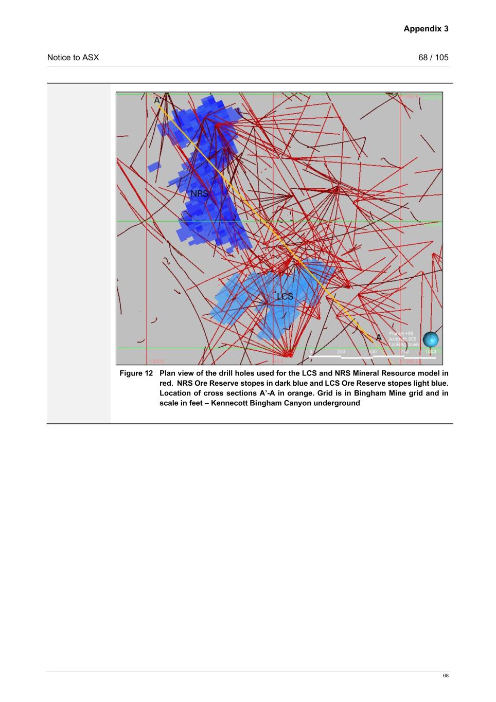 Appendix 3 Notice to ASX 68 / 105 68 Figure 12 Plan view of the drill holes used for the LCS and NRS Mineral Resource model in red. NRS Ore Reserve stopes in dark blue and LCS Ore Reserve stopes light blue. Location of cross sections A’-A in orange. Grid is in Bingham Mine grid and in scale in feet – Kennecott Bingham Canyon underground