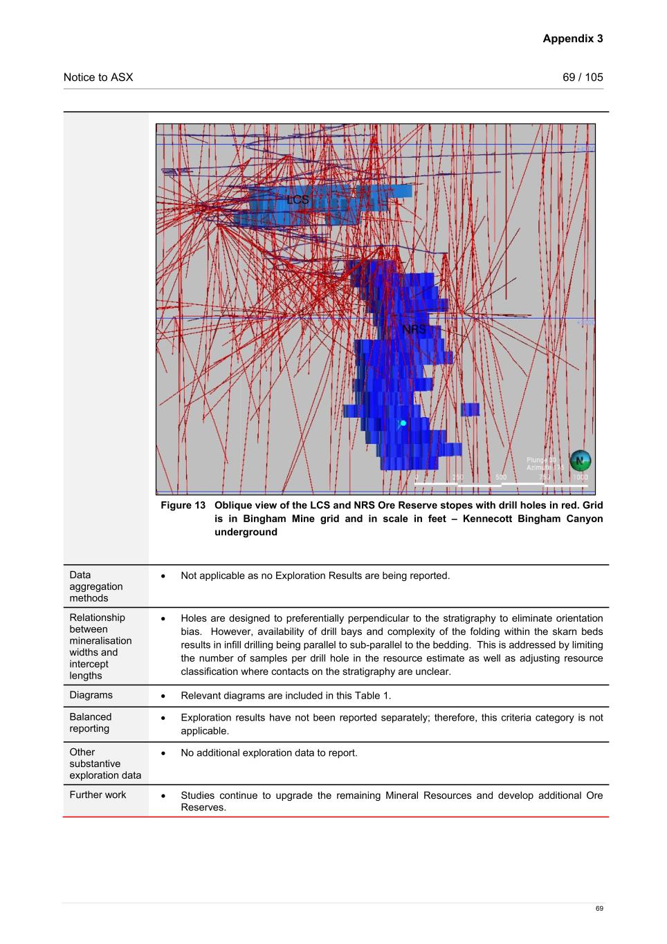 Appendix 3 Notice to ASX 69 / 105 69 Figure 13 Oblique view of the LCS and NRS Ore Reserve stopes with drill holes in red. Grid is in Bingham Mine grid and in scale in feet – Kennecott Bingham Canyon underground Data aggregation methods • Not applicable as no Exploration Results are being reported.   Relationship between mineralisation widths and intercept lengths • Holes are designed to preferentially perpendicular to the stratigraphy to eliminate orientation bias. However, availability of drill bays and complexity of the folding within the skarn beds results in infill drilling being parallel to sub-parallel to the bedding. This is addressed by limiting the number of samples per drill hole in the resource estimate as well as adjusting resource classification where contacts on the stratigraphy are unclear. Diagrams • Relevant diagrams are included in this Table 1. Balanced reporting • Exploration results have not been reported separately; therefore, this criteria category is not applicable.  Other substantive exploration data • No additional exploration data to report.   Further work • Studies continue to upgrade the remaining Mineral Resources and develop additional Ore Reserves.