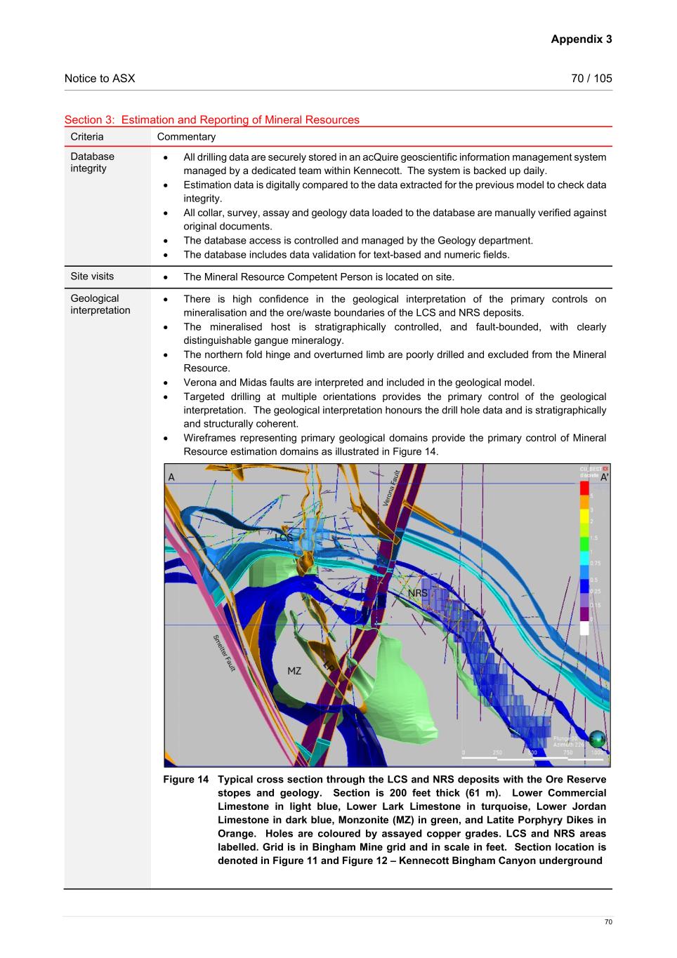 Appendix 3 Notice to ASX 70 / 105 70 Section 3: Estimation and Reporting of Mineral Resources Criteria Commentary Database integrity • All drilling data are securely stored in an acQuire geoscientific information management system managed by a dedicated team within Kennecott.  The system is backed up daily. • Estimation data is digitally compared to the data extracted for the previous model to check data integrity.  • All collar, survey, assay and geology data loaded to the database are manually verified against original documents. • The database access is controlled and managed by the Geology department. • The database includes data validation for text-based and numeric fields.    Site visits • The Mineral Resource Competent Person is located on site.  Geological interpretation • There is high confidence in the geological interpretation of the primary controls on mineralisation and the ore/waste boundaries of the LCS and NRS deposits.   • The mineralised host is stratigraphically controlled, and fault-bounded, with clearly distinguishable gangue mineralogy.    • The northern fold hinge and overturned limb are poorly drilled and excluded from the Mineral Resource.   • Verona and Midas faults are interpreted and included in the geological model. • Targeted drilling at multiple orientations provides the primary control of the geological interpretation.   The geological interpretation honours the drill hole data and is stratigraphically and structurally coherent.  • Wireframes representing primary geological domains provide the primary control of Mineral Resource estimation domains as illustrated in Figure 14.   Figure 14 Typical cross section through the LCS and NRS deposits with the Ore Reserve stopes and geology. Section is 200 feet thick (61 m). Lower Commercial Limestone in light blue, Lower Lark Limestone in turquoise, Lower Jordan Limestone in dark blue, Monzonite (MZ) in green, and Latite Porphyry Dikes in Orange. Holes are coloured by assayed copper grades. LCS and NRS areas labelled. Grid is in Bingham Mine grid and in scale in feet. Section location is denoted in Figure 11 and Figure 12 – Kennecott Bingham Canyon underground