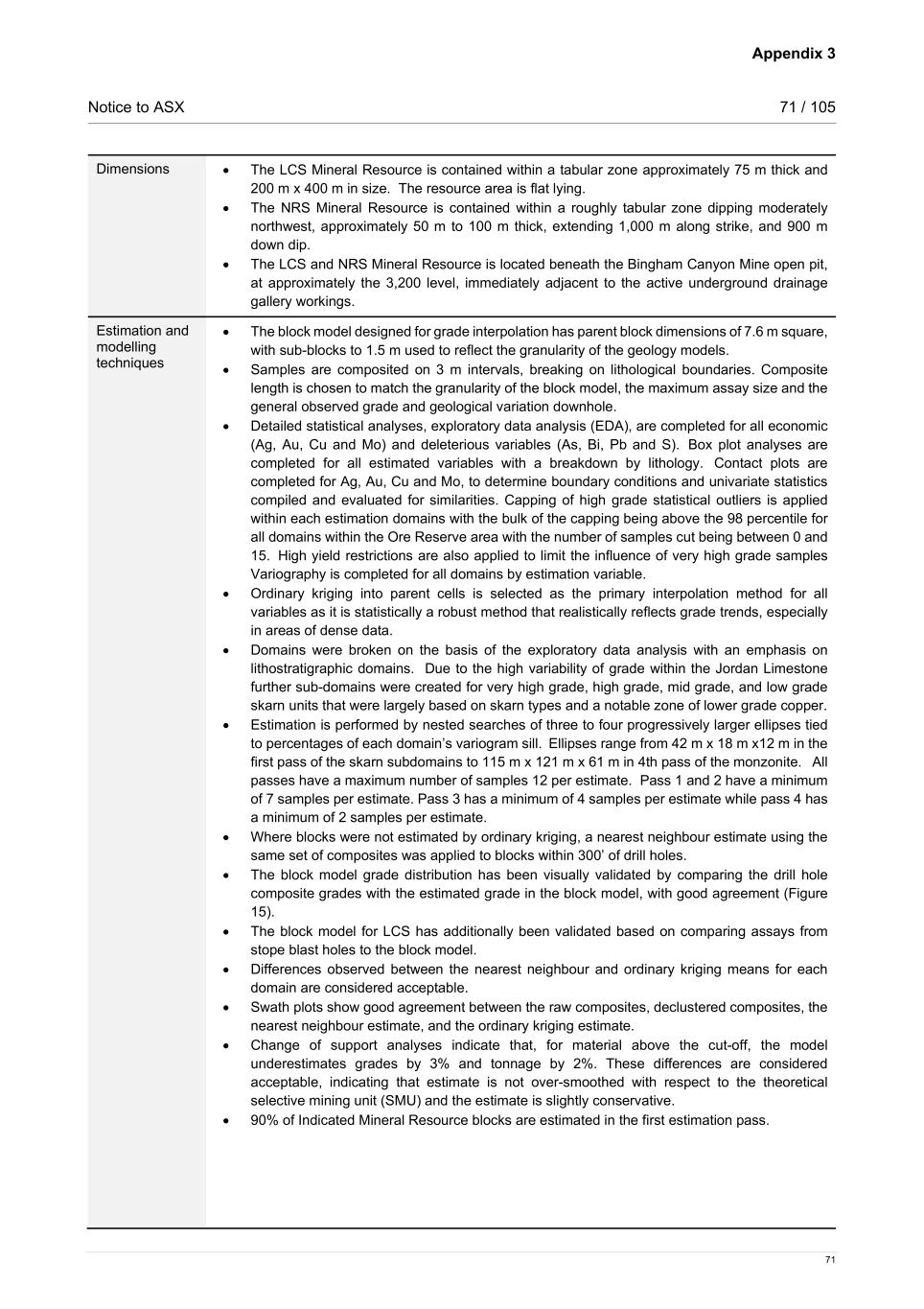 Appendix 3 Notice to ASX 71 / 105 71 Dimensions • The LCS Mineral Resource is contained within a tabular zone approximately 75 m thick and 200 m x 400 m in size. The resource area is flat lying. • The NRS Mineral Resource is contained within a roughly tabular zone dipping moderately northwest, approximately 50 m to 100 m thick, extending 1,000 m along strike, and 900 m down dip.   • The LCS and NRS Mineral Resource is located beneath the Bingham Canyon Mine open pit, at approximately the 3,200 level, immediately adjacent to the active underground drainage gallery workings.   Estimation and modelling techniques • The block model designed for grade interpolation has parent block dimensions of 7.6 m square, with sub-blocks to 1.5 m used to reflect the granularity of the geology models.    • Samples are composited on 3 m intervals, breaking on lithological boundaries. Composite length is chosen to match the granularity of the block model, the maximum assay size and the general observed grade and geological variation downhole.  • Detailed statistical analyses, exploratory data analysis (EDA), are completed for all economic (Ag, Au, Cu and Mo) and deleterious variables (As, Bi, Pb and S).  Box plot analyses are completed for all estimated variables with a breakdown by lithology.  Contact plots are completed for Ag, Au, Cu and Mo, to determine boundary conditions and univariate statistics compiled and evaluated for similarities.  Capping of high grade statistical outliers is applied within each estimation domains with the bulk of the capping being above the 98 percentile for all domains within the Ore Reserve area with the number of samples cut being between 0 and 15. High yield restrictions are also applied to limit the influence of very high grade samples Variography is completed for all domains by estimation variable.   • Ordinary kriging into parent cells is selected as the primary interpolation method for all variables as it is statistically a robust method that realistically reflects grade trends, especially in areas of dense data. • Domains were broken on the basis of the exploratory data analysis with an emphasis on lithostratigraphic domains. Due to the high variability of grade within the Jordan Limestone further sub-domains were created for very high grade, high grade, mid grade, and low grade skarn units that were largely based on skarn types and a notable zone of lower grade copper. • Estimation is performed by nested searches of three to four progressively larger ellipses tied to percentages of each domain’s variogram sill.  Ellipses range from 42 m x 18 m x12 m in the first pass of the skarn subdomains to 115 m x 121 m x 61 m in 4th pass of the monzonite.   All passes have a maximum number of samples 12 per estimate. Pass 1 and 2 have a minimum of 7 samples per estimate. Pass 3 has a minimum of 4 samples per estimate while pass 4 has a minimum of 2 samples per estimate. • Where blocks were not estimated by ordinary kriging, a nearest neighbour estimate using the same set of composites was applied to blocks within 300’ of drill holes. • The block model grade distribution has been visually validated by comparing the drill hole composite grades with the estimated grade in the block model, with good agreement (Figure 15). • The block model for LCS has additionally been validated based on comparing assays from stope blast holes to the block model. • Differences observed between the nearest neighbour and ordinary kriging means for each domain are considered acceptable.  • Swath plots show good agreement between the raw composites, declustered composites, the nearest neighbour estimate, and the ordinary kriging estimate.  • Change of support analyses indicate that, for material above the cut-off, the model underestimates grades by 3% and tonnage by 2%. These differences are considered acceptable, indicating that estimate is not over-smoothed with respect to the theoretical selective mining unit (SMU) and the estimate is slightly conservative.  • 90% of Indicated Mineral Resource blocks are estimated in the first estimation pass.