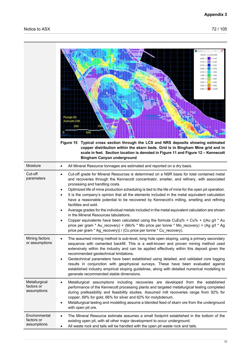 Appendix 3 Notice to ASX 72 / 105 72 Figure 15 Typical cross section through the LCS and NRS deposits showing estimated copper distribution within the skarn beds. Grid is in Bingham Mine grid and in scale in feet. Section location is denoted in Figure 11 and Figure 12 – Kennecott Bingham Canyon underground Moisture • All Mineral Resource tonnages are estimated and reported on a dry basis.  Cut-off parameters • Cut-off grade for Mineral Resources is determined on a NSR basis for total contained metal and recoveries through the Kennecott concentrator, smelter, and refinery, with associated processing and handling costs.    • Optimized life of mine production scheduling is tied to the life of mine for the open pit operation. • It is the company’s opinion that all the elements included in the metal equivalent calculation have a reasonable potential to be recovered by Kennecott’s milling, smelting and refining facilities and sold. • Average grades for the individual metals included in the metal equivalent calculation are shown in the Mineral Resources tabulations. • Copper equivalents have been calculated using the formula CuEq% = Cu% + ((Au g/t * Au price per gram * Au_recovery) + (Mo% * Mo price per tonne * Mo_recovery) + (Ag g/t * Ag price per gram * Ag_recovery)) / (Cu price per tonne * Cu_recovery). Mining factors or assumptions • The assumed mining method is sub-level, long hole open stoping, using a primary secondary sequence with cemented backfill. This is a well-known and proven mining method used extensively within the industry and can be applied effectively within this deposit given the recommended geotechnical limitations.  • Geotechnical parameters have been established using detailed, and validated core logging results in conjunction with geophysical surveys. These have been evaluated against established industry empirical stoping guidelines, along with detailed numerical modelling to generate recommended stable dimensions.  Metallurgical factors or assumptions • Metallurgical assumptions including recoveries are developed from the established performance of the Kennecott processing plants and targeted metallurgical testing completed during prefeasibility and feasibility studies. Assumed mill recoveries range from 92% for copper, 69% for gold, 66% for silver and 62% for molybdenum.   • Metallurgical testing and modelling assume a blended feed of skarn ore from the underground with open pit ore.   Environmental factors or assumptions • The Mineral Resource estimate assumes a small footprint established in the bottom of the existing open pit, with all other major development to occur underground.   • All waste rock and tails will be handled with the open pit waste rock and tails.